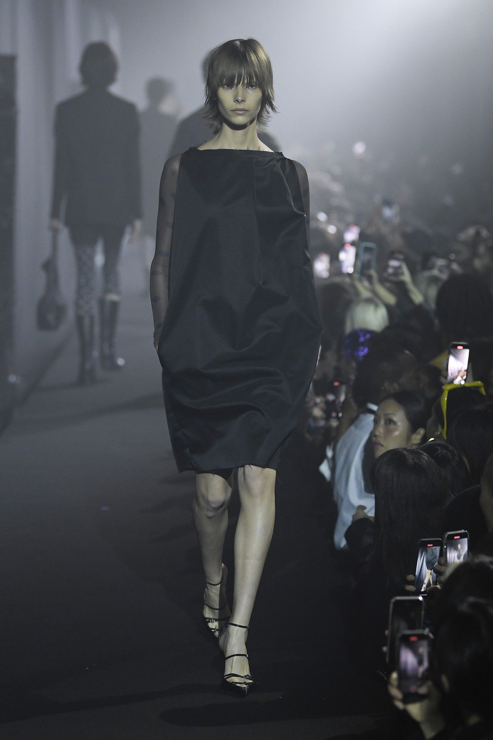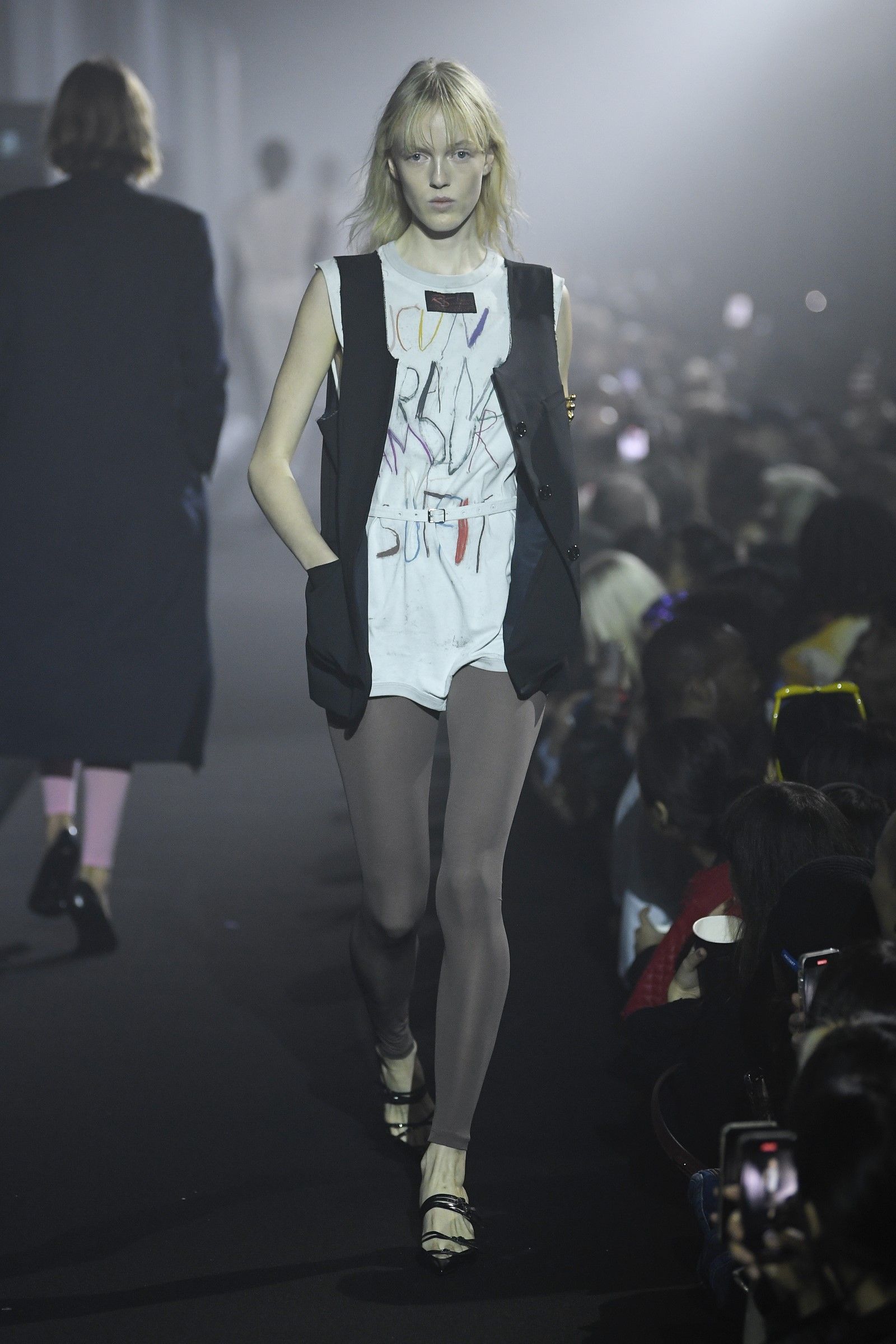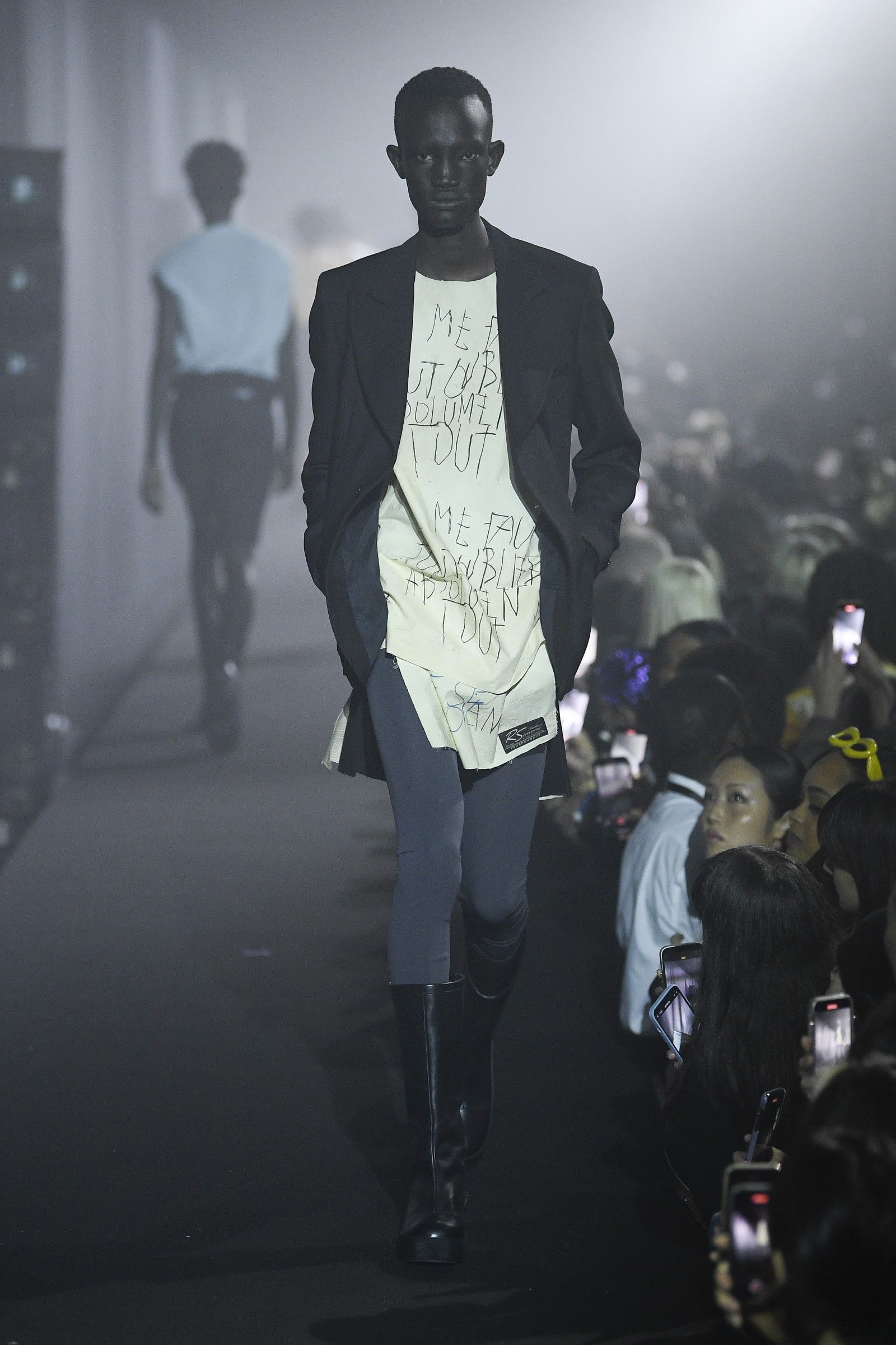 For his return to the catwalks after last February's FW22 digital show, Raf Simons chose London's famous Printworks club where the audience, left standing, watched as models plowed a very narrow catwalk to the ominous rhythm of pounding techno music. The catwalk, so cramped that in the finale the models' shoulders brushed against each other moving in opposite directions, seemed to be a metaphor for a collection that has dried and shrunk the brand's aesthetic to the point of improbability, eliminating its layered, studiously chaotic citationism and replacing it with a work of simplification whose final outcomes, on the clothes, became almost surreal. The theme of reduction was most overtly manifested in the way blazers and shirts were cut down, transforming into sleeveless, undershirts or tank tops with sharp hems - all elements of a hyper-thin layering that preferred to fit the body rather than covering it or changing its silhouette as, for example, the monumental sweaters and coats of past collections did. Elsewhere, tops decorated by the hand lettering of Belgian artist Philippe Vandenberg, the author of rough and tortured works that tell of the human condition with dry brutality, were like crude panels of cloth transformed into tops and long dresses with pure lines.