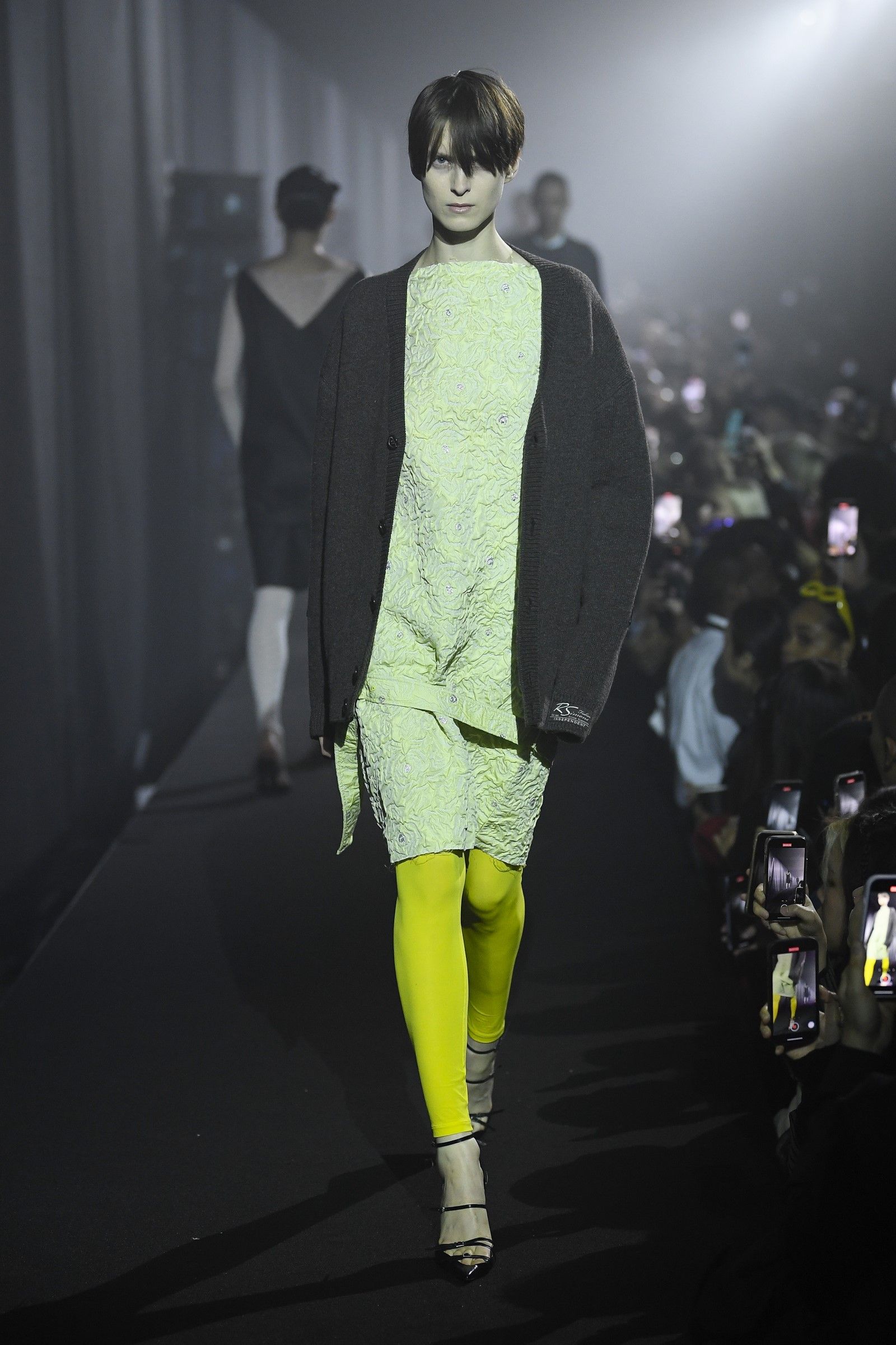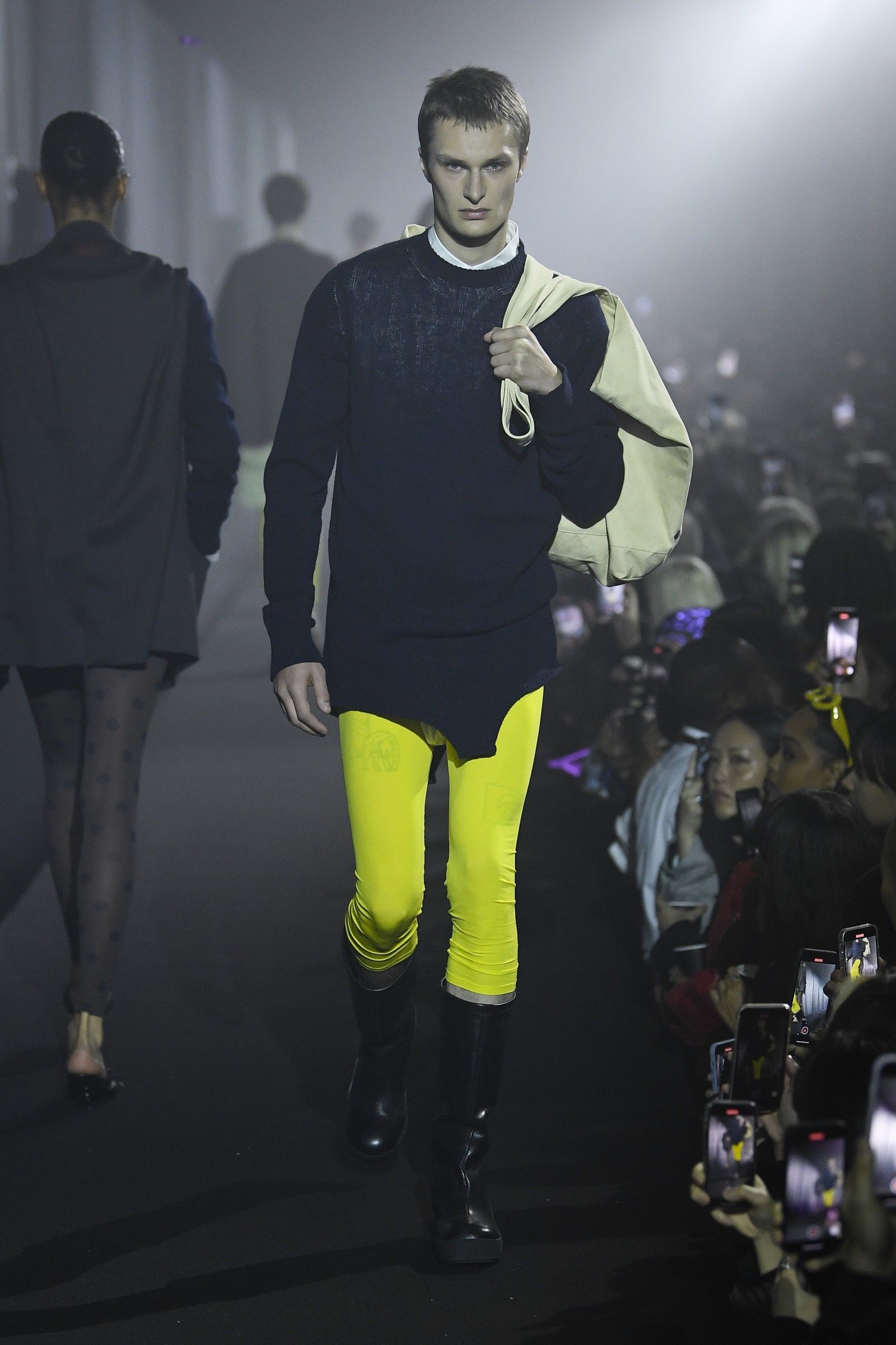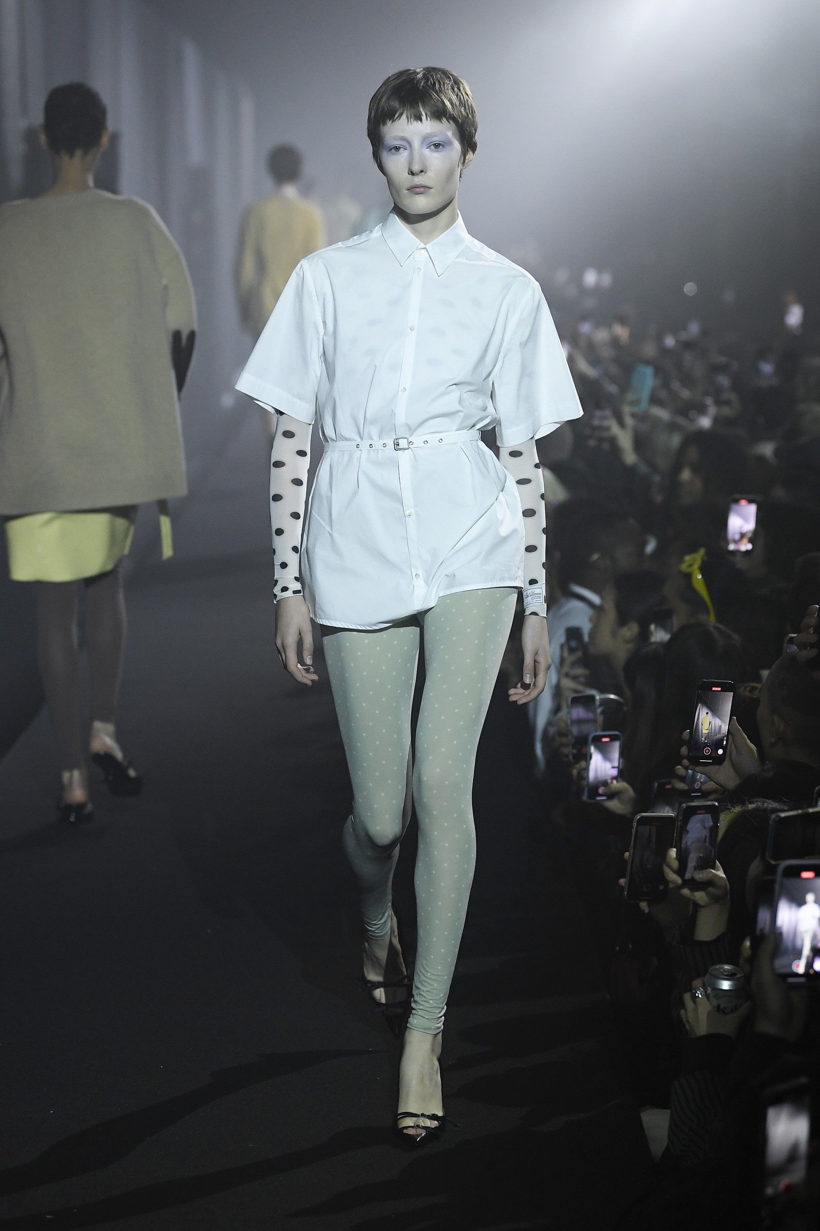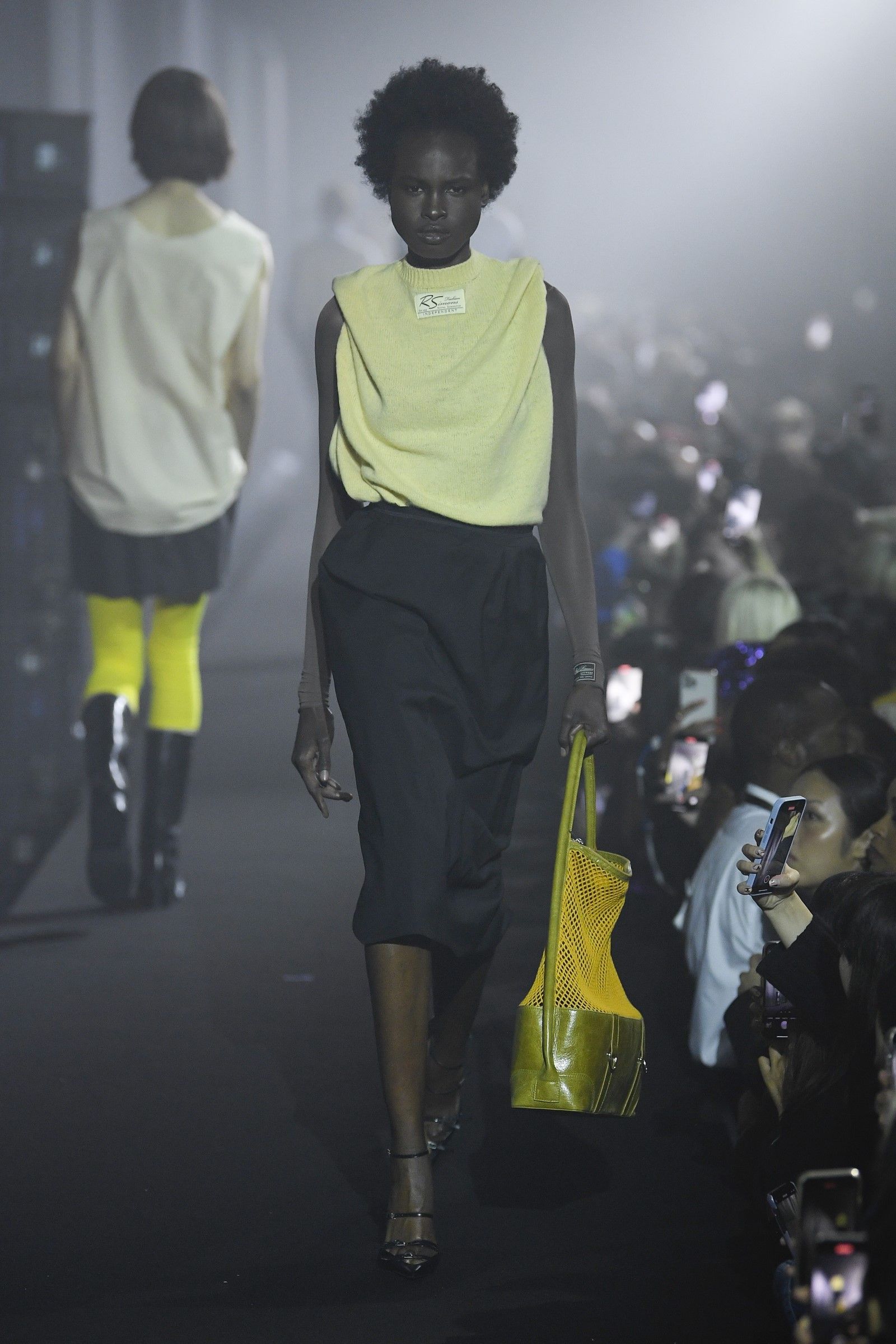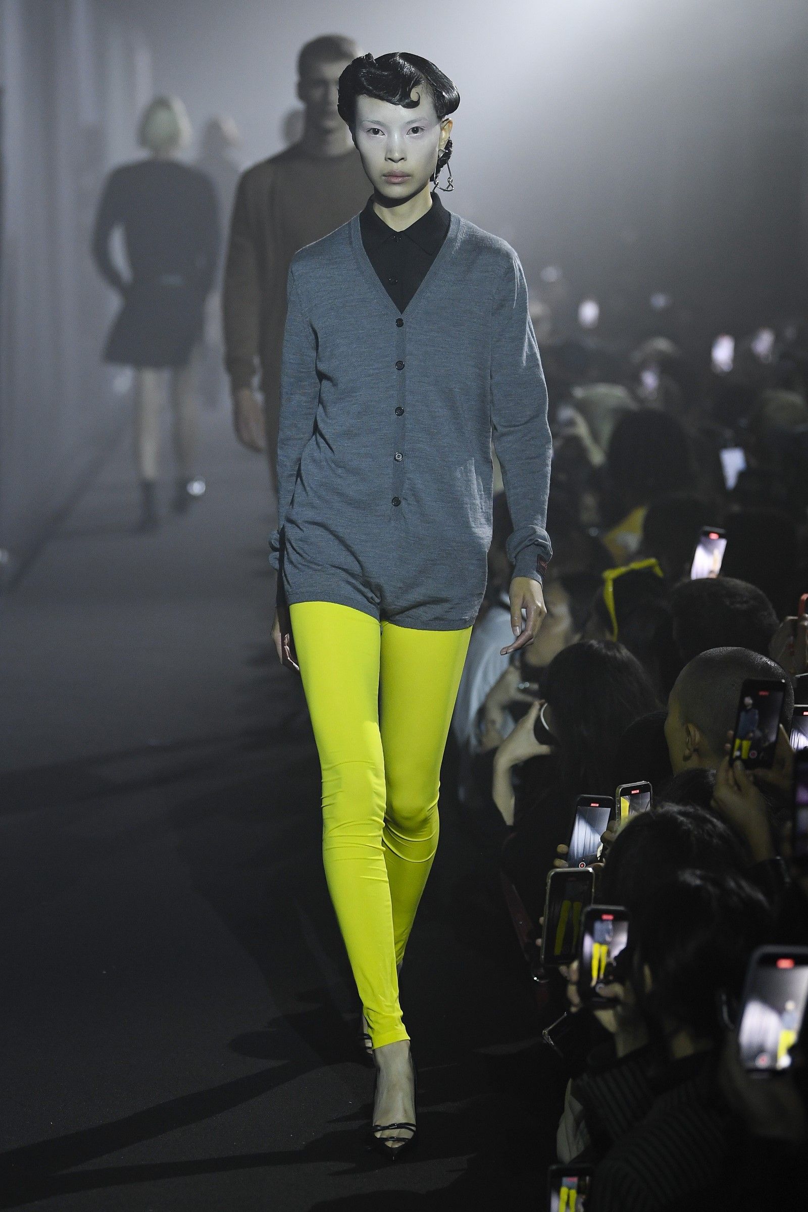 The insistent presence of leggings that replace pants in many instances recall a club culture daughter of that 2000s indie sleaze that, through Simons' alienating and nostalgic lens, further simplifies and minimizes looks. And while the combination of leggings and mesh tops recalls the party uniform of Y2K club culture, with the neon colors winking at the rave world; on the other, an anarchic sense of bon ton emerges in the overlap of shirt and wool sweater that, at the bottom hem, extends into a flap of wool reminiscent of an unfastened bodysuit - later, sleeveless sweaters appear to be worn inside out and backwards, with the Raf Simons label sitting just below the collar on the front. The collection, which opens with three skimpy, semi-transparent looks, then closes with the severity and dryness of gray wool coats and suits, beneath which, beyond the leggings, naked bodies can be perceived - these are the two sides of the radical simplicity sought by Simons: on the one hand, the anarchy of extreme reduction of clothes to second skin and color, on the other, the almost abstract dryness of a tradition beneath which a life can be felt pulsing.