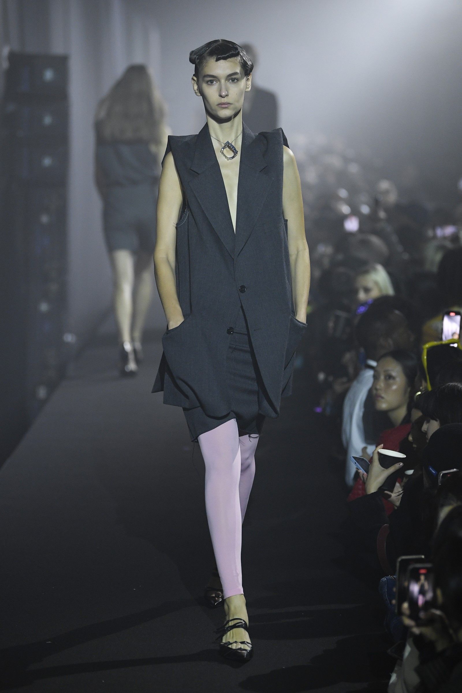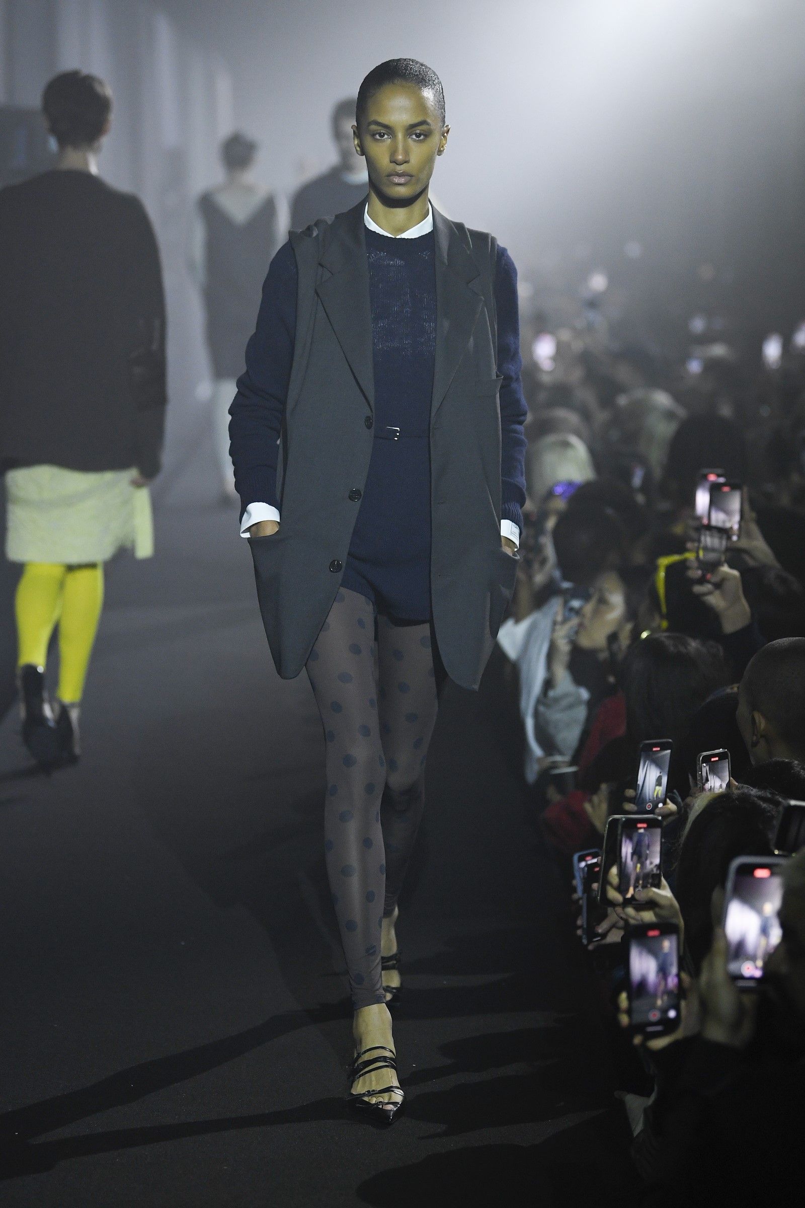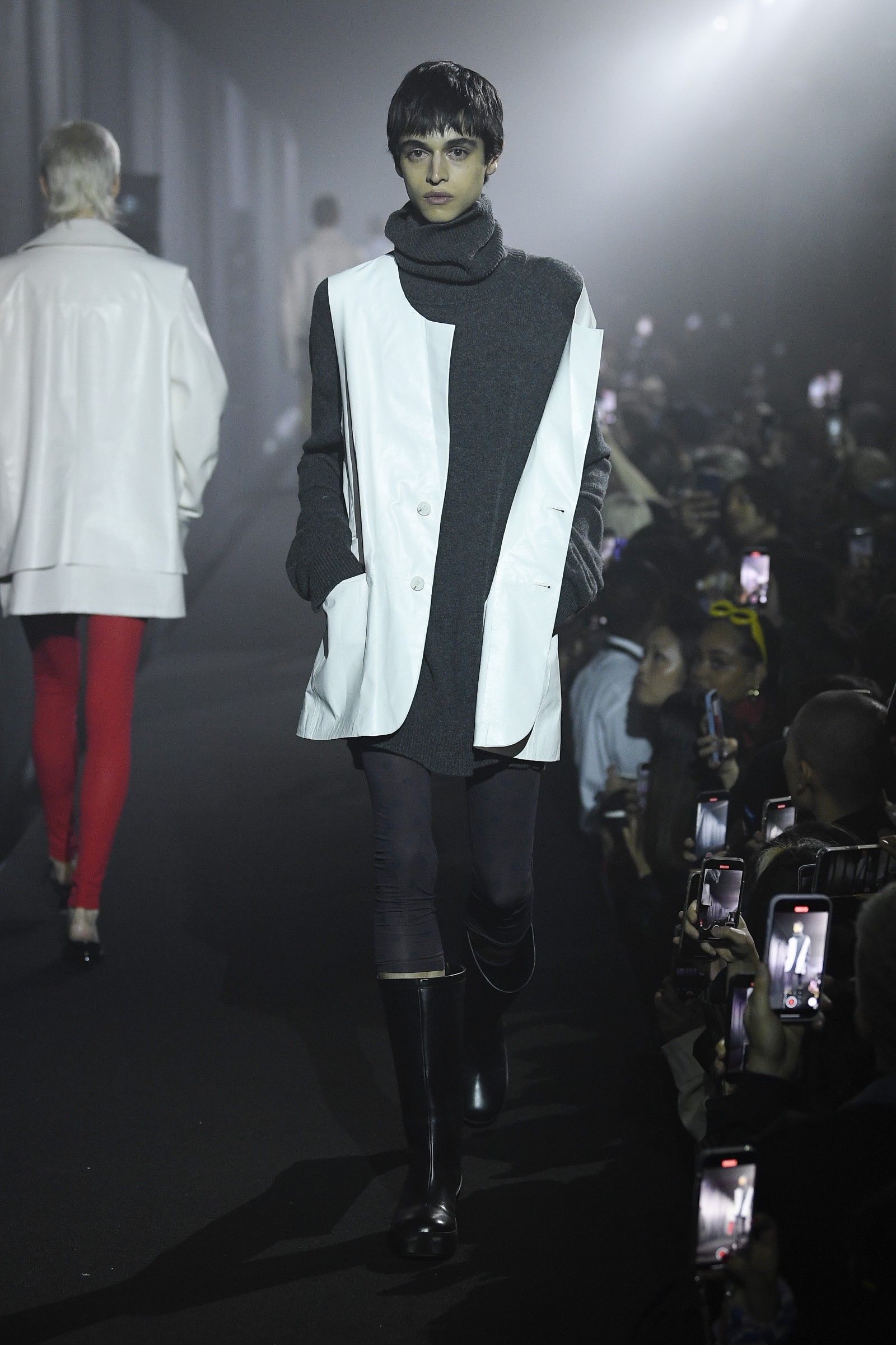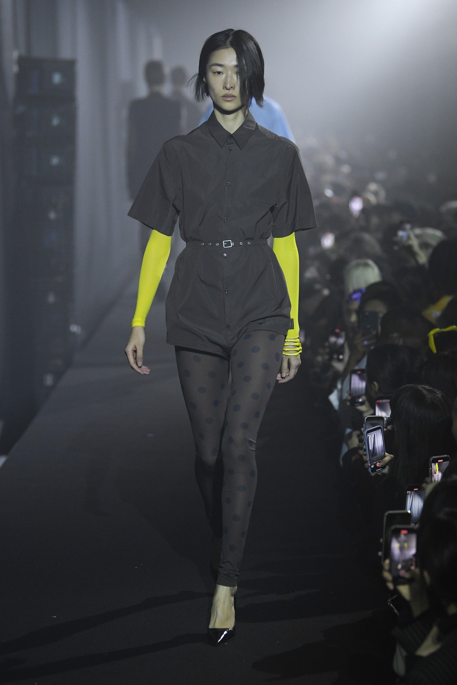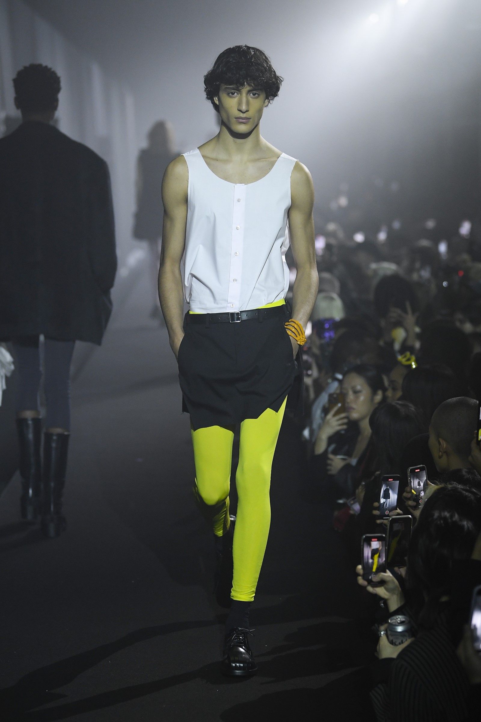 The insistent presence of leggings that replace pants in many instances recall a club culture daughter of that 2000s indie sleaze that, through Simons' alienating and nostalgic lens, further simplifies and minimizes looks. And while the combination of leggings and mesh tops recalls the party uniform of Y2K club culture, with the neon colors winking at the rave world; on the other, an anarchic sense of bon ton emerges in the overlap of shirt and wool sweater that, at the bottom hem, extends into a flap of wool reminiscent of an unfastened bodysuit - later, sleeveless sweaters appear to be worn inside out and backwards, with the Raf Simons label sitting just below the collar on the front. The collection, which opens with three skimpy, semi-transparent looks, then closes with the severity and dryness of gray wool coats and suits, beneath which, beyond the leggings, naked bodies can be perceived - these are the two sides of the radical simplicity sought by Simons: on the one hand, the anarchy of extreme reduction of clothes to second skin and color, on the other, the almost abstract dryness of a tradition beneath which a life can be felt pulsing.