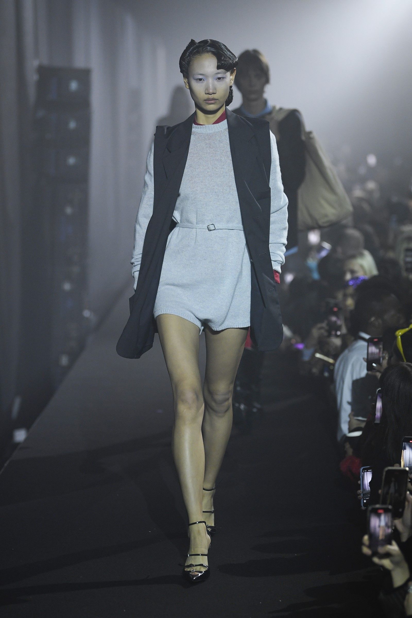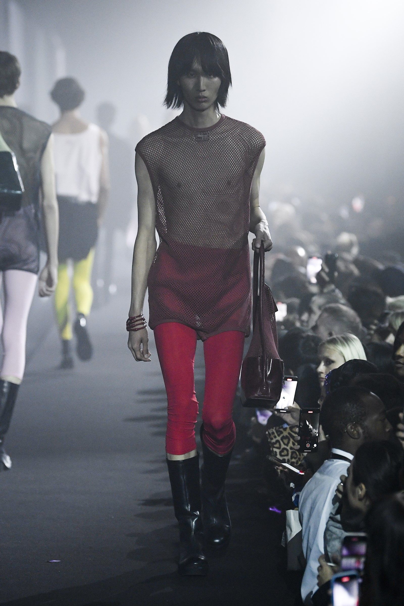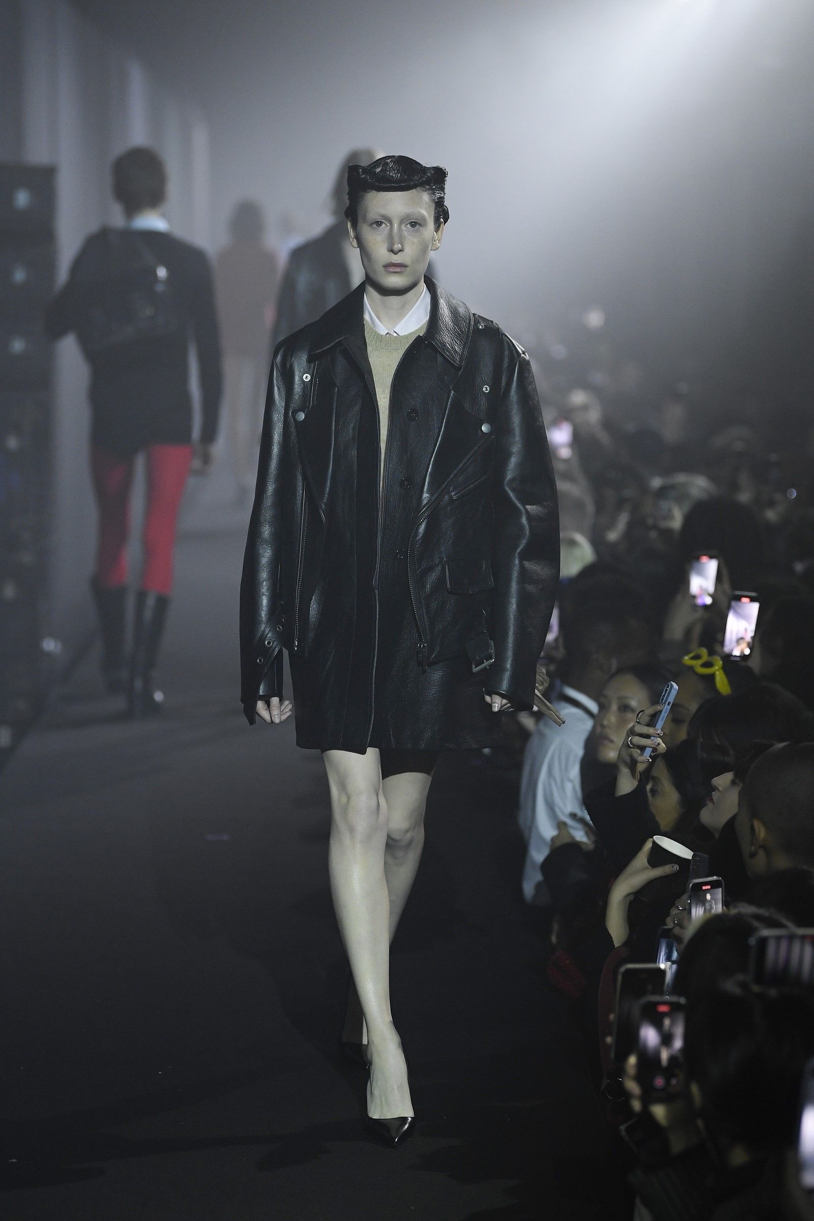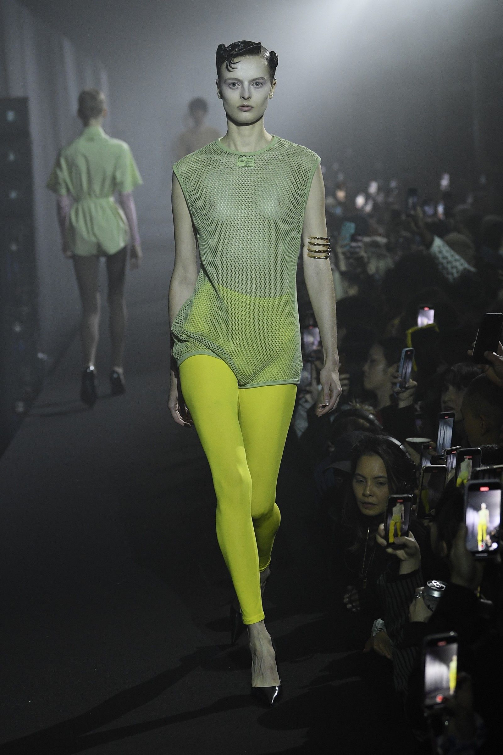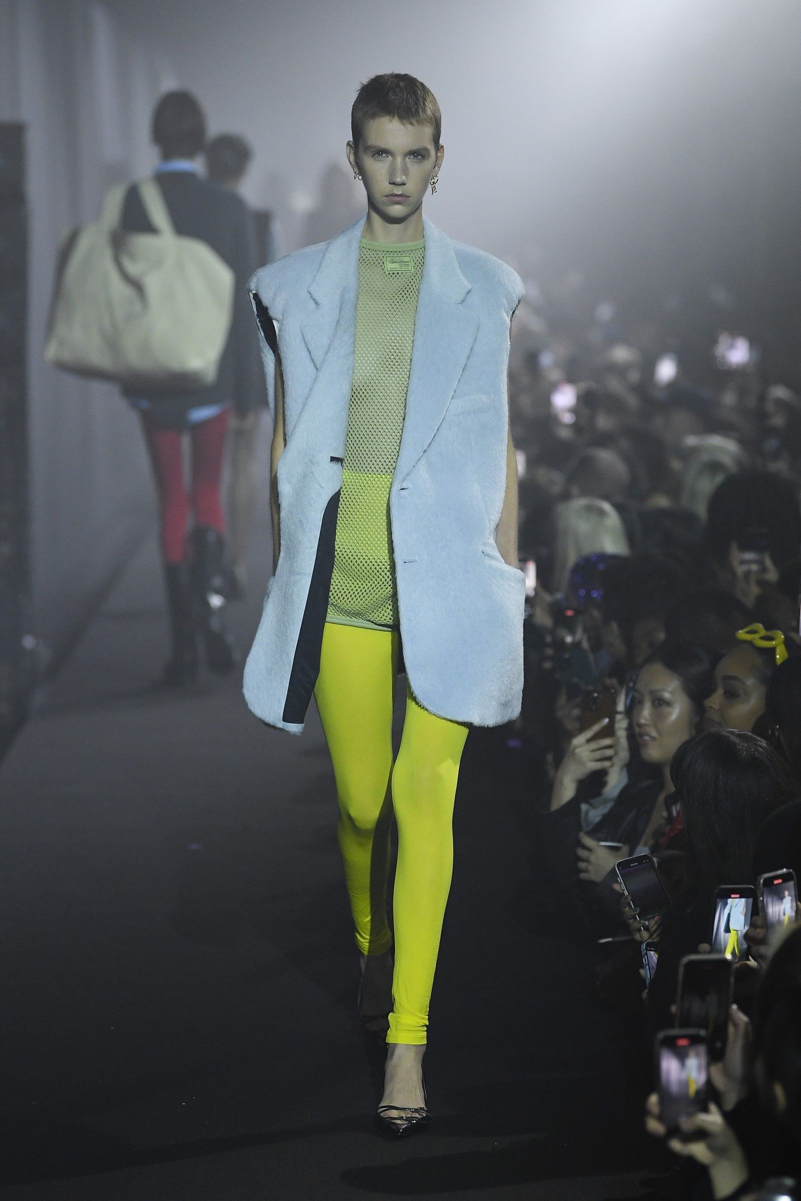 The insistent presence of leggings that replace pants in many instances recall a club culture daughter of that 2000s indie sleaze that, through Simons' alienating and nostalgic lens, further simplifies and minimizes looks. And while the combination of leggings and mesh tops recalls the party uniform of Y2K club culture, with the neon colors winking at the rave world; on the other, an anarchic sense of bon ton emerges in the overlap of shirt and wool sweater that, at the bottom hem, extends into a flap of wool reminiscent of an unfastened bodysuit - later, sleeveless sweaters appear to be worn inside out and backwards, with the Raf Simons label sitting just below the collar on the front. The collection, which opens with three skimpy, semi-transparent looks, then closes with the severity and dryness of gray wool coats and suits, beneath which, beyond the leggings, naked bodies can be perceived - these are the two sides of the radical simplicity sought by Simons: on the one hand, the anarchy of extreme reduction of clothes to second skin and color, on the other, the almost abstract dryness of a tradition beneath which a life can be felt pulsing.