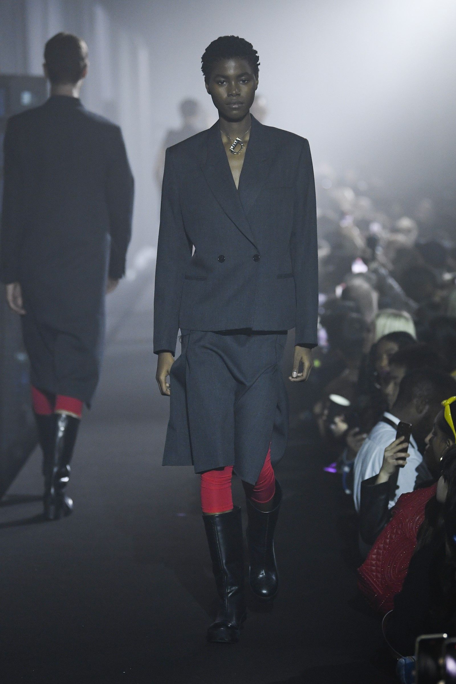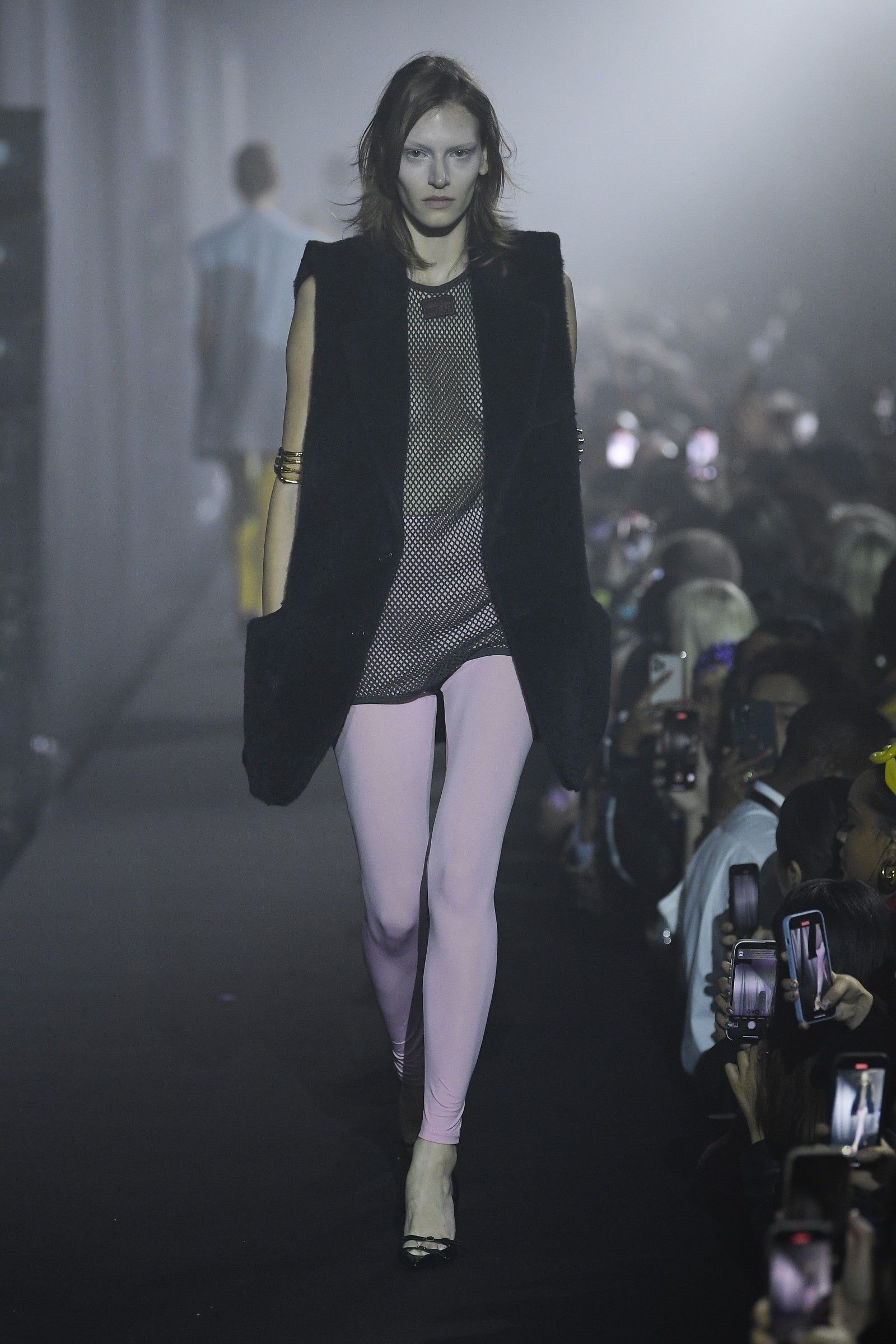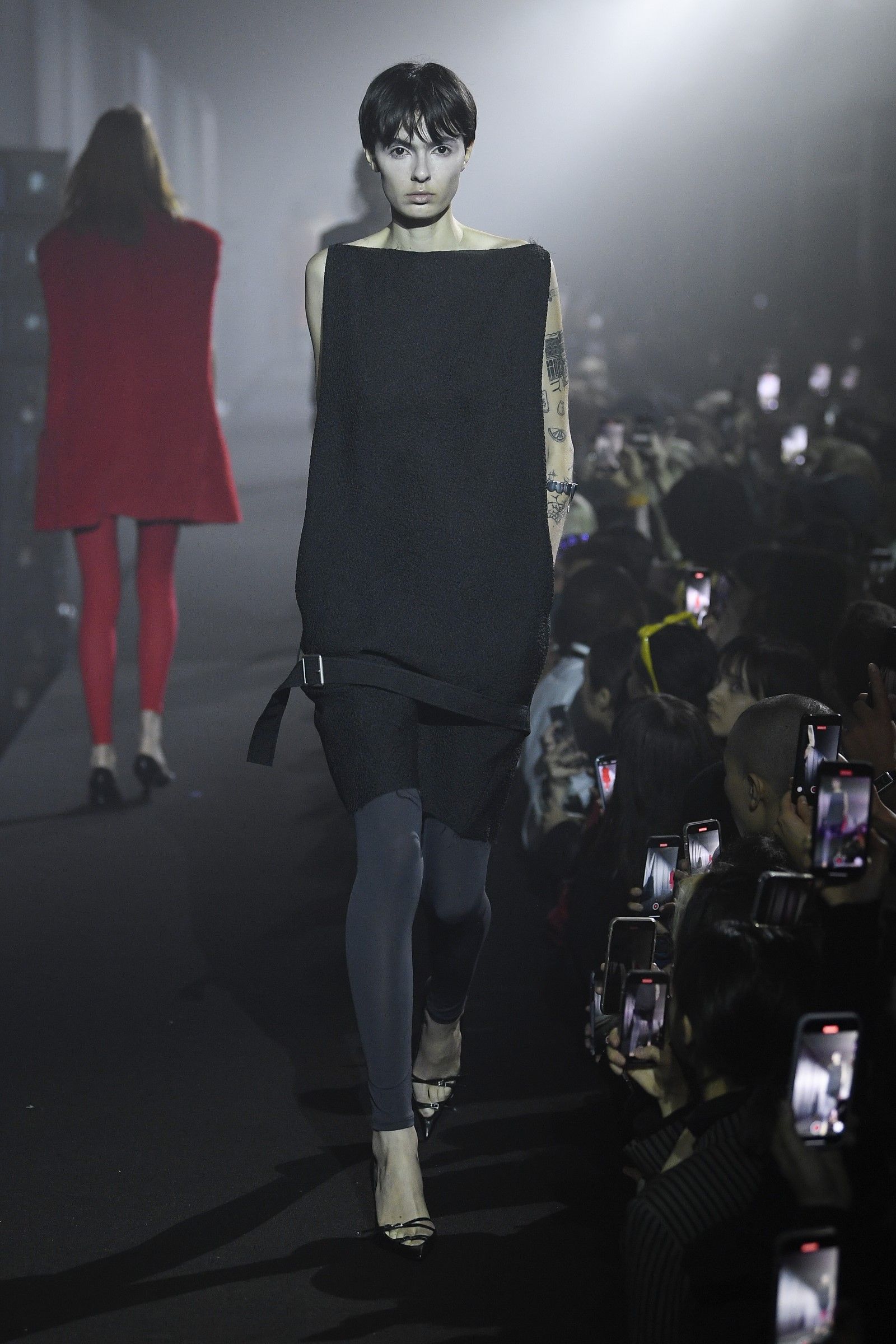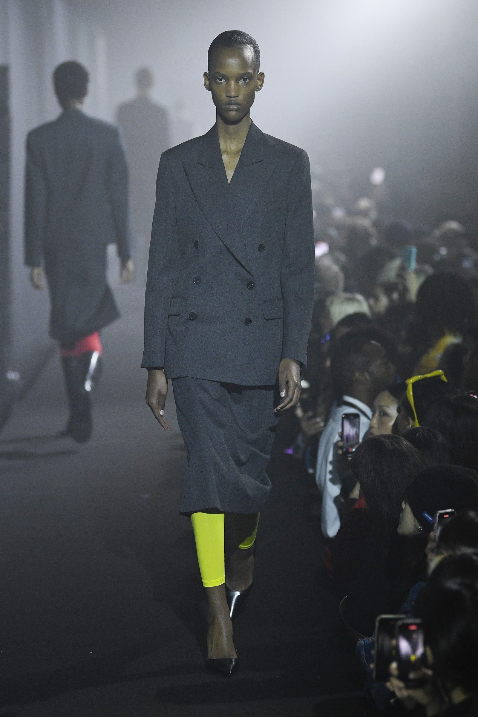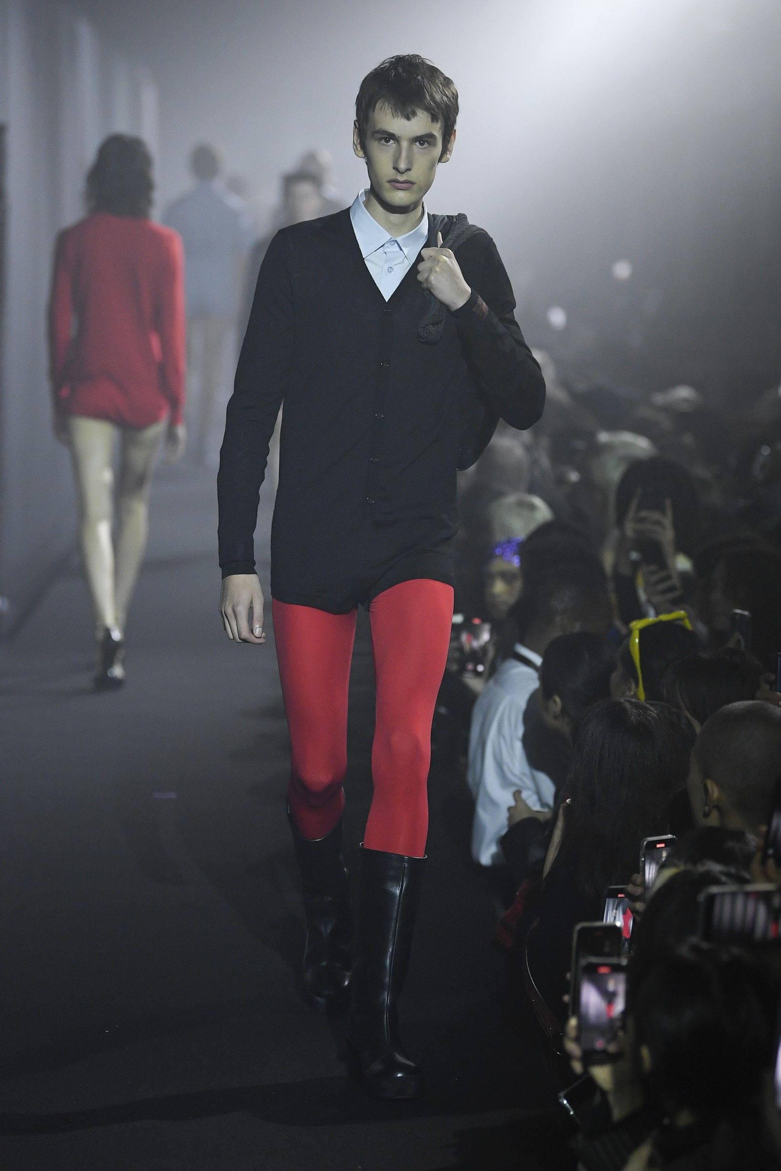 The insistent presence of leggings that replace pants in many instances recall a club culture daughter of that 2000s indie sleaze that, through Simons' alienating and nostalgic lens, further simplifies and minimizes looks. And while the combination of leggings and mesh tops recalls the party uniform of Y2K club culture, with the neon colors winking at the rave world; on the other, an anarchic sense of bon ton emerges in the overlap of shirt and wool sweater that, at the bottom hem, extends into a flap of wool reminiscent of an unfastened bodysuit - later, sleeveless sweaters appear to be worn inside out and backwards, with the Raf Simons label sitting just below the collar on the front. The collection, which opens with three skimpy, semi-transparent looks, then closes with the severity and dryness of gray wool coats and suits, beneath which, beyond the leggings, naked bodies can be perceived - these are the two sides of the radical simplicity sought by Simons: on the one hand, the anarchy of extreme reduction of clothes to second skin and color, on the other, the almost abstract dryness of a tradition beneath which a life can be felt pulsing.