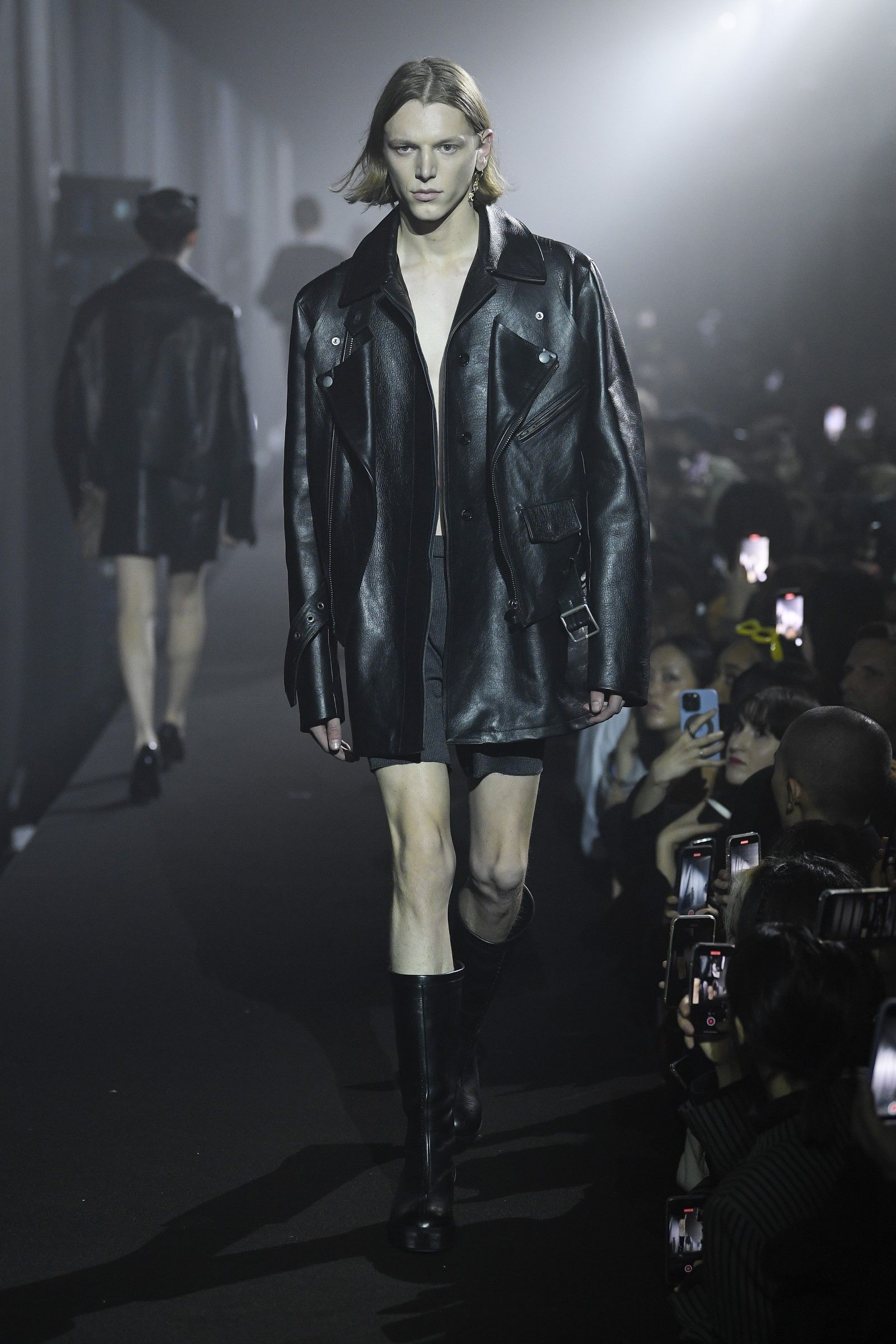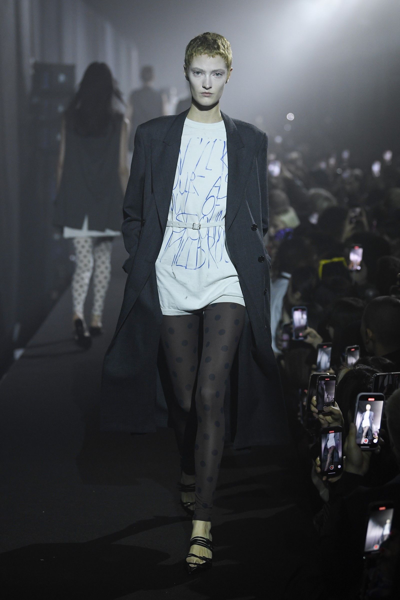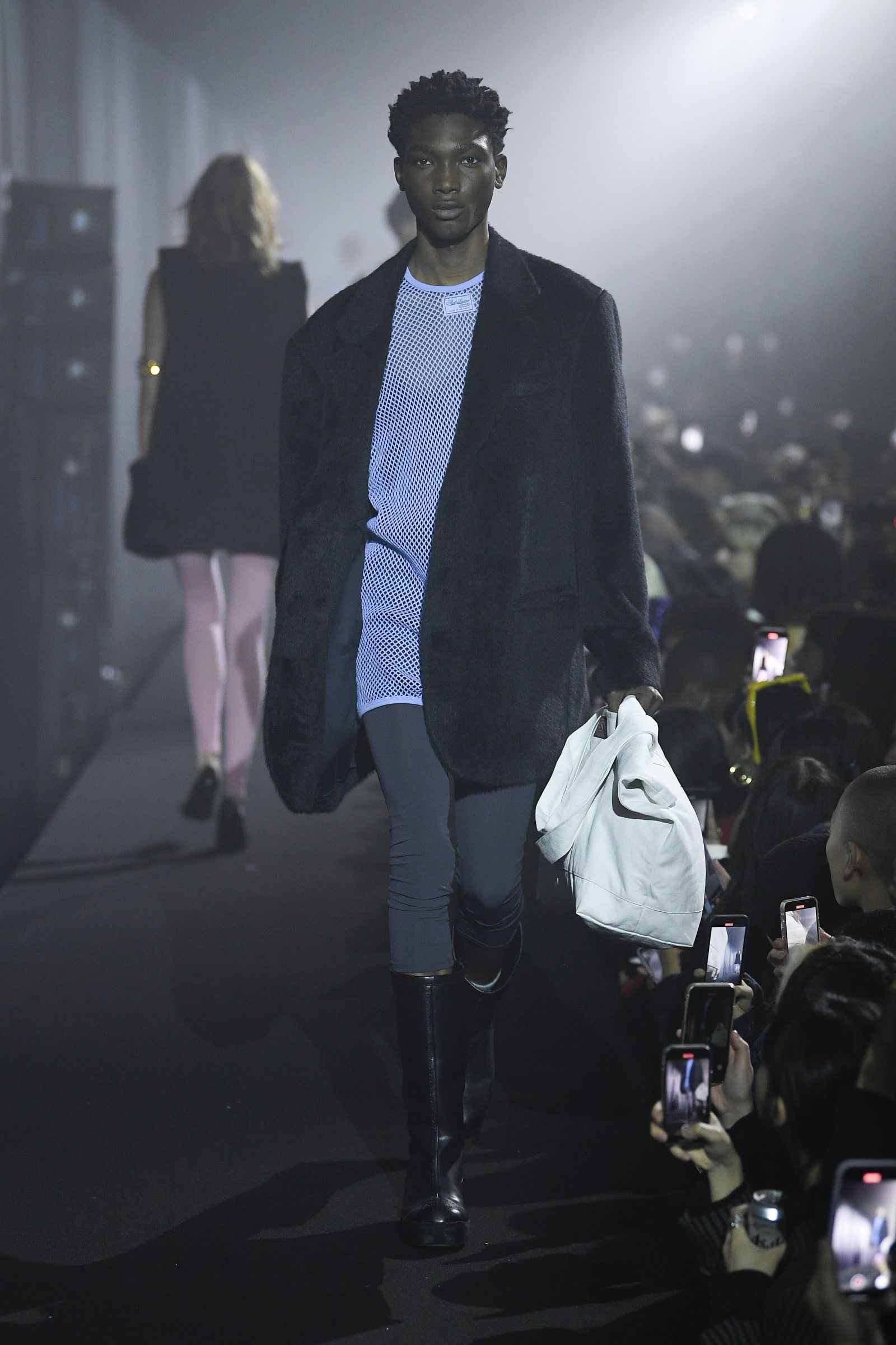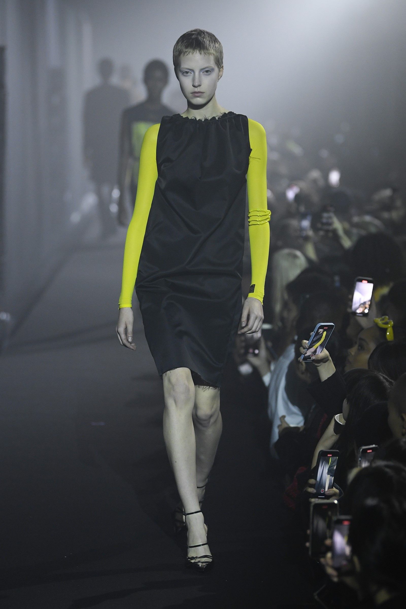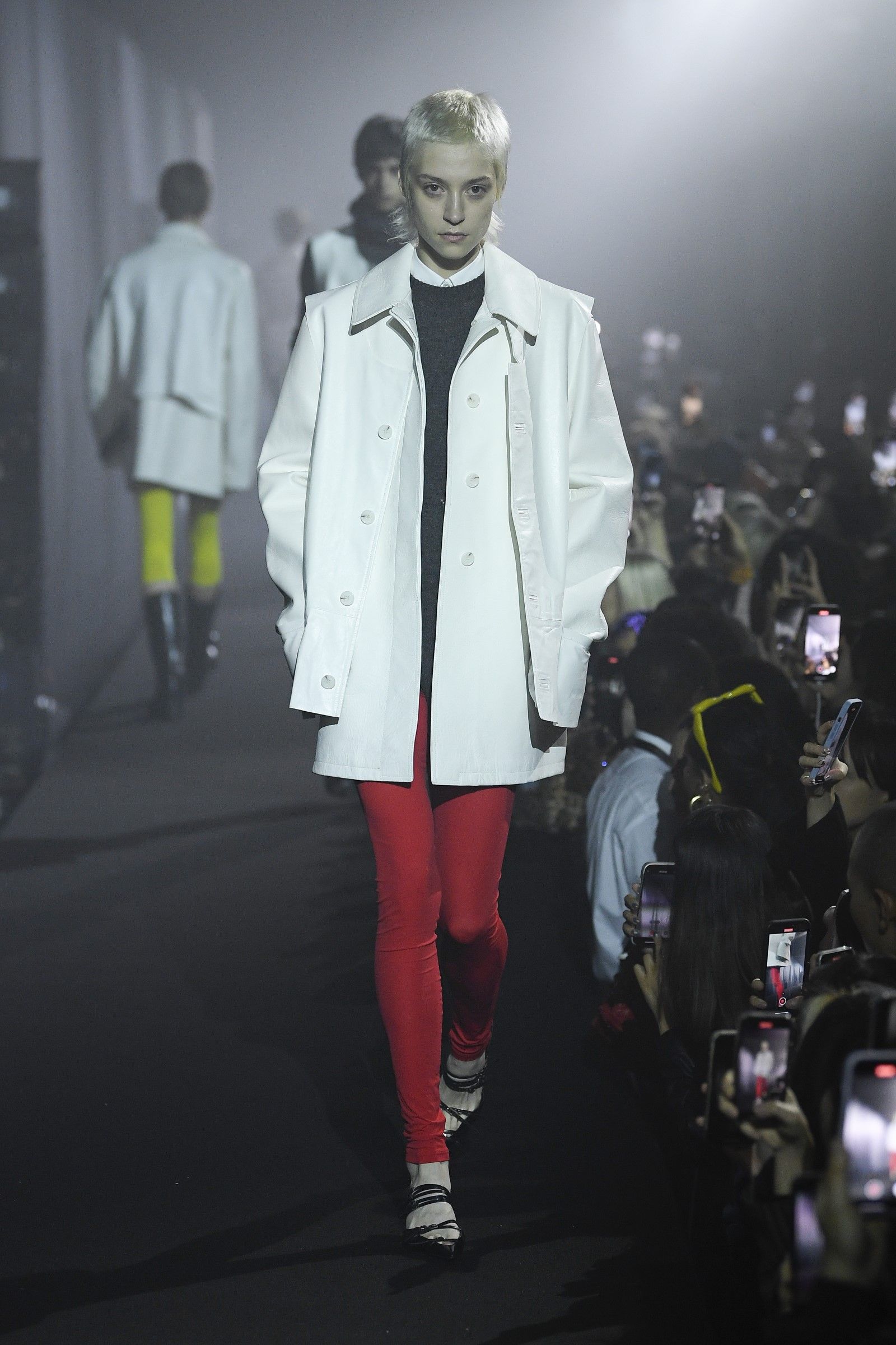 The insistent presence of leggings that replace pants in many instances recall a club culture daughter of that 2000s indie sleaze that, through Simons' alienating and nostalgic lens, further simplifies and minimizes looks. And while the combination of leggings and mesh tops recalls the party uniform of Y2K club culture, with the neon colors winking at the rave world; on the other, an anarchic sense of bon ton emerges in the overlap of shirt and wool sweater that, at the bottom hem, extends into a flap of wool reminiscent of an unfastened bodysuit - later, sleeveless sweaters appear to be worn inside out and backwards, with the Raf Simons label sitting just below the collar on the front. The collection, which opens with three skimpy, semi-transparent looks, then closes with the severity and dryness of gray wool coats and suits, beneath which, beyond the leggings, naked bodies can be perceived - these are the two sides of the radical simplicity sought by Simons: on the one hand, the anarchy of extreme reduction of clothes to second skin and color, on the other, the almost abstract dryness of a tradition beneath which a life can be felt pulsing.
