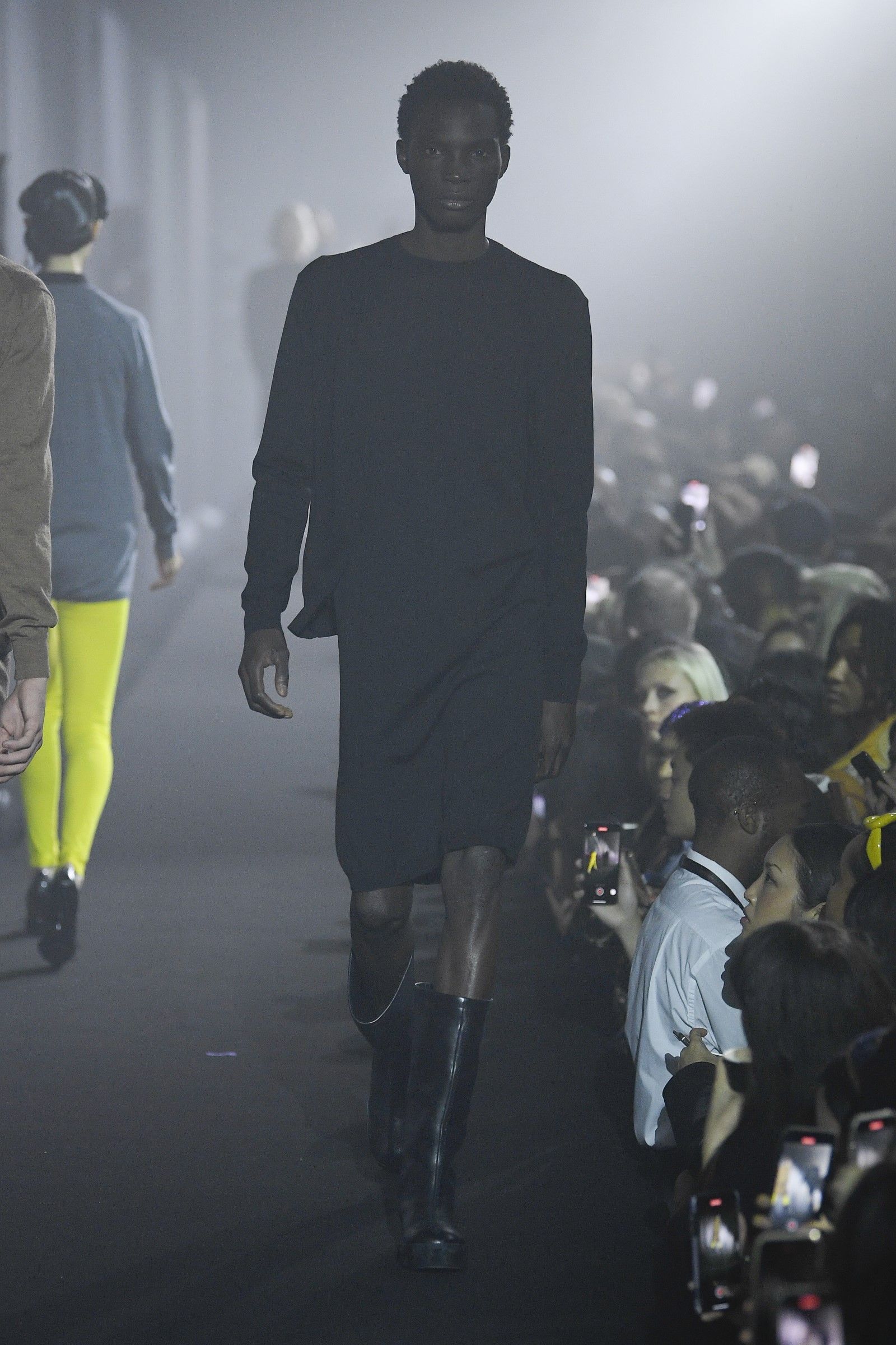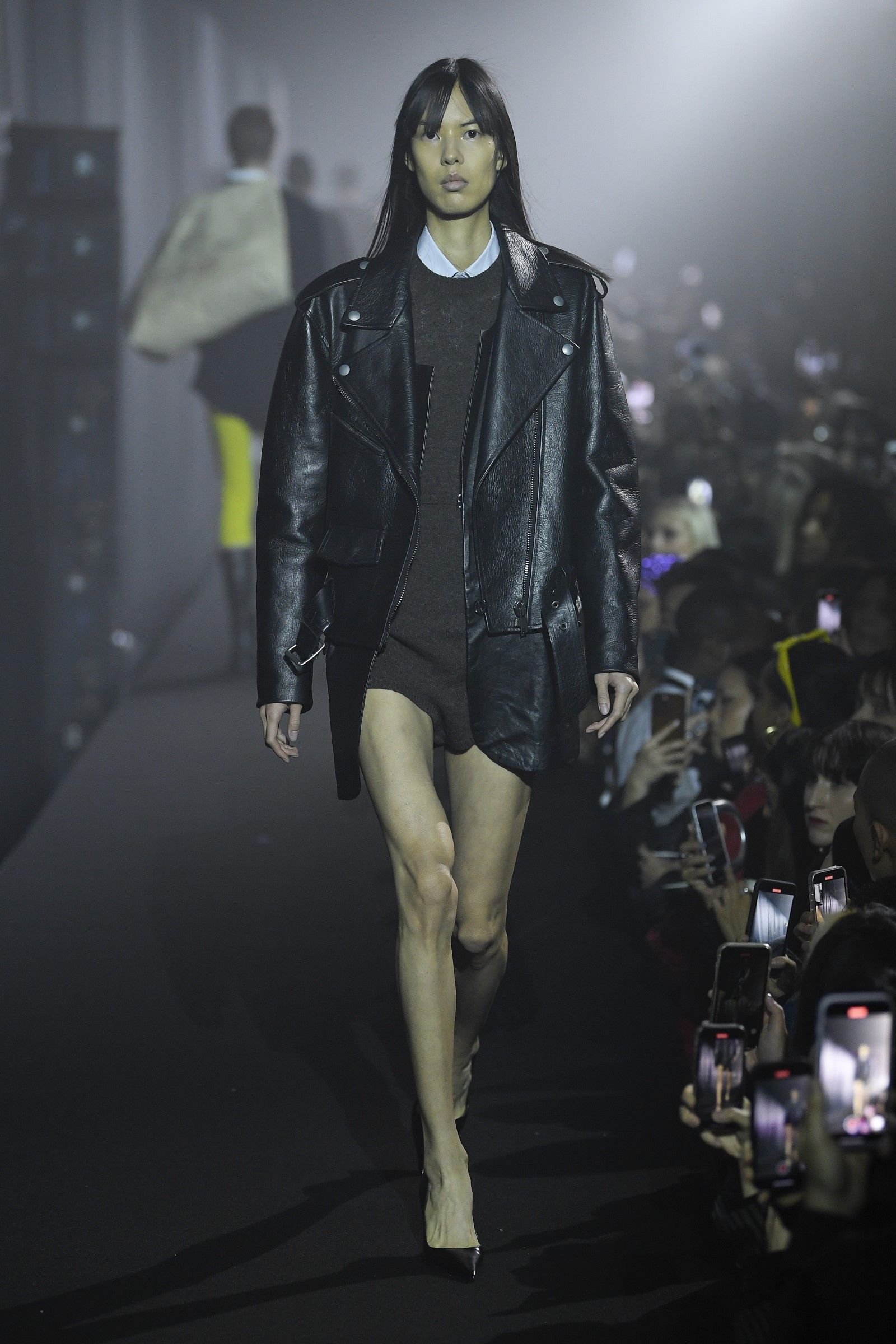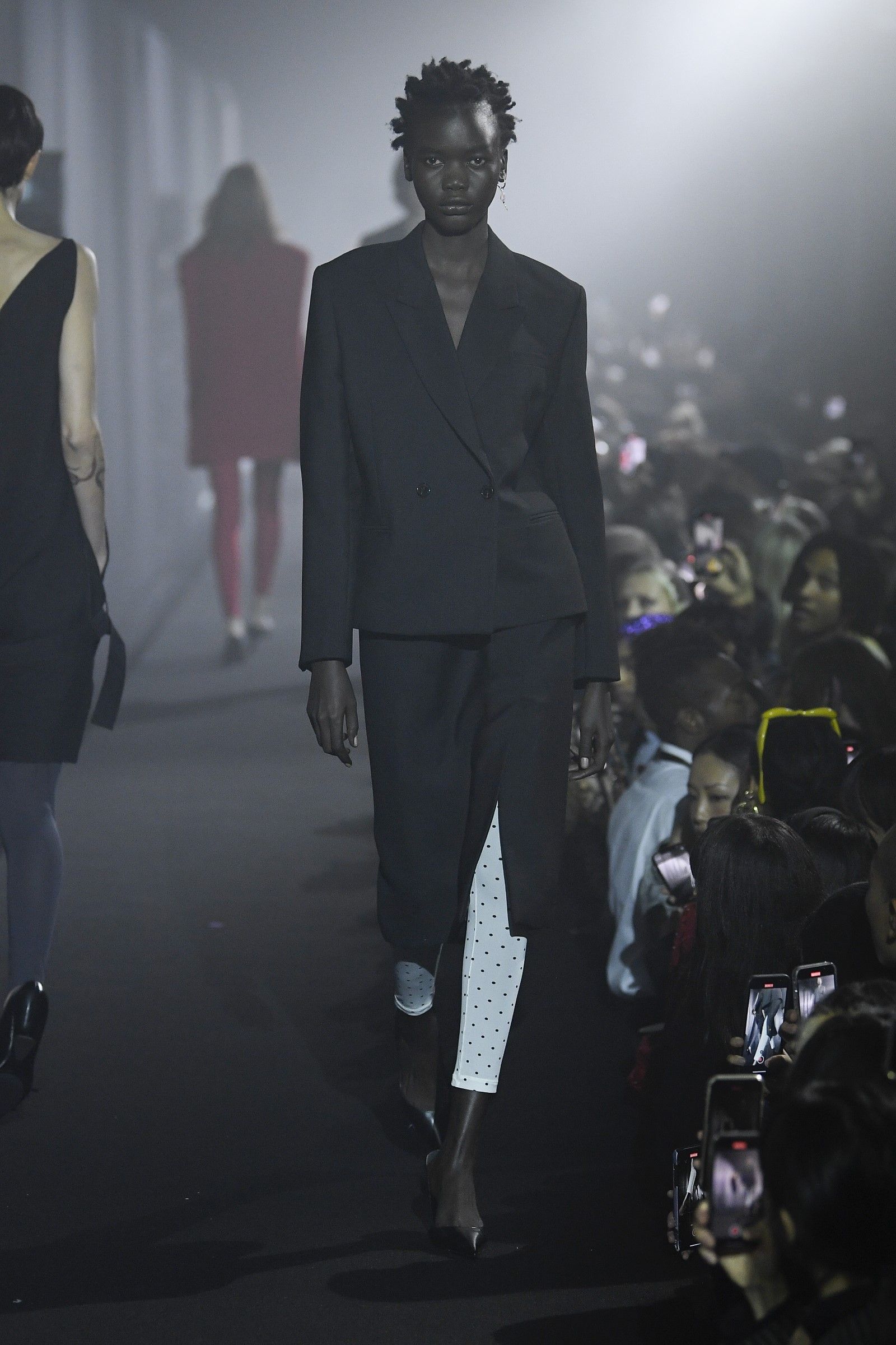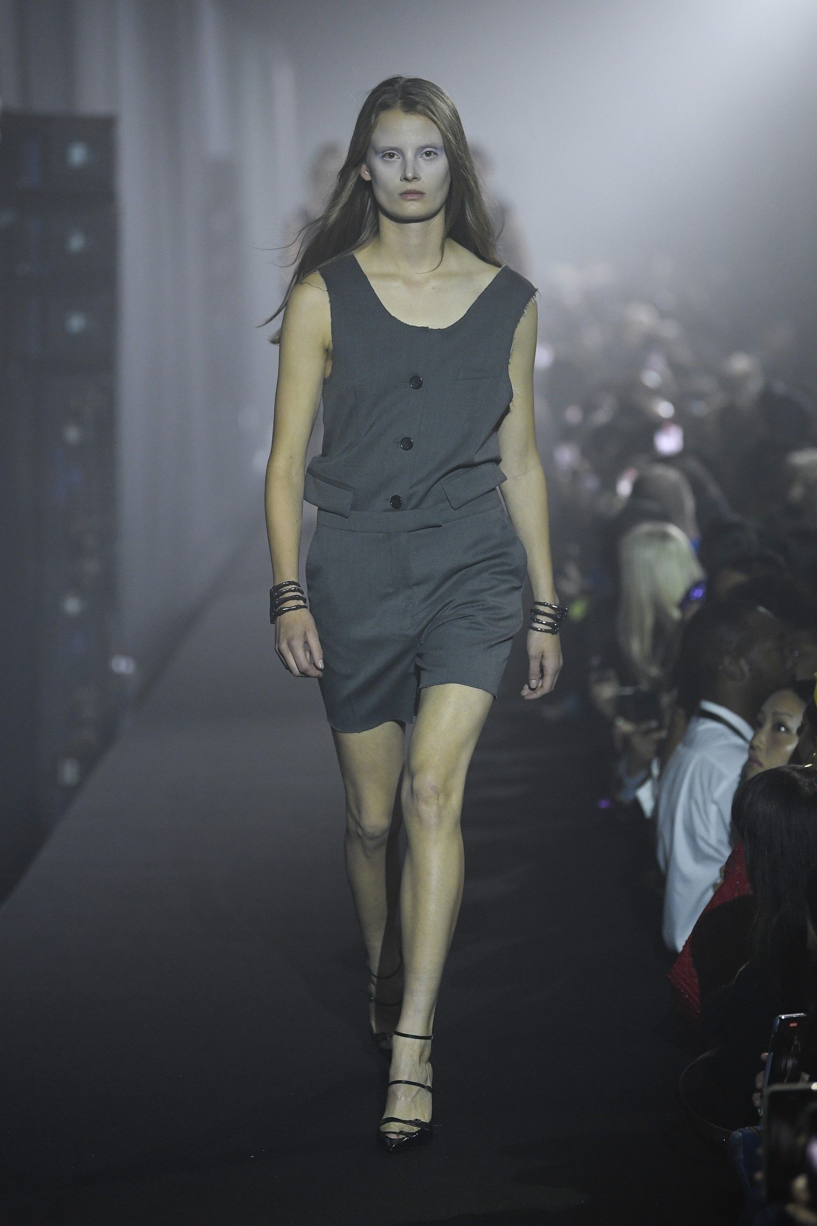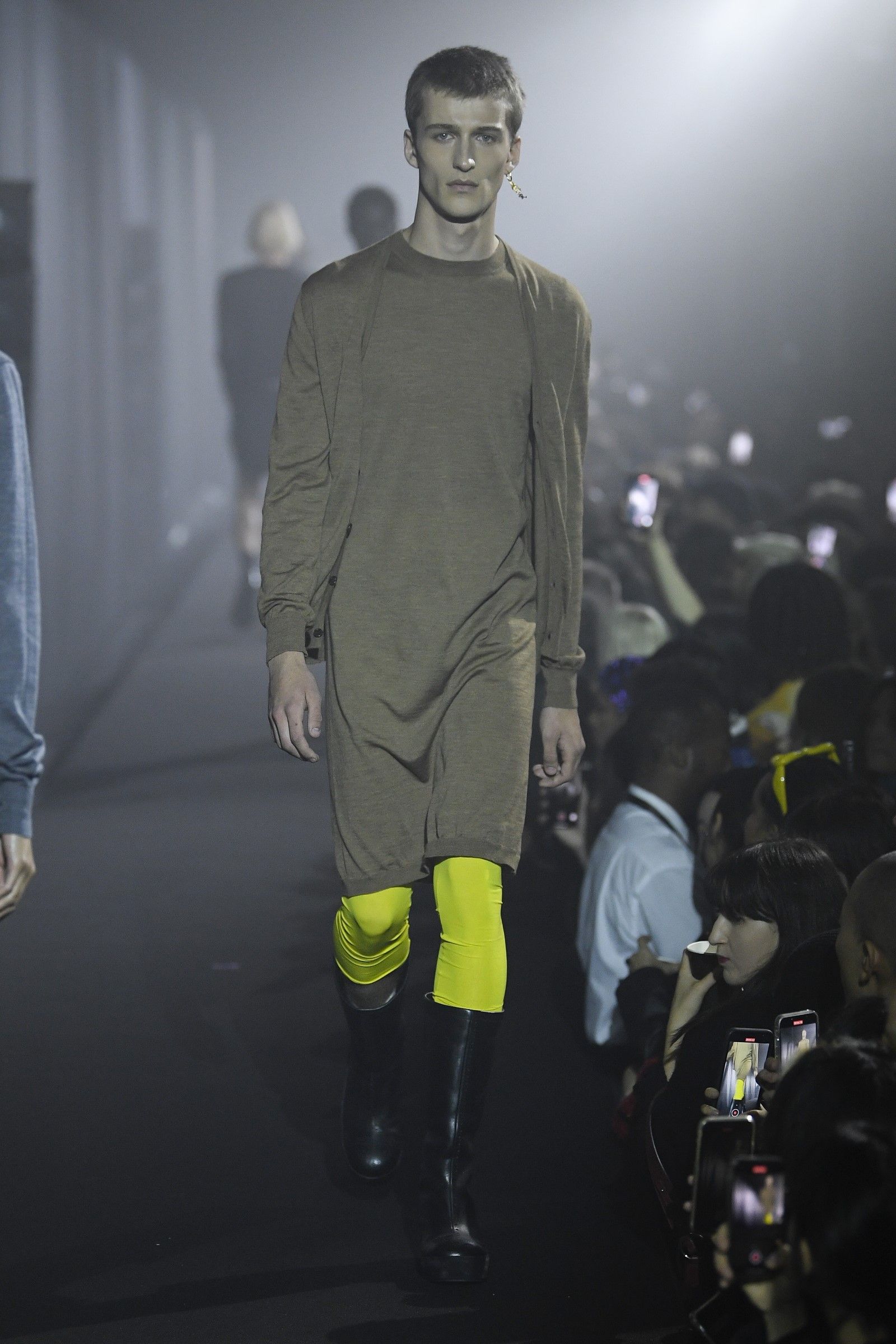 The insistent presence of leggings that replace pants in many instances recall a club culture daughter of that 2000s indie sleaze that, through Simons' alienating and nostalgic lens, further simplifies and minimizes looks. And while the combination of leggings and mesh tops recalls the party uniform of Y2K club culture, with the neon colors winking at the rave world; on the other, an anarchic sense of bon ton emerges in the overlap of shirt and wool sweater that, at the bottom hem, extends into a flap of wool reminiscent of an unfastened bodysuit - later, sleeveless sweaters appear to be worn inside out and backwards, with the Raf Simons label sitting just below the collar on the front. The collection, which opens with three skimpy, semi-transparent looks, then closes with the severity and dryness of gray wool coats and suits, beneath which, beyond the leggings, naked bodies can be perceived - these are the two sides of the radical simplicity sought by Simons: on the one hand, the anarchy of extreme reduction of clothes to second skin and color, on the other, the almost abstract dryness of a tradition beneath which a life can be felt pulsing.
