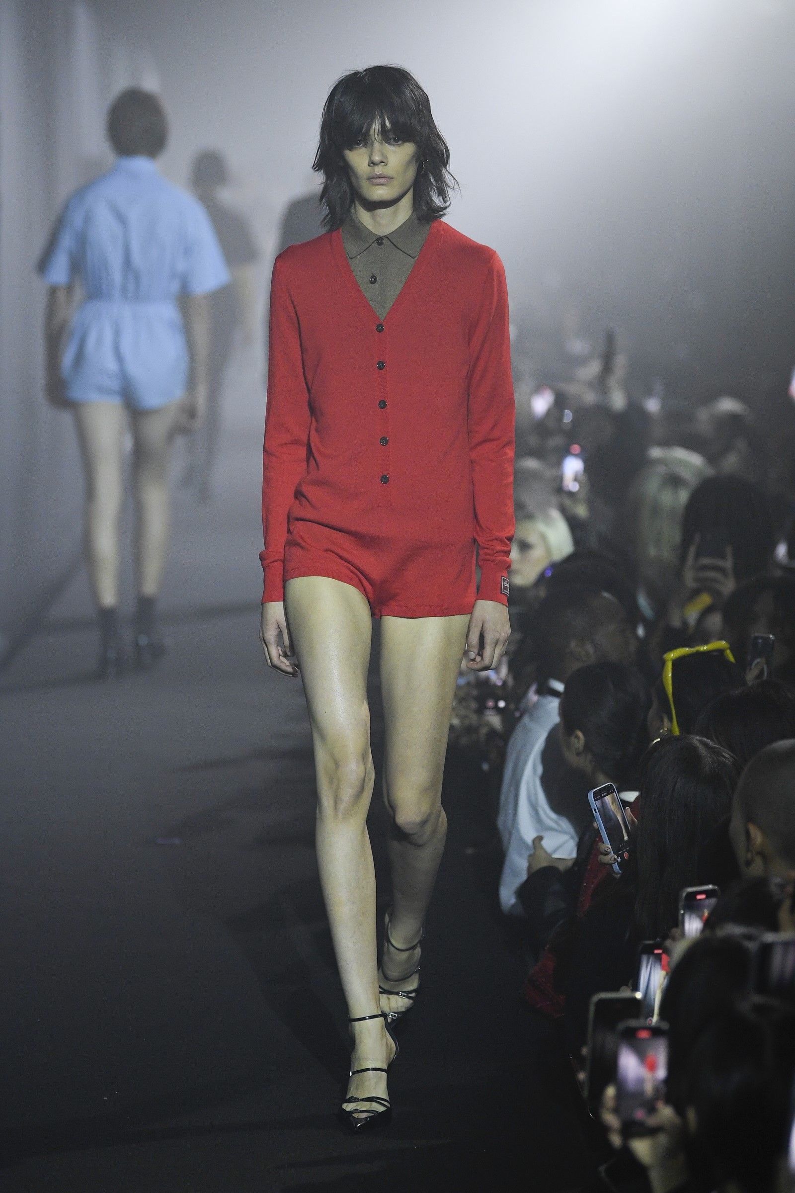 In this sea of minimalism and «tailoring as a machine for the body» and thus as an assemblage of functional parts that create their own aesthetic rather than seeking one, the only touch of eccentricity is entrusted to the increasingly stringent relationship between dress and body: elastic elements in skirts and knitwear hybridize more classic garments with a disturbing touch of modernity and alter their shapes in relation to the body that wears them. Elsewhere, classic, anonymous wool cardigans are transformed into almost childlike rompers that take the idea of reduction toward avant-garde evolutions. The most beautiful pieces, in addition to the aforementioned shirts that become tank tops, are the sack dresses constructed as very simple fabric constructions closed, around the thighs, by a strap and devoid of any seams or superfluous signals - bordering on primitivism. And other straps, those of wafer-thin belts, cinch classic blue shirts and T-shirts at the waist while the progressively resected layers of the looks reveal, underneath, tight-fitting jumpsuits in bright acid colors. Adjusting the shape the silhouette are only two elements: the actual garment, whether knit or dress, in its wide and unstructured forms and a single strap, with all its connotations and subtexts - everything else is body and drape. Paradoxically, in this collection, it is the clothes that seem naked, stripped of their immediate recognizability and abstracted in their alienating anatomy.