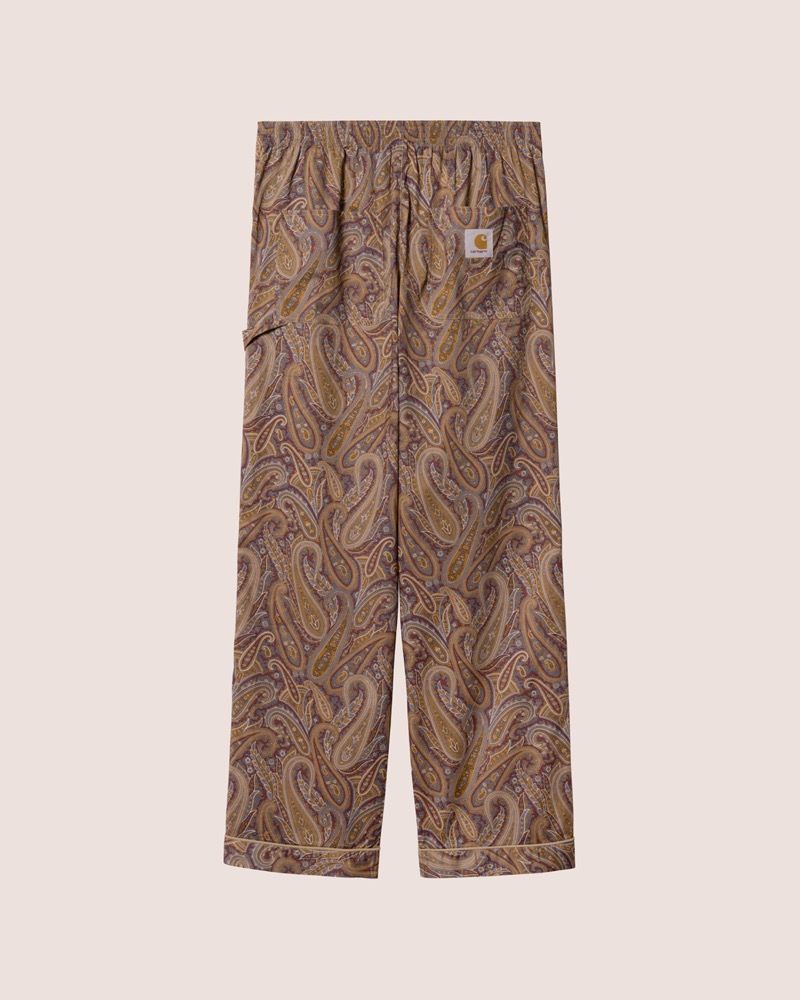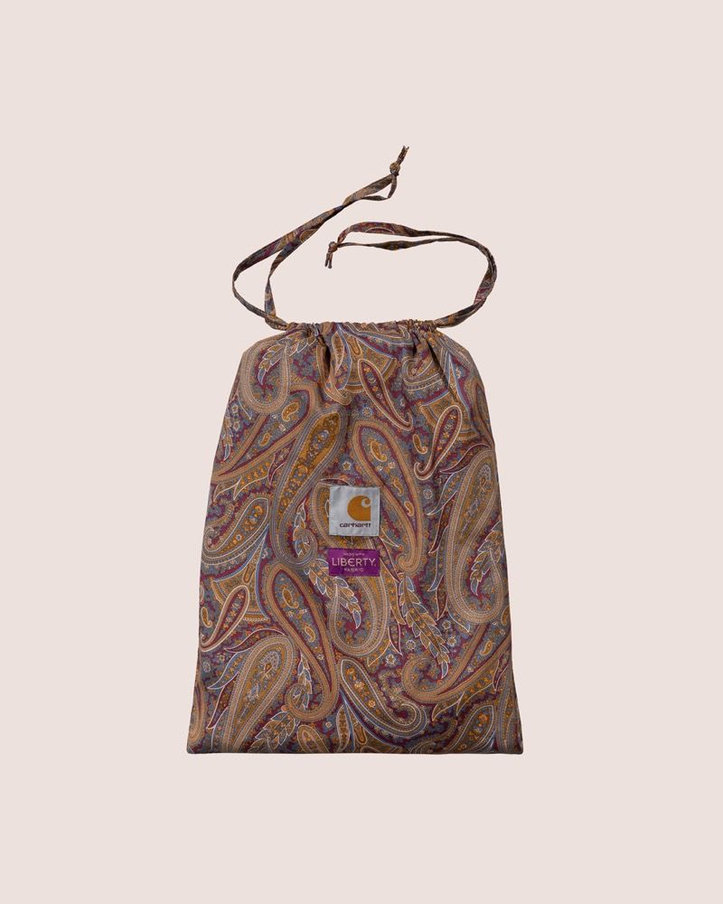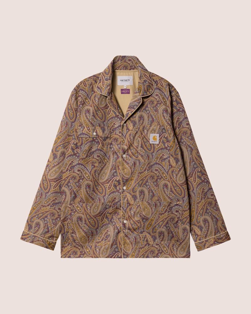 For FW22, Carhartt WIP collaborates with Liberty Fabric, creating a five-piece capsule to usher in the holiday season. Drawing from Liberty Fabric's rich archive, the collection sees the creation of a two-piece pyjama set that references two classic Carhartt WIP designs. The shirt's patch pockets wink at a classic chore coat, while the matching trousers have some details traditionally found on the brand's Double Knee Pant. This utilitarian base is softened by the seasonal colour palette chosen, which includes deep shades of purple, tan and gold, executed in a classic Paisley print design. The capsule is completed by a Carhartt WIP sleep mask made with Liberty Fabrics, which uses the same print.