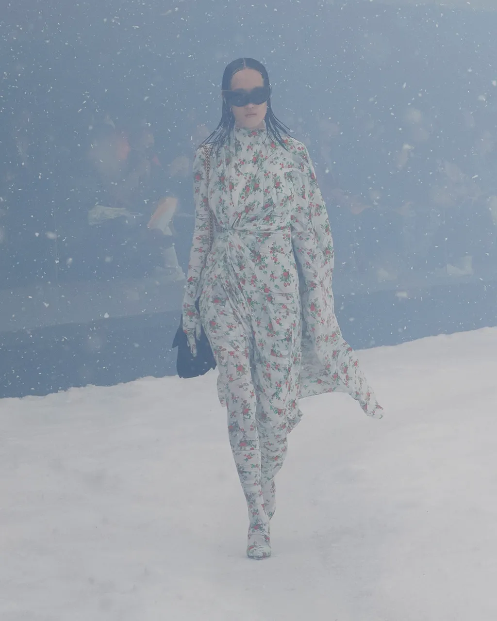 A blizzard in a glass box and the models as faint twigs in the wind, dressed in haute couture. Balenciaga's show for the FW22 collection in Paris had a double theme: a dystopian vision of a world where winter no longer exists and snow appears as something exotic, and support for the Ukrainian cause by depicting the very topical issue of war refugees. This evocative message is accompanied by a high level of research, both in the design of the models - from the leather trash bag to the cashmere towel to the overall look in logo scotch - and in the technology, including pre-folded fabrics and the "foldable" constructions of trench coats and double-breasted suits, bags made from converted boots, an HD trainer made from a single flexible piece and, above all, the new bio-based material made from mycelium.