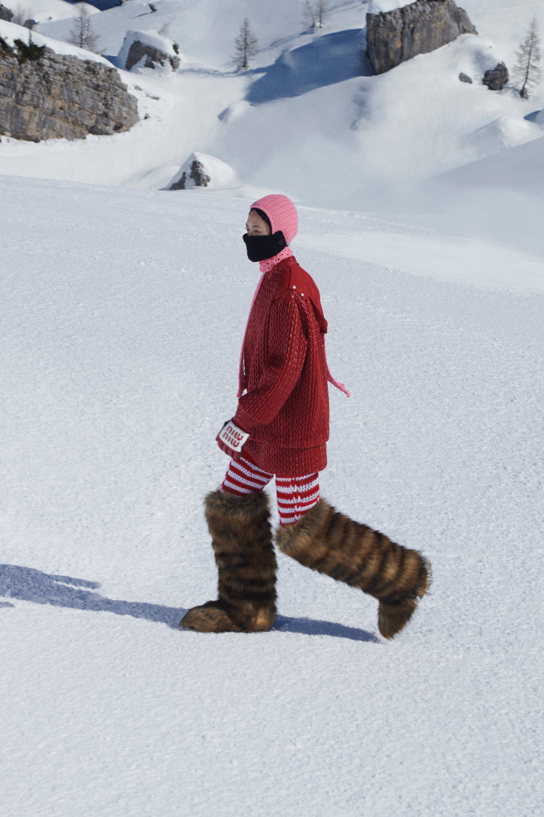 Cortina D'Ampezzo, an epic high-mountain landscape in the Dolomites, was the perfect place to celebrate one of Ms. Prada's great passions: Snow. Inspired by the extreme shift between indoor and outdoor clothing, confinement, and liberation, the collection drew inspiration from the contradictions of the pandemic: oversized parkas and woolly hats, short dresses, and sheer tops paired with Yeti boots. Figuratively, it was a metaphor for the post-enclosure state: a material outburst of our mental state, the desire for liberation (and getting out despite the temperatures) through a kind of alpine underwear ("Very sexy stuff for me" Miuccia Prada commented).