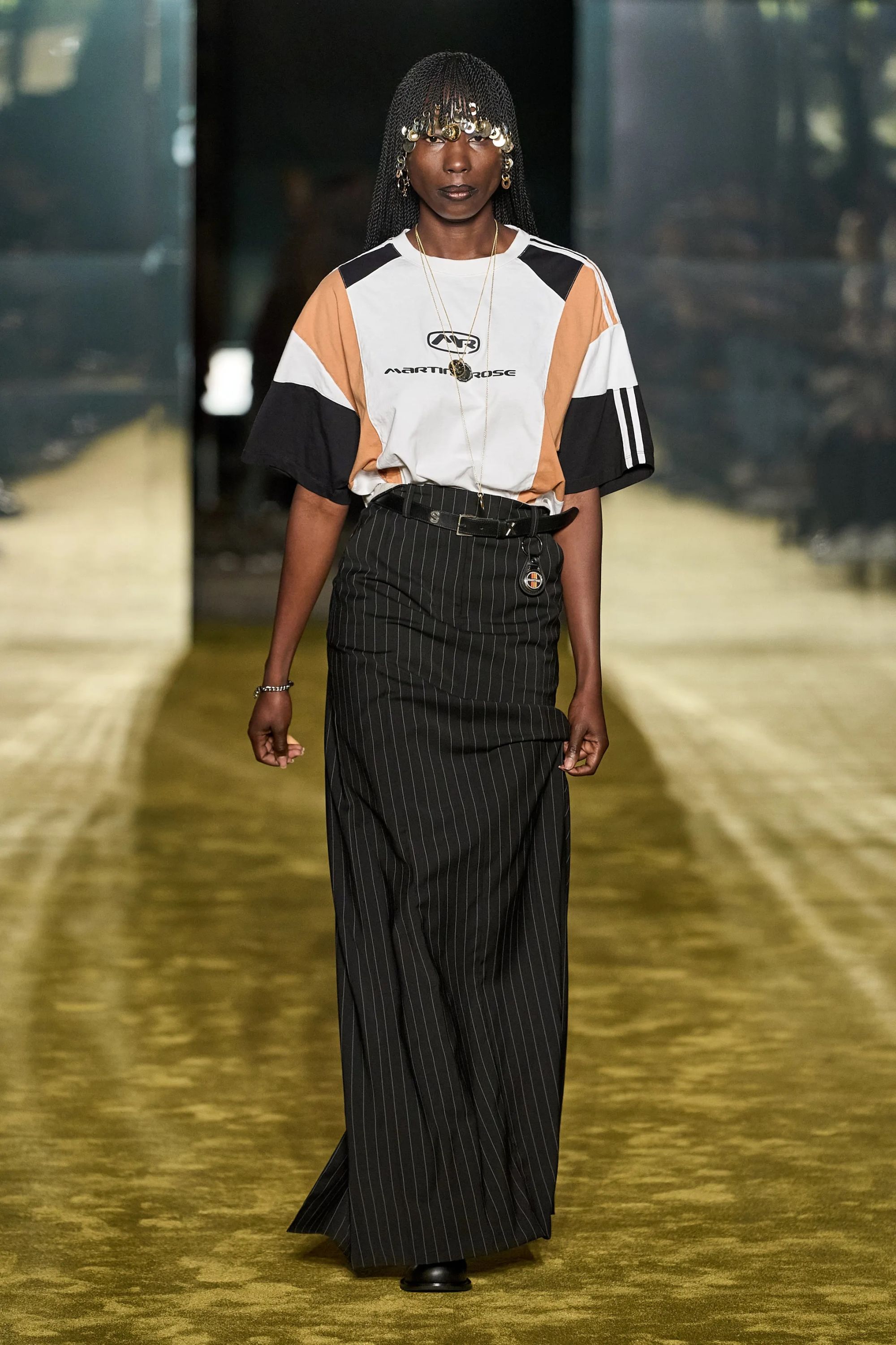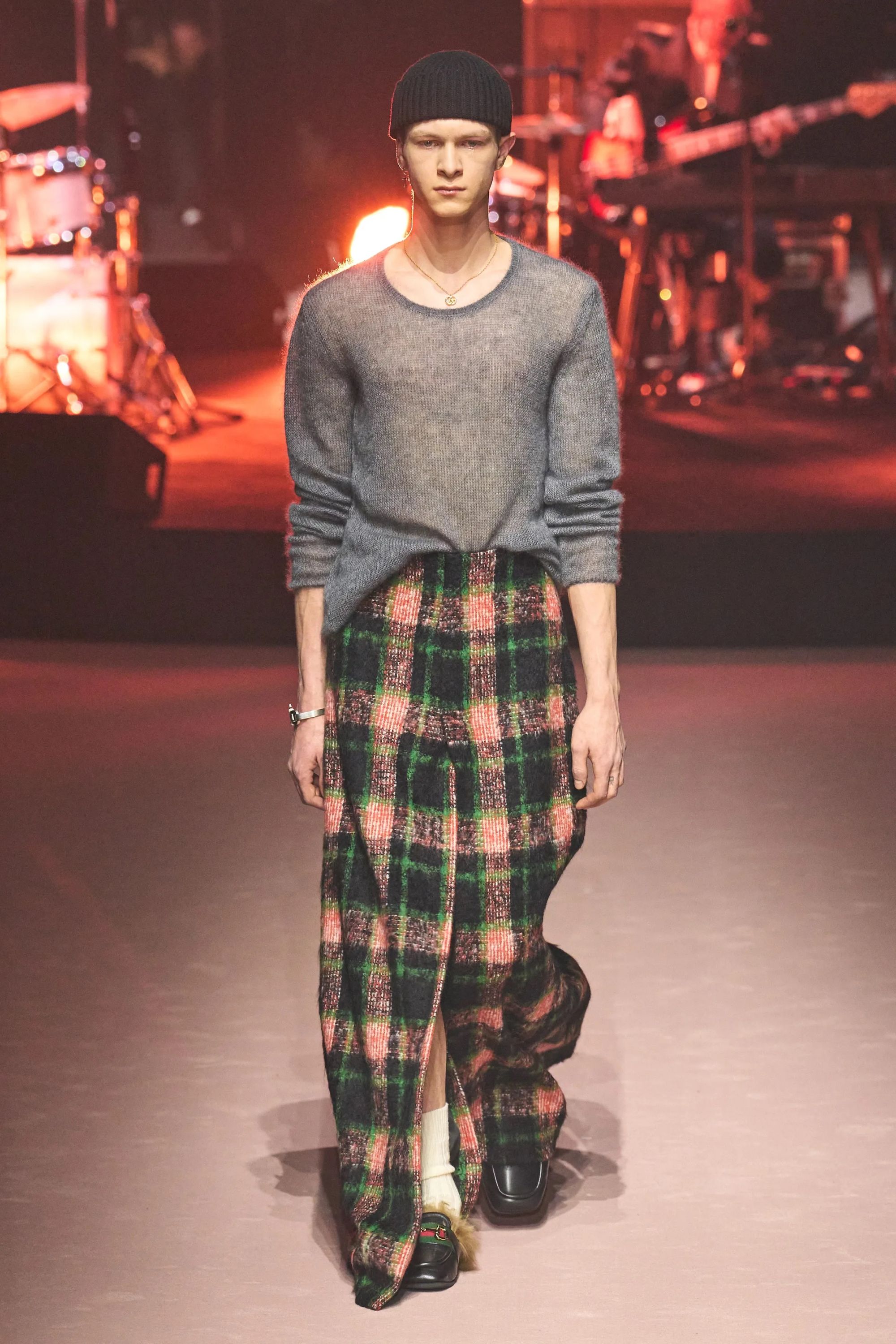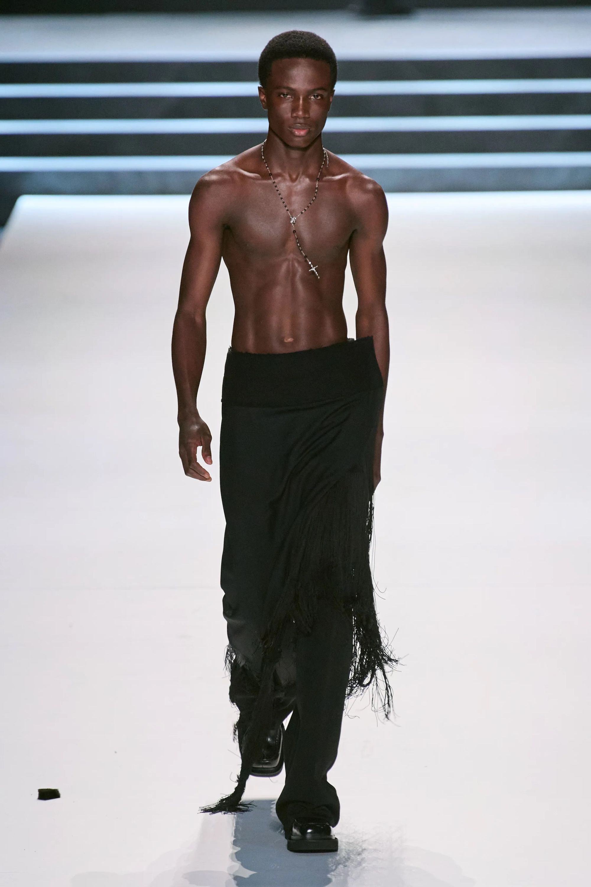 Starting the dances for this trend was Martine Rose, who for her first show in Florence designed tailored and structured lines with a marked androgynous sense. The skirts were many and all long down to the feet, in tight dark denim, a classic pinstripe muted by a sports jersey, or a silk mermaid. Stylist Samia Giobellina has instead decided to shorten skirts to a minimum for JordanLuca, playing with different fabrics and textures. There was a very specific look for every taste: from sexy draped lace to pink python, from crinkled velvet to Lonsdale's iconic grey boxer-style cotton. The Gucci team, although having taken a path towards post-Michele minimalism, brought train-length Scottish wool skirts with wide slits to the catwalk. The unmistakable loafers peeked from underneath, and were worn with white ribbed socks. Marco De Vincenzo's Etro collection also explored Tartan. For stylist Vincent Pons, these pleated skirts should be worn open, even over baggy denim, creating a look that hints at cosy punk. The minis designed by the Caten twins for Dsquared2, who played with a teenage and nostalgic look transporting viewers back to 2010, went in a completely opposite direction. Denim was ripped and discoloured with bulging pockets and black lace, or in a strictly unfastened dungaree version. The latter, which left the belly exposed, was styled with a baseball cap with the caption 'Fuckin' Freezing'. Concluding this parade of skirts was Dolce & Gabbana's Essence collection, which let each piece breathe on its own as it was worn by models who were almost always shirtless, as in the case of their skirt, full of fringes and with a 70s softness.
