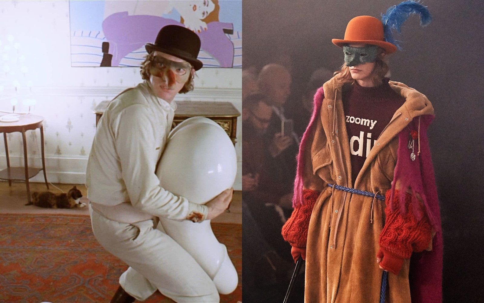 Always an avid collector of film references, Jun Takahashi reprised his Kubrick nostalgia for Undercover's FW19 collection. Remaining to this day one of the brand's most memorable collections, Takahashi brought bowler hats and walking sticks from the Droogs to the runway and also many of the frames from A Clockwork Orange, creating more subtle references with, for example, the print of Beethoven's face on a sweatshirt. Another reference to the film is the Venetian mask-which, however, is here reinterpreted in a historical key, creating a parallel between the film's protagonist, Alex de Large, and the artist Caravaggio, who is mentioned both through the invitation and through the red or reddish draperies found throughout the collection-as if to say that the madness of the criminal and the vocation of the artist are two sides of the same, problematic coin.