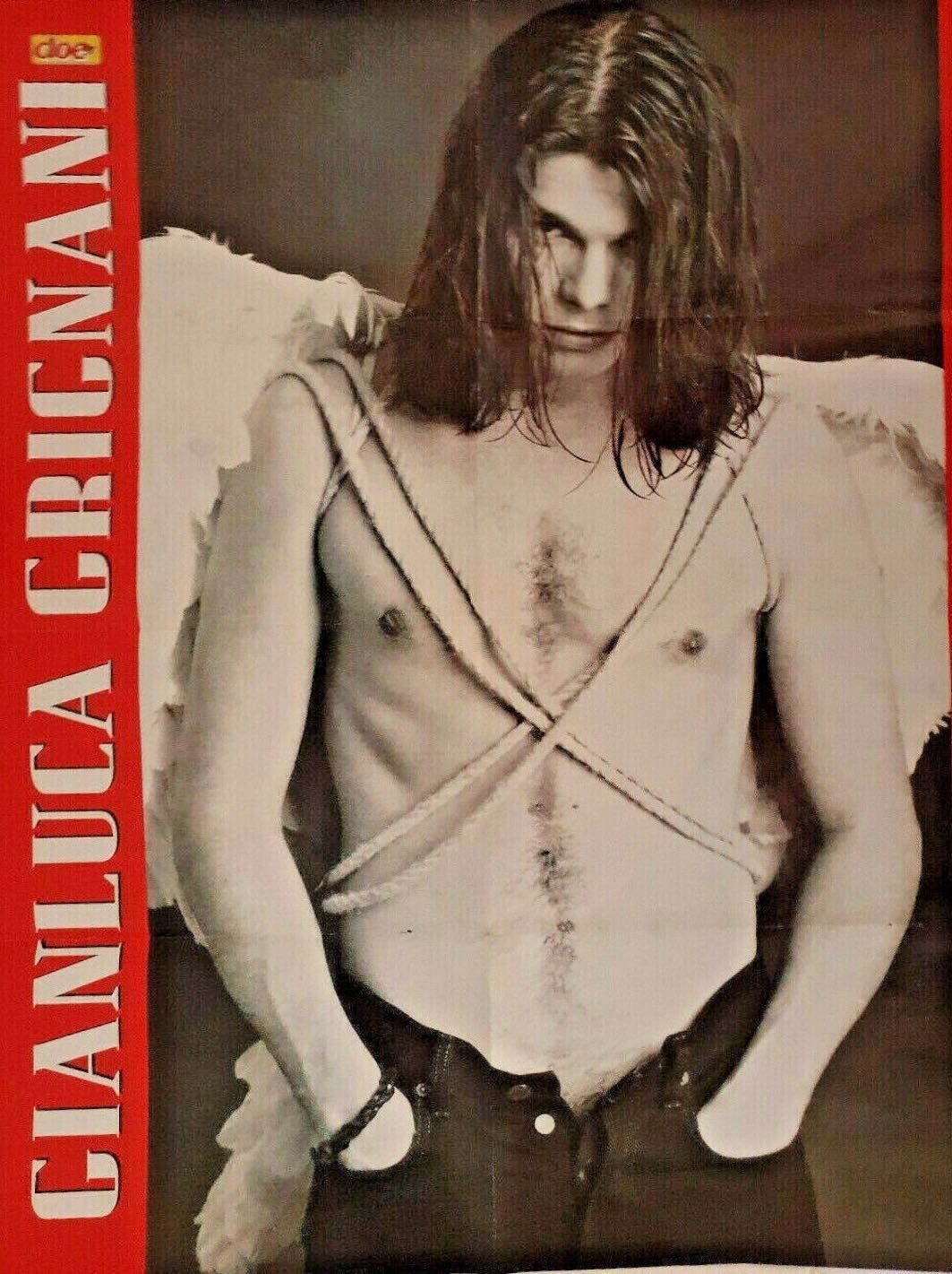 Of all the names we have just mentioned, however, Grignani was the only one (along with Raz Degan and Enrico Silvestrin as well) who had a truly distinctive look, the only one who kept his hair long and the only one who cultivated a kind of street-boy scruffiness to which the rest preferred a more "well-behaved" patina. Not coincidentally, he was also the only (or at any rate most egregious) instance in which a successful singer among young people moved from music to film by starring in Branchie, a 1999 adaptation of Niccolò Ammaniti's novel of the same name about a teenage couple broken by a terminal illness in full Love Story or The Fault in Our Stars style. Watching those videos again now, however, and reading the hundreds of comments from users marveling at the singer's physical attractiveness, it is impossible not to notice that that somewhat ephebic, maudit charm emerges not only from Grignani's features, but above all from his personal style: the long dark hair, the oversized striped sweater worn over bare skin that immediately evokes Kurt Cobain, the slightly too baggy pants, the black sneakers. It is not hard to see why the girls in the studio followed his movements ecstatically, but it is perhaps less obvious to note how that outfit, and several subsequent ones of which we have traces, are indebted to the very grunge of which Kurt Cobain was the ultimate exponent and the band Green River the initiators. A poster published more than two decades ago by Cioè would seem to demonstrate this ancestry: the photo shows Grignani shirtless wearing a pair of unbuttoned jeans and two fake angel wings. Fake angel wings are one of Kurt Cobain's own most iconic (and melancholy) props from the In Utero album period - and have remained in the teenage drama iconography from Romeo + Juliet to the very recent Euphoria.