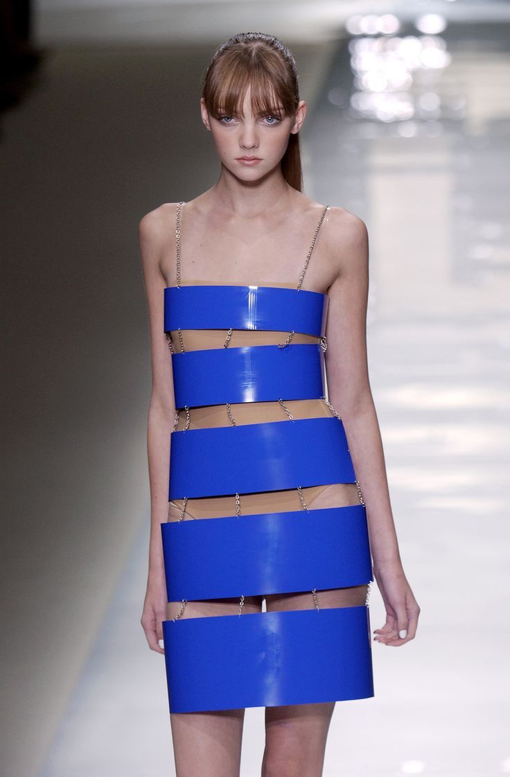 Y2k meant an interesting mix of glittery miniskirts, chainmail bikinis and dresses that revealed much more skin than they covered for the historic brand, in a time when making women sexy seemed to be the only ambition of designers. Among the most interesting creations of those years were the transparent PVC minidress with multicoloured polka dots, the chainmail with heart-shaped inserts and the (apparently very uncomfortable) metallic bikinis casually worn by a Karolina Kurkova in her prime for SS04.