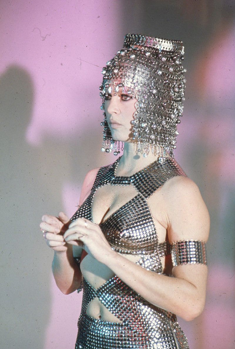 Brigitte Bardot wore Rabanne in the music video for the song Contact, Mina wore the designer's creations in several public appearances, as did Audrey Hepburn. But if there is one star who has truly gone down in history as the iconic face of the brand, it is surely Jane Fonda with her futuristic costumes in the 1968 film Barbarella, directed by Roger Vadim. The science fiction film is based on the comics by Jean-Claude Forest and reflects the playful and sometimes sly spirit of the comics, especially when it dwells on erotic details. In perfect keeping with the film's daring tone, Paco Rabanne created for Fonda tight metallic bustiers, tight-fitting jumpsuits, bodices with nude-effect plexiglass appliqués, silver astronaut-style jackets and sexy lamé outfits. A look inspired by the imminent landing of man on the moon, a cue that started a whole new trend in fashion, interpreted by Rabanne herself together with Courrégès and Cardin under the title Space Age.