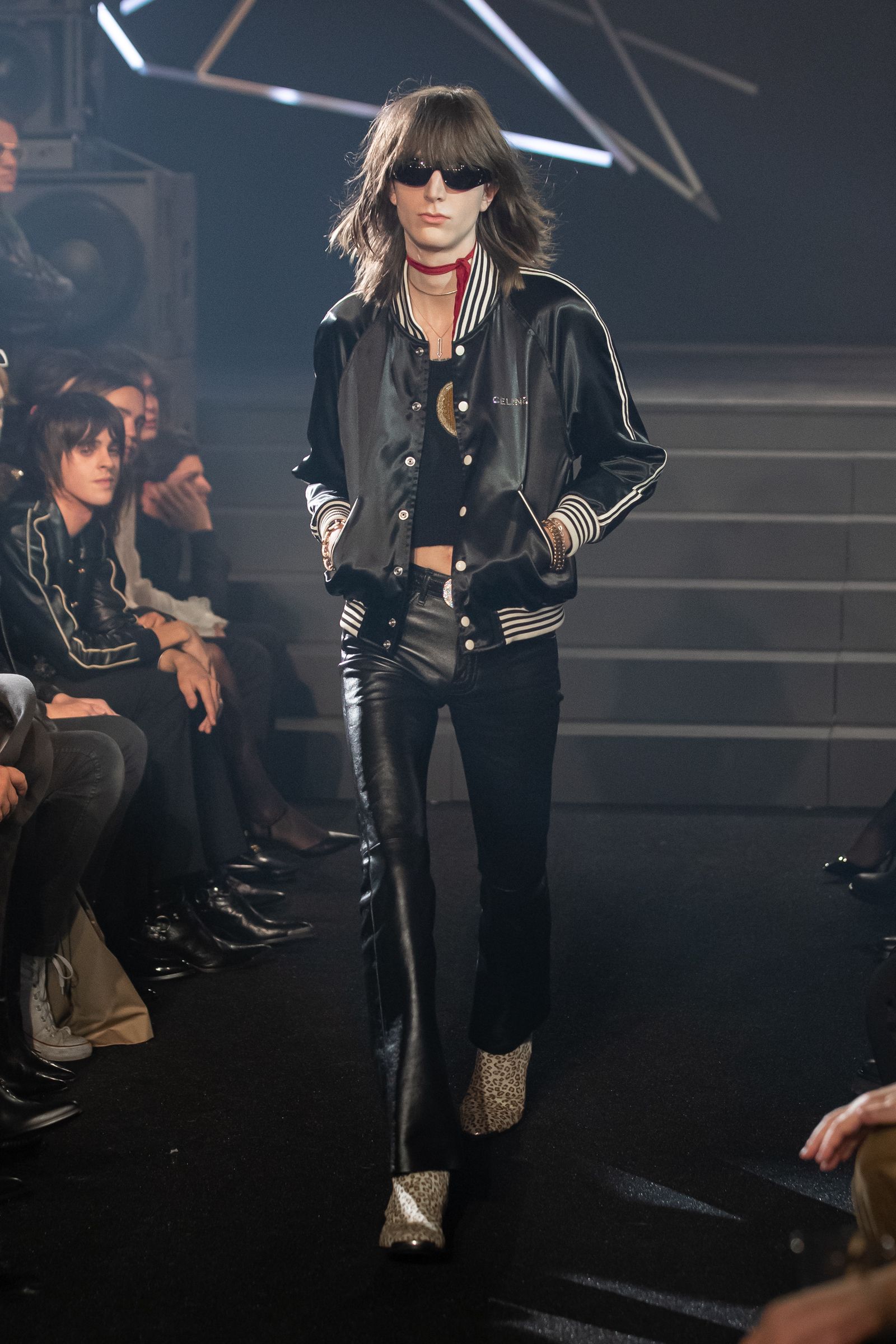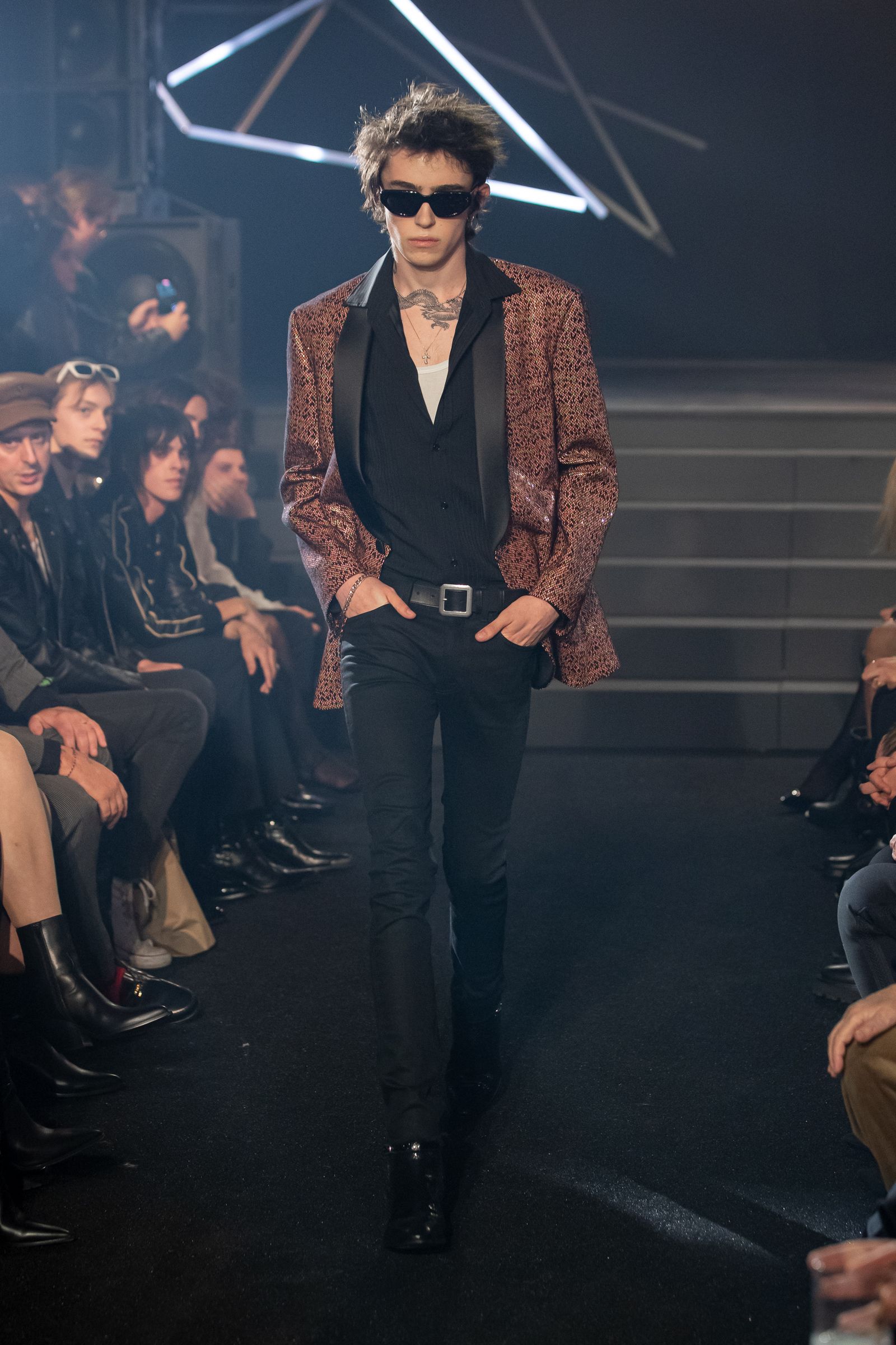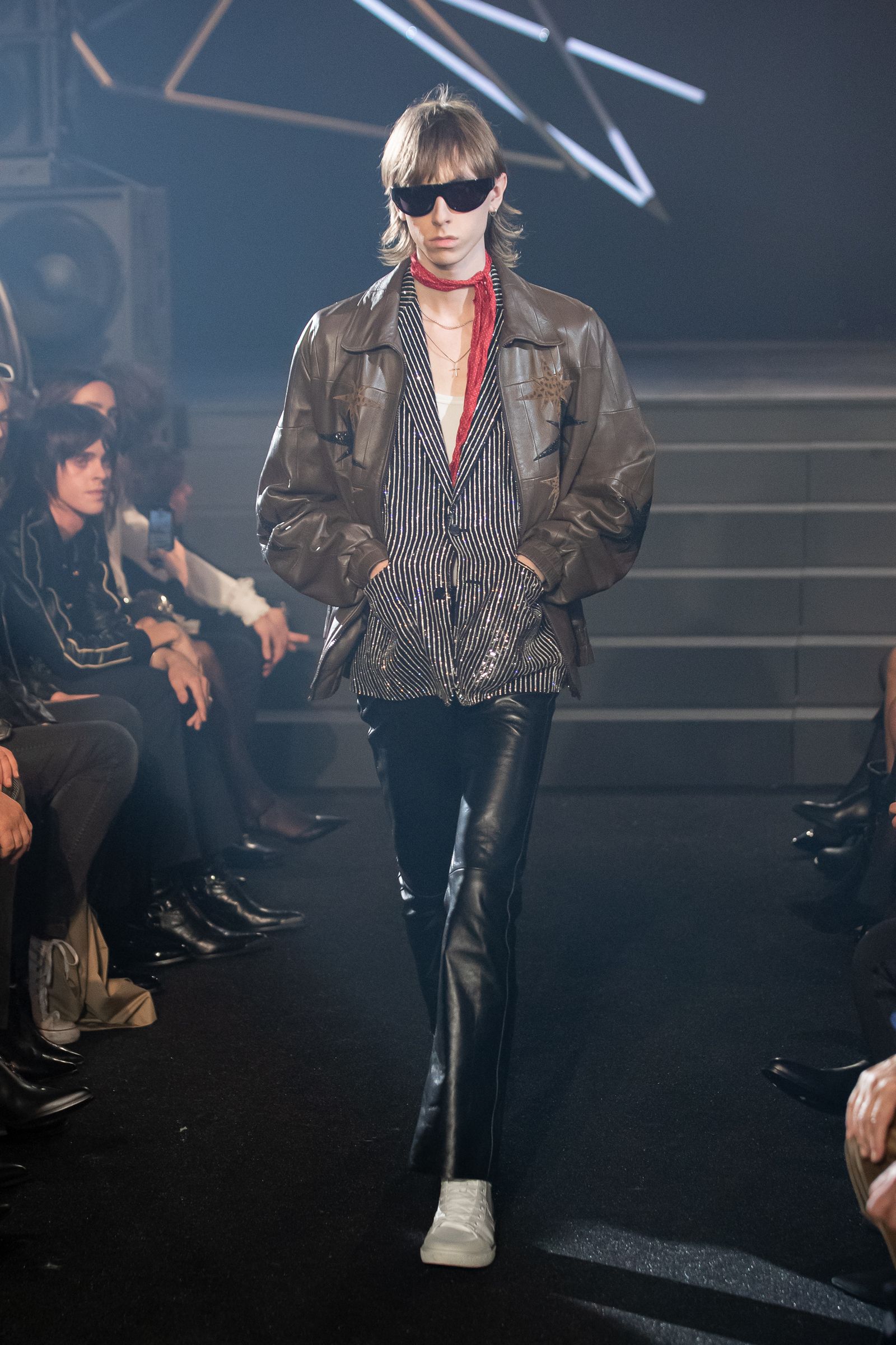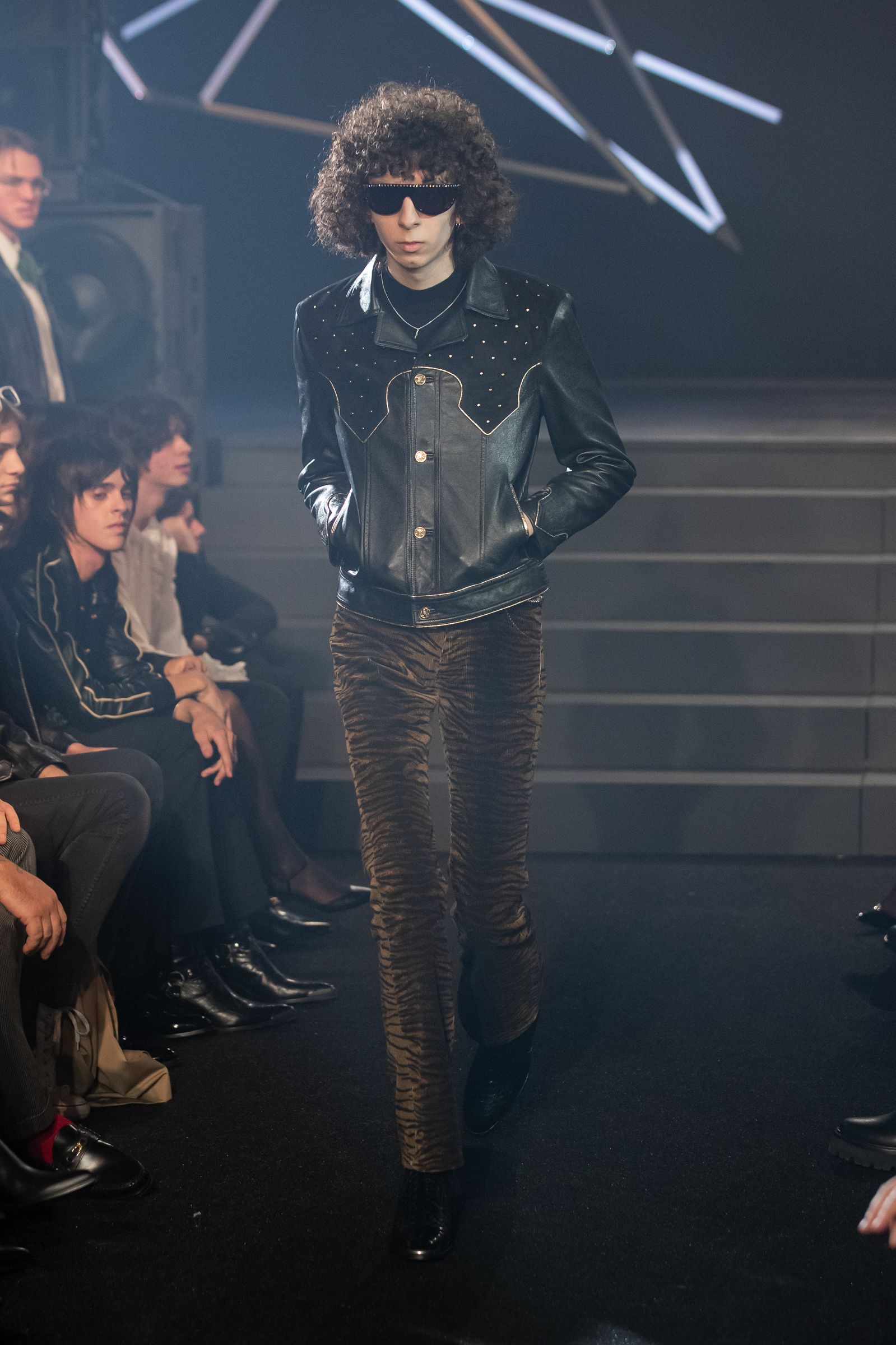 Maintaining a strong continuity with the past, the collection insisted on the theme of the total leather look, with the classic skinny silhouette being decorated with studs or rhinestones. There is no shortage of classic glam details such as an abundance of metallic elements, mesh undershirts, and the omnipresence of animal prints, which, in the case of oversize coats, were recreated using faux fur made of pure cashmere. Elsewhere, most striking was certainly the styling choices that saw these very aggressive garments combined with other more immediately vintage pieces and fabric types: a barbed coat, oversized aviator jackets, tweeds, trench coats and cabanas, pinstripe suits mixing flared pants and raised shoulders. More humorous pieces abounded as well, such as denim jackets constructed like a patchwork, leopard-print ties, and even a T-shirt with a bow tie drawn on it similar to a design Slimane created in his time at Dior Homme. There were also pieces bearing Le Palace branding that will instead be produced in a limited edition. The artwork that decorated many of the outfits, then, was signed by Alan Vega - one of the members of the band Suicide that provided the soundtrack for the show.