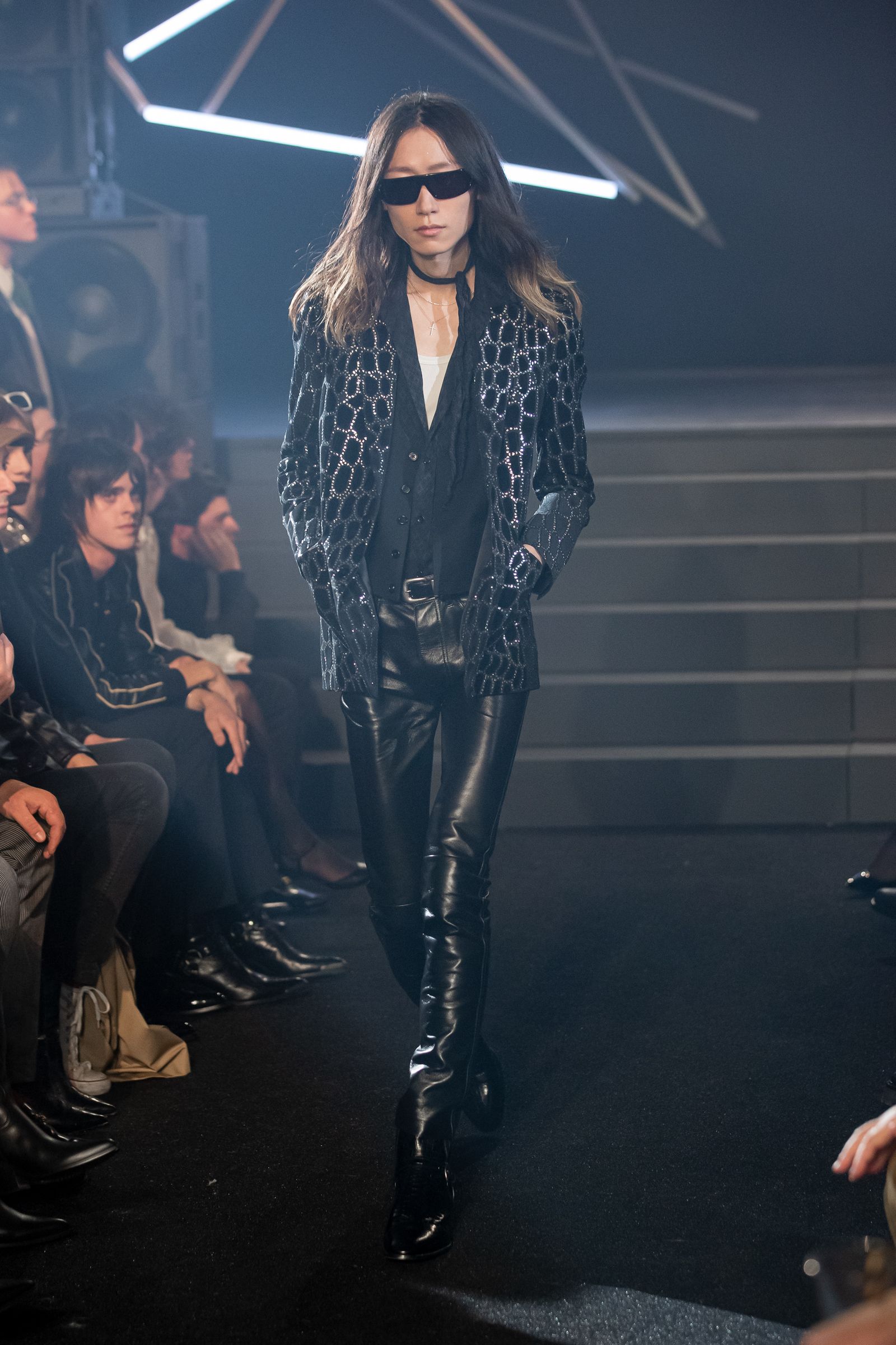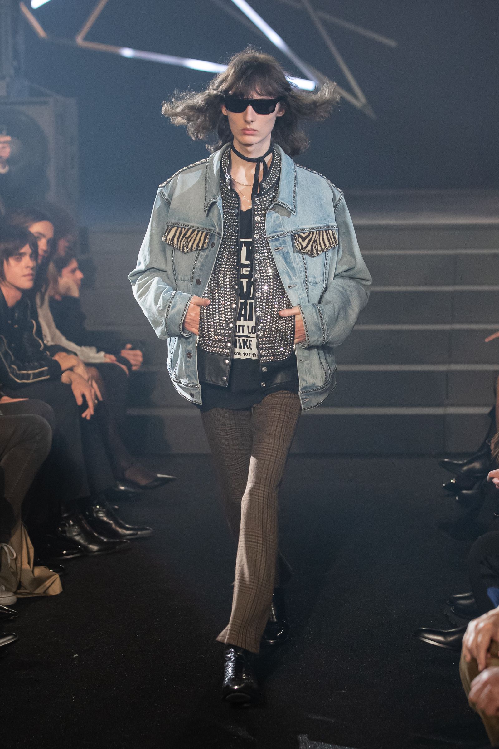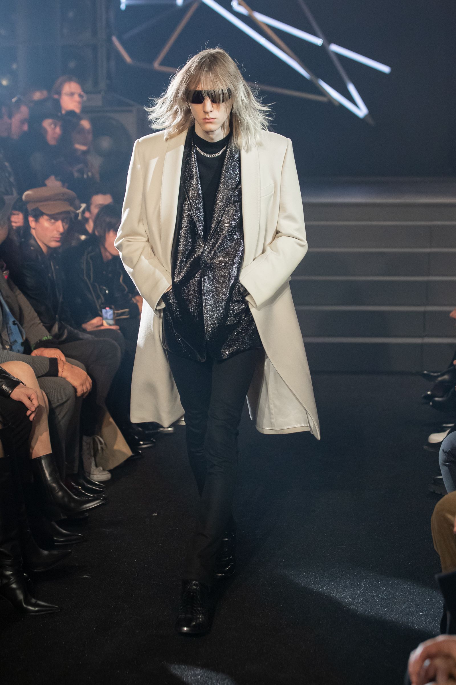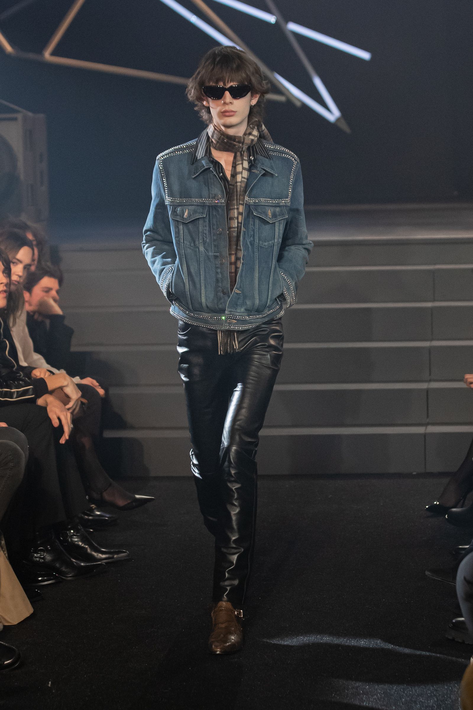 Maintaining a strong continuity with the past, the collection insisted on the theme of the total leather look, with the classic skinny silhouette being decorated with studs or rhinestones. There is no shortage of classic glam details such as an abundance of metallic elements, mesh undershirts, and the omnipresence of animal prints, which, in the case of oversize coats, were recreated using faux fur made of pure cashmere. Elsewhere, most striking was certainly the styling choices that saw these very aggressive garments combined with other more immediately vintage pieces and fabric types: a barbed coat, oversized aviator jackets, tweeds, trench coats and cabanas, pinstripe suits mixing flared pants and raised shoulders. More humorous pieces abounded as well, such as denim jackets constructed like a patchwork, leopard-print ties, and even a T-shirt with a bow tie drawn on it similar to a design Slimane created in his time at Dior Homme. There were also pieces bearing Le Palace branding that will instead be produced in a limited edition. The artwork that decorated many of the outfits, then, was signed by Alan Vega - one of the members of the band Suicide that provided the soundtrack for the show.