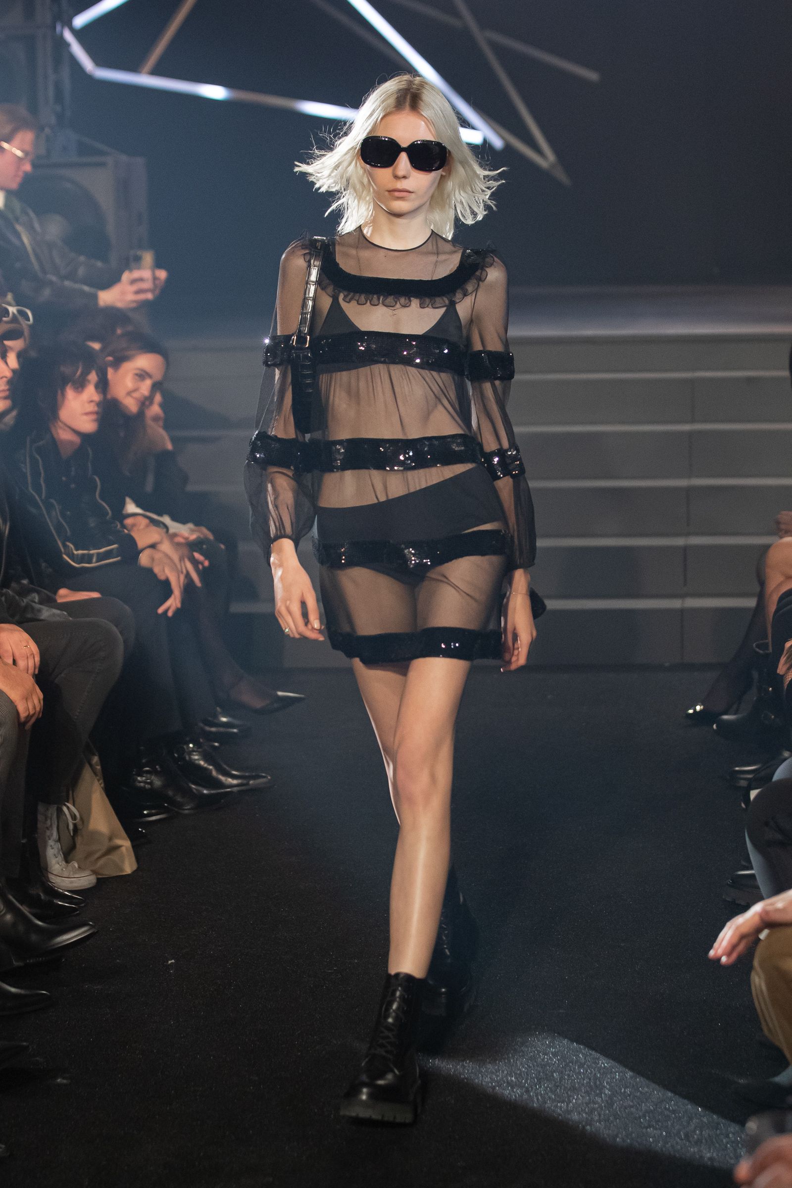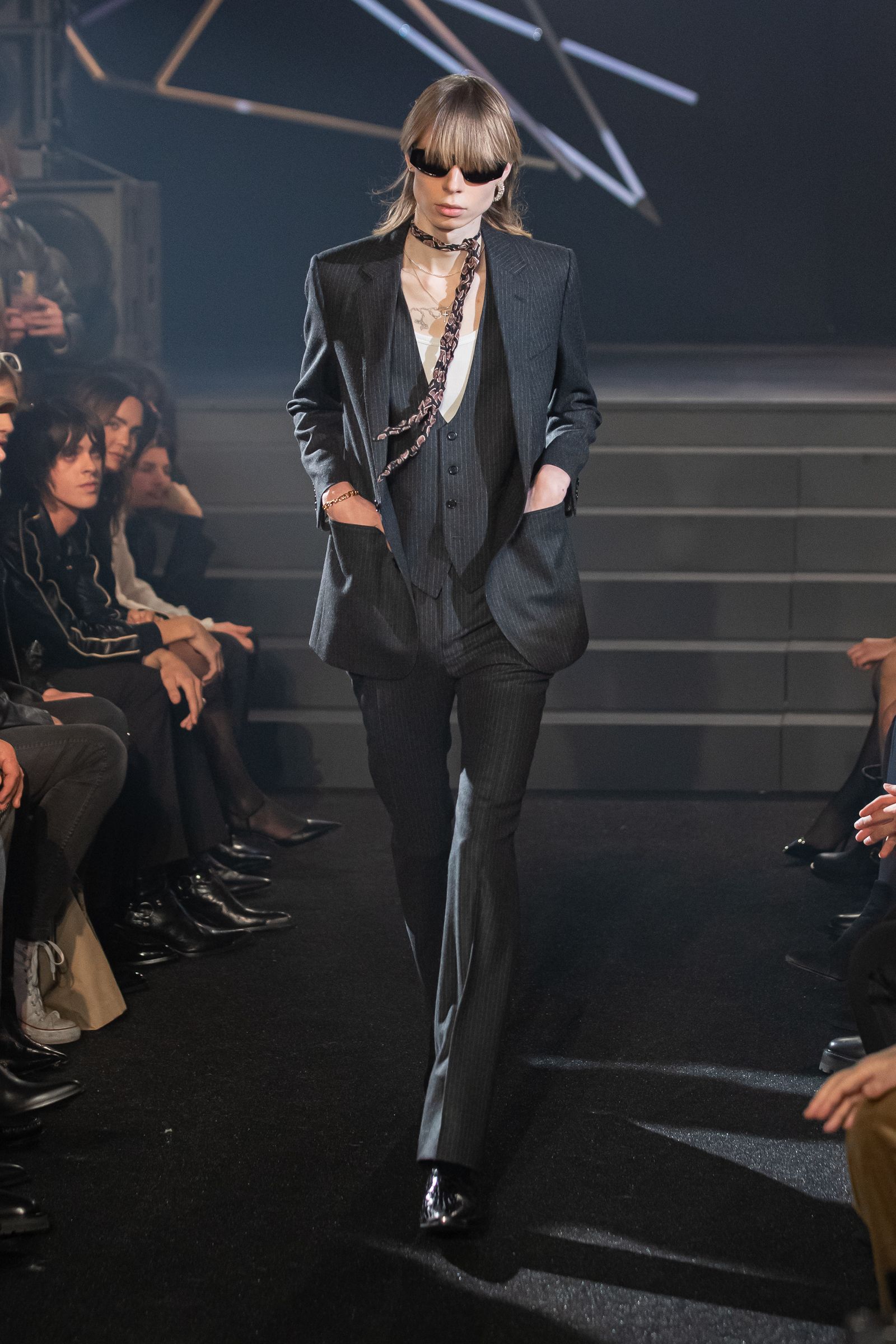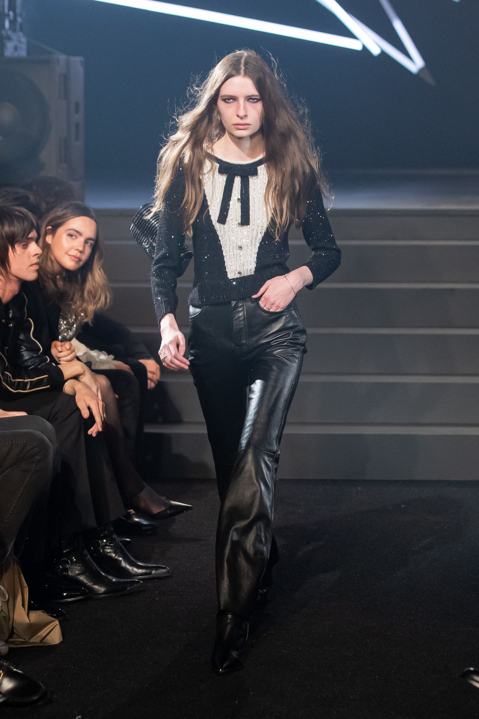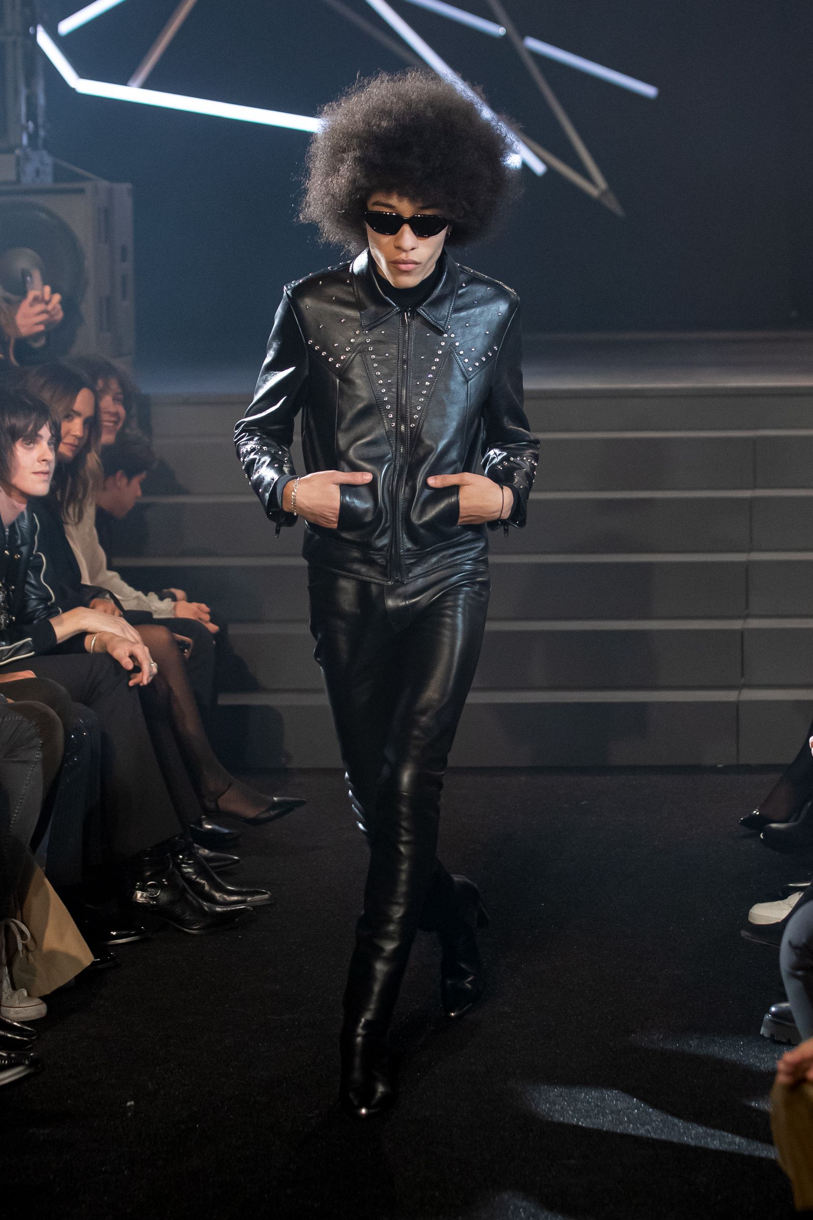 Maintaining a strong continuity with the past, the collection insisted on the theme of the total leather look, with the classic skinny silhouette being decorated with studs or rhinestones. There is no shortage of classic glam details such as an abundance of metallic elements, mesh undershirts, and the omnipresence of animal prints, which, in the case of oversize coats, were recreated using faux fur made of pure cashmere. Elsewhere, most striking was certainly the styling choices that saw these very aggressive garments combined with other more immediately vintage pieces and fabric types: a barbed coat, oversized aviator jackets, tweeds, trench coats and cabanas, pinstripe suits mixing flared pants and raised shoulders. More humorous pieces abounded as well, such as denim jackets constructed like a patchwork, leopard-print ties, and even a T-shirt with a bow tie drawn on it similar to a design Slimane created in his time at Dior Homme. There were also pieces bearing Le Palace branding that will instead be produced in a limited edition. The artwork that decorated many of the outfits, then, was signed by Alan Vega - one of the members of the band Suicide that provided the soundtrack for the show.