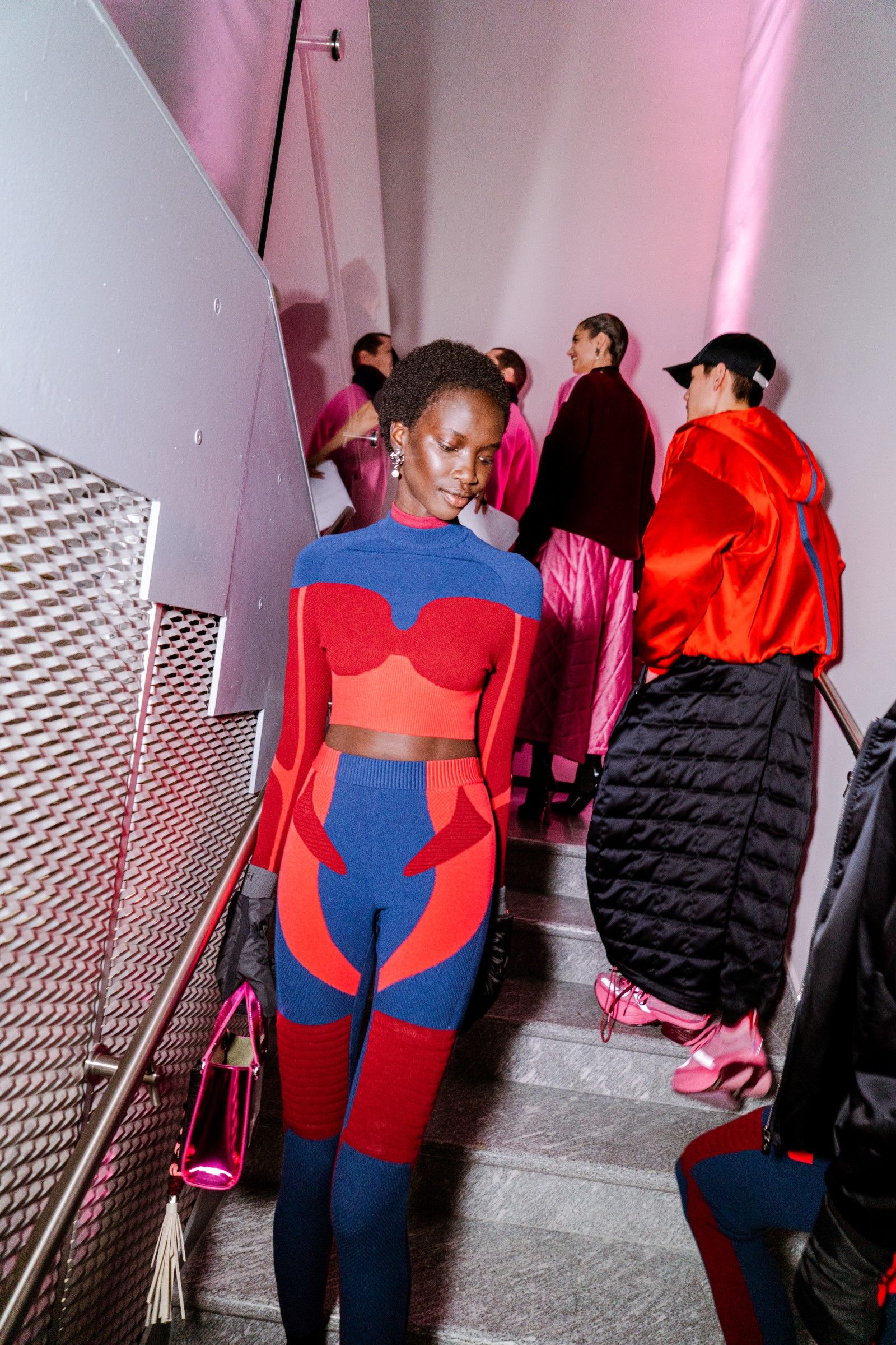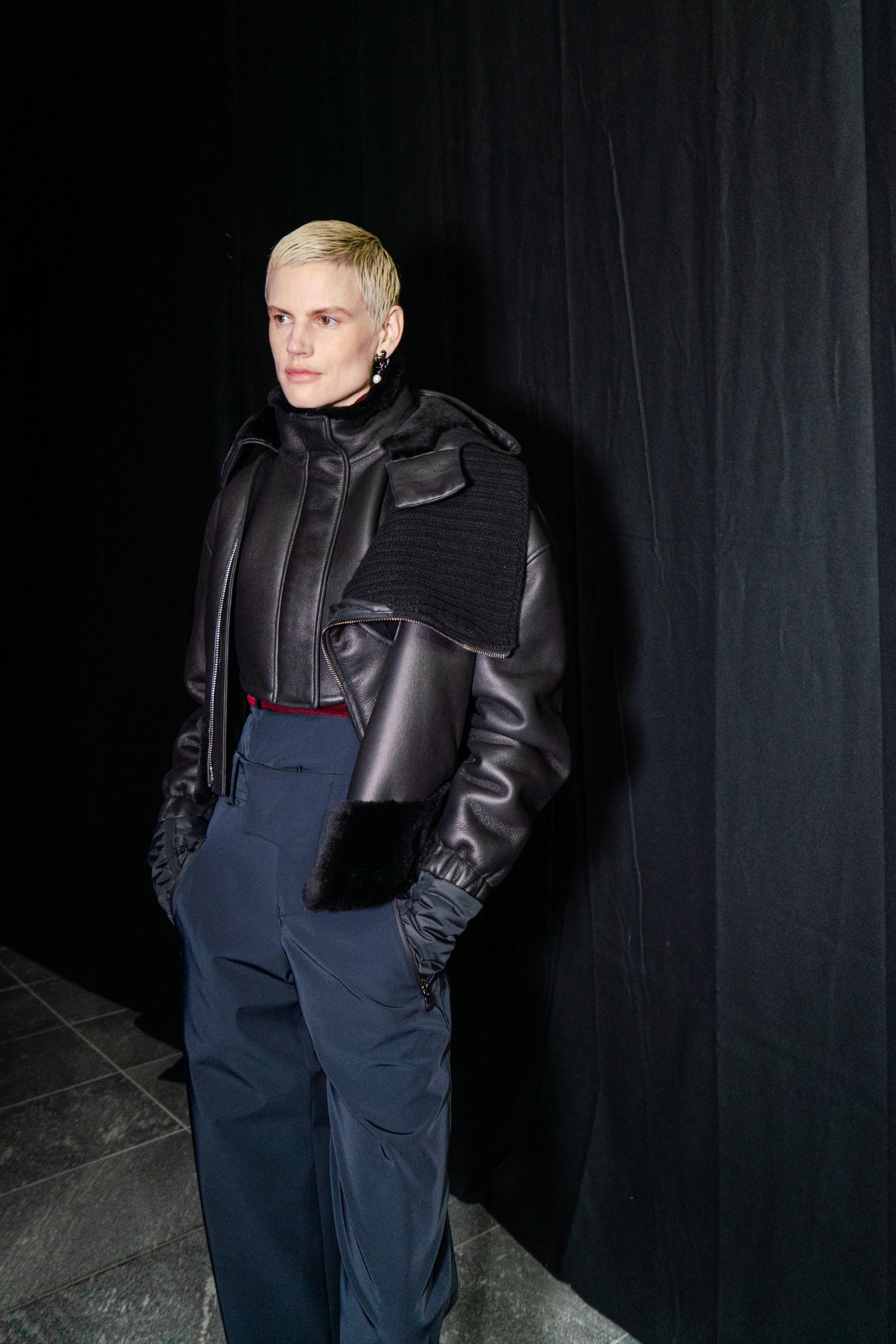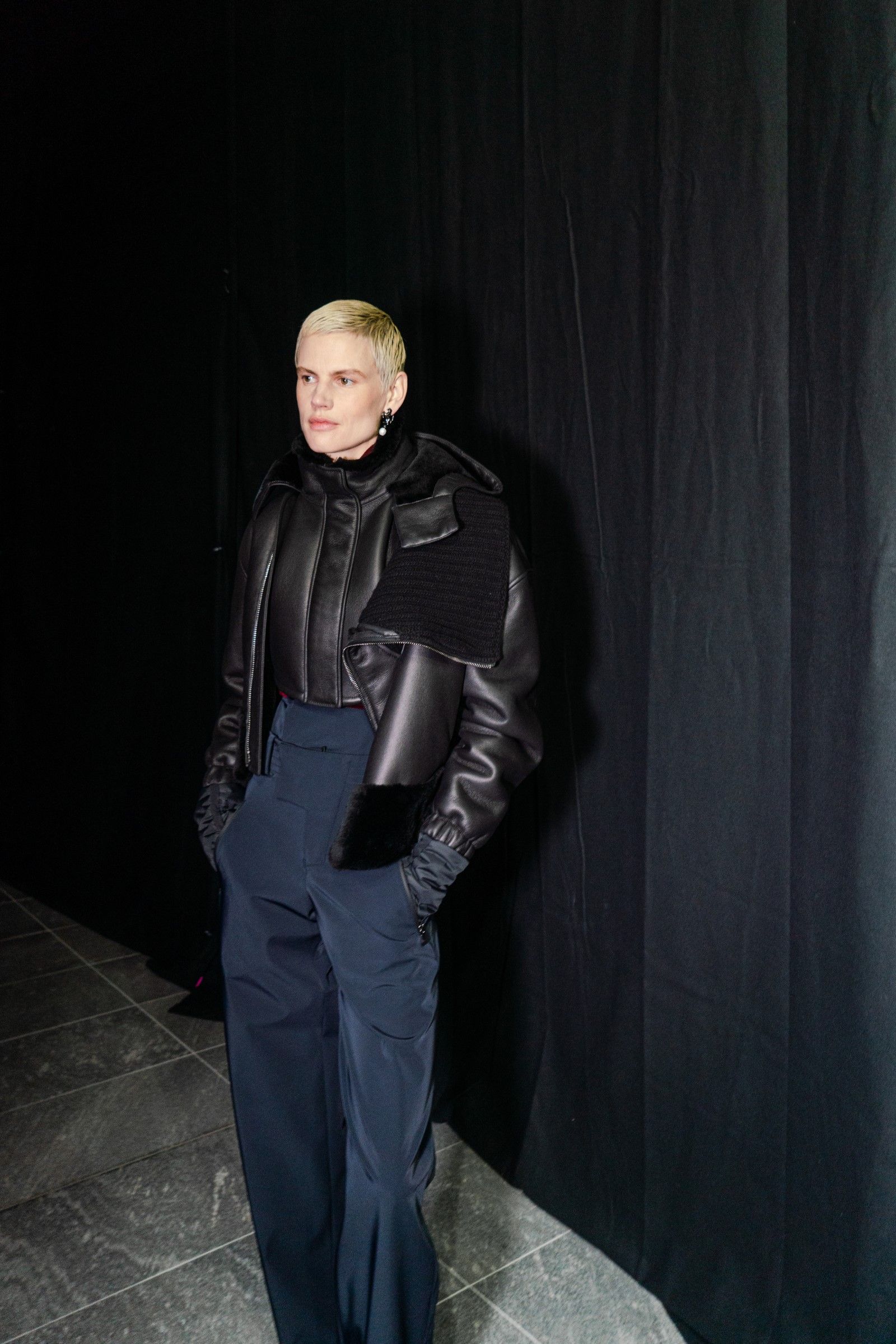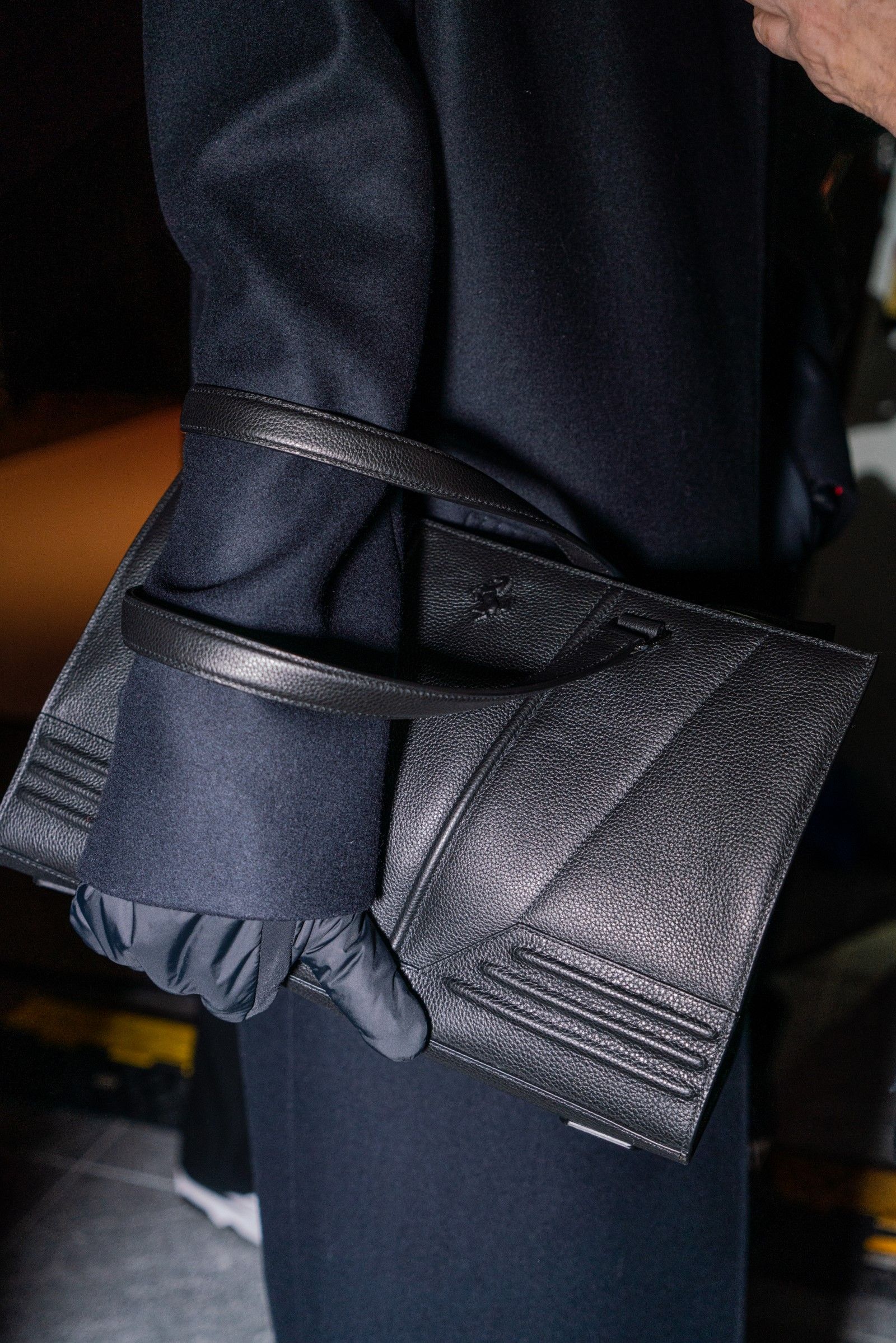 This dialogue between different elements takes place not only between the automotive world and fashion, but also between the collection being presented and its setting. «For the presentation of the FW 23/24 collection, we chose Palazzo Citterio, a place of history, a symbol of the beauty of eighteenth-century Italian art, and as a modern industrial design architecture that well represents the combination of craftsmanship feeling and technological progress at the heart of our collections», Iannone explains. An exceptional location whose values do not need to be "augmented" through a set design, but instead dialogues transparently with the entire collection, also communicating that hyper-sophisticated functionality that the designer has infused into his collections. «In terms of the set-up, the desire was to enhance the work done on the collection and to represent the location without camouflage led us to an extremely clean and rational scenic choice aimed at making the most of the garments». A collection, then, that exemplifies the desire to move forward, almost a meta-reflection on the Ferrari brand that creates an image of itself projected in the midst of progress. When we ask him how he envisions the brand's future, Iannone is confident, responding with just three words: «Dynamic, contemporary, assertive».
