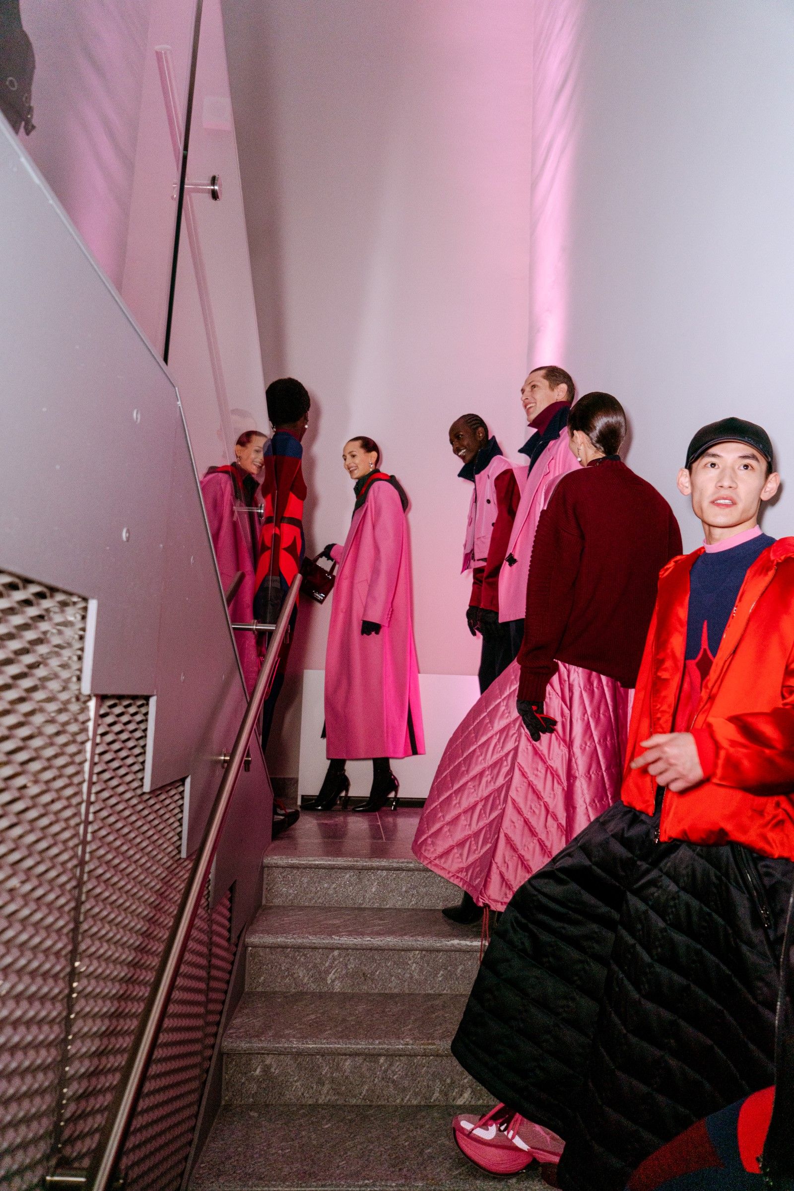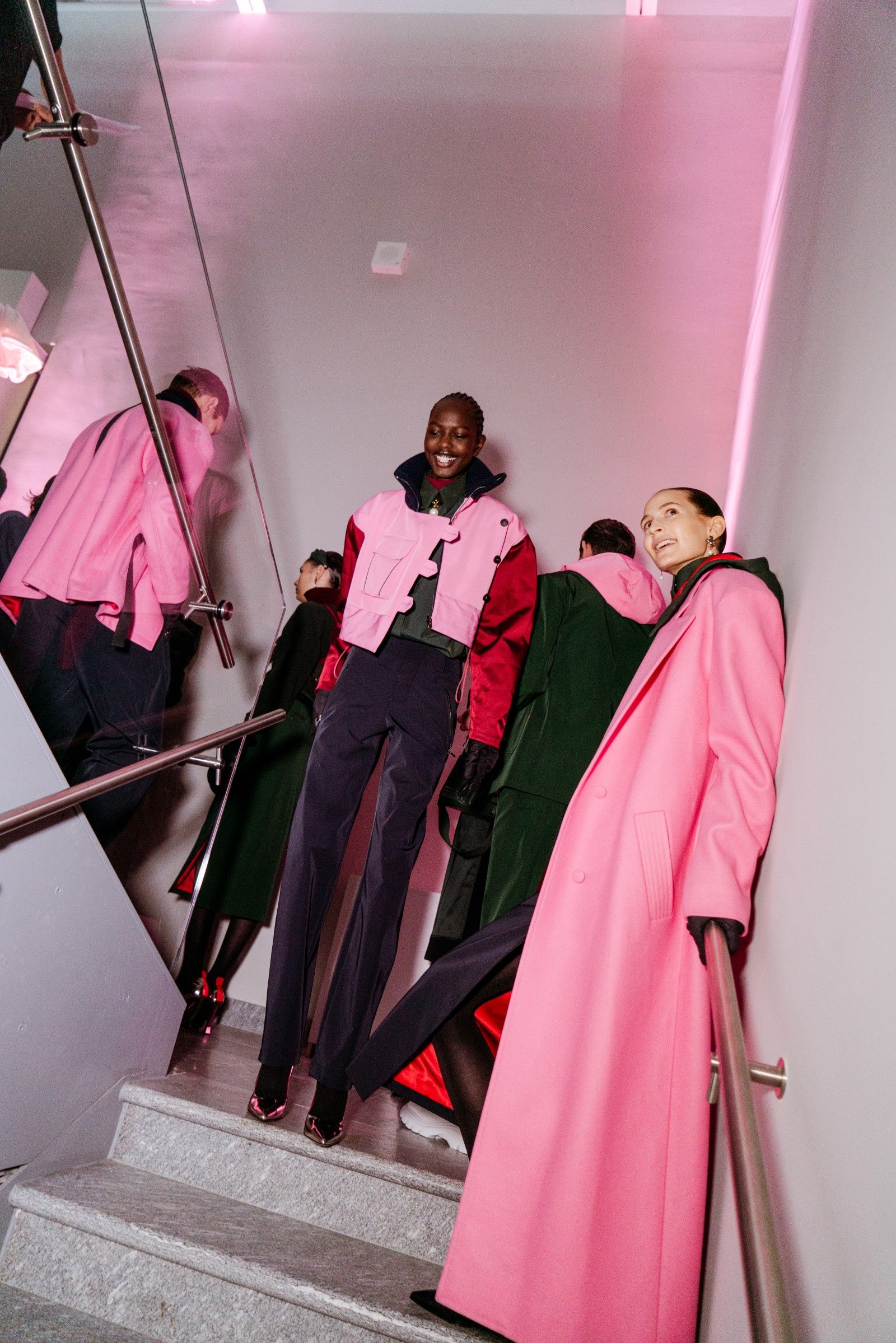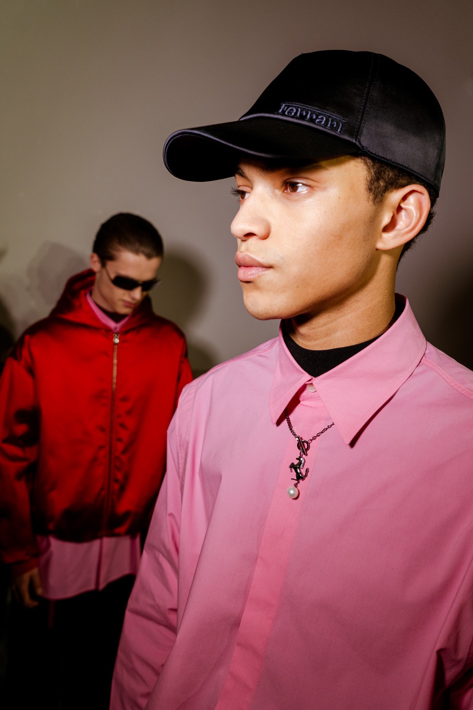 «I have always found it more interesting to explore processes as they occur rather than the end result», says Rocco Iannone about Ferrari's FW23 collection presented last Saturday at Palazzo Citterio in the heart of Brera. The collection focuses thematically on the theme of transition, of the process in the making-dominated by a pink hue missing that seems to be about to transform into Ferrari's red. «In the manifestation of a process, a passage, a transition, it is possible to grasp all the potential that can be expressed. The same thing happens with the concept of beauty, which I have always appreciated more in its fulfillment, in its becoming, rather than when the process is complete». It is clear that, since we are talking about Ferrari, these values of beauty must relate to a cultural heritage that relates as much to the automotive world as to the lifestyle that surrounds racing teams and competitions such as Formula 1. That is why the beauty of Ferrari according to Iannone is related to «to its design, its sensuous elines, its absolute volumes and the balance of forms» which is expressed, then, in a new transition, «in that process of acceleration that propels it toward the speed», beauty in motion. It could not be a Ferrari show, then, without direct communication between the world of automotive materials and fashion. It all takes place within the boundaries «of Ferrari's own mission of eco-friendliness and reduction of environmental impact».