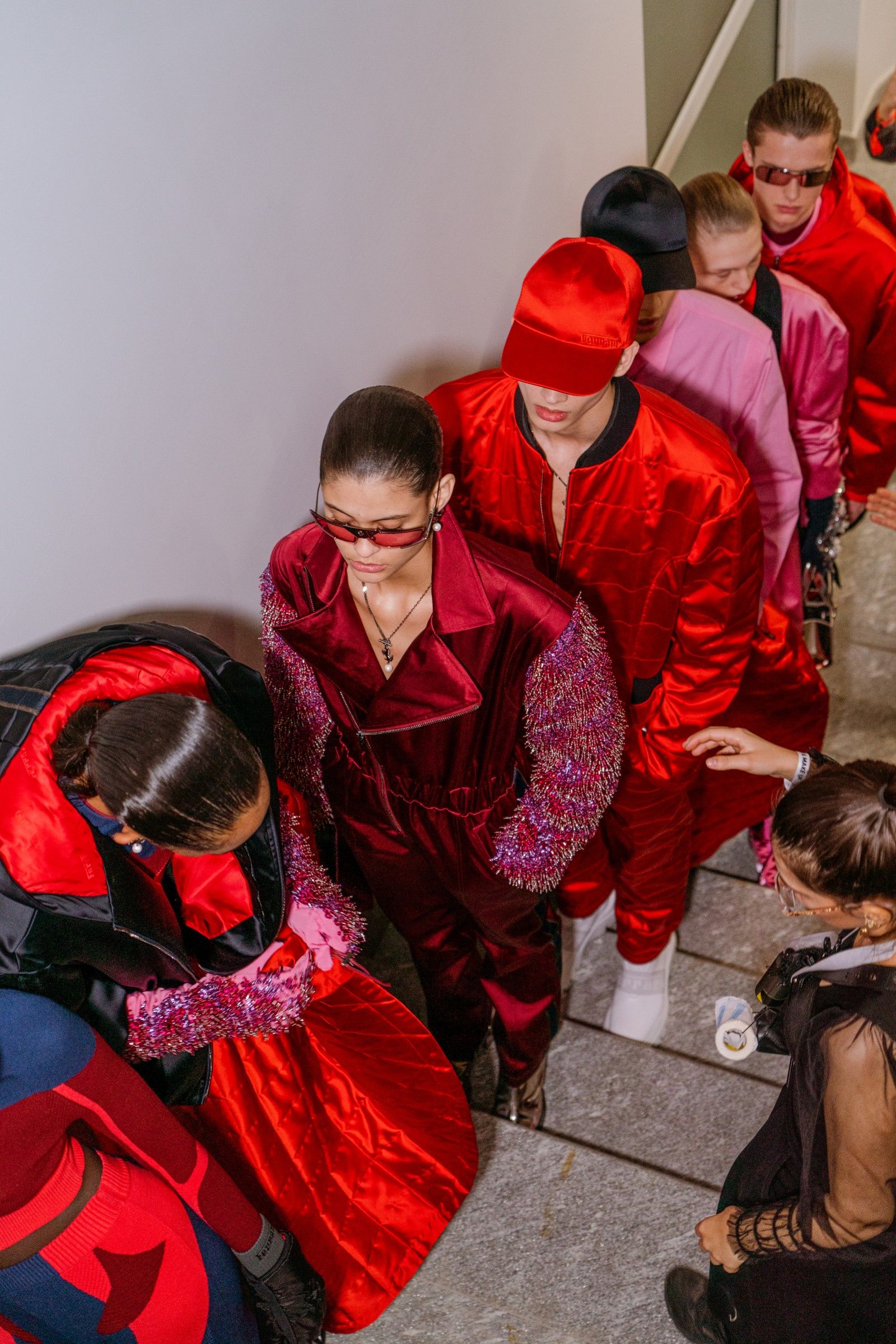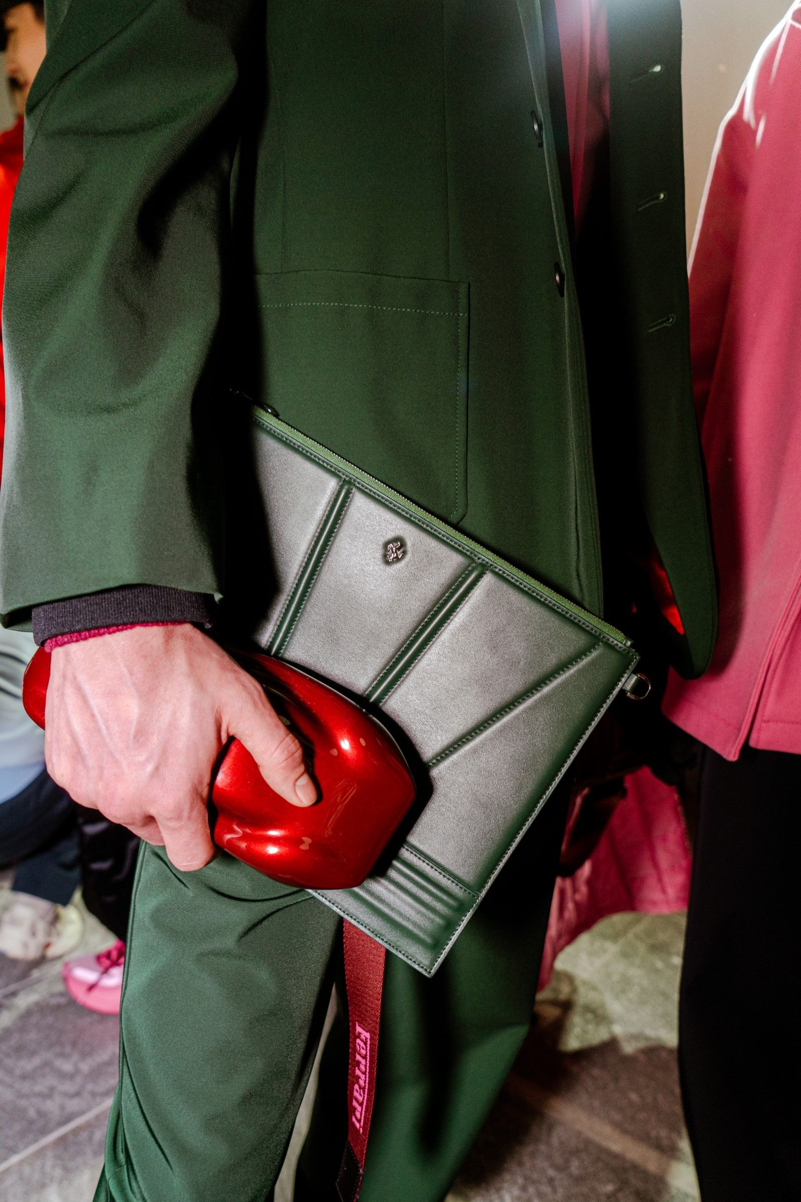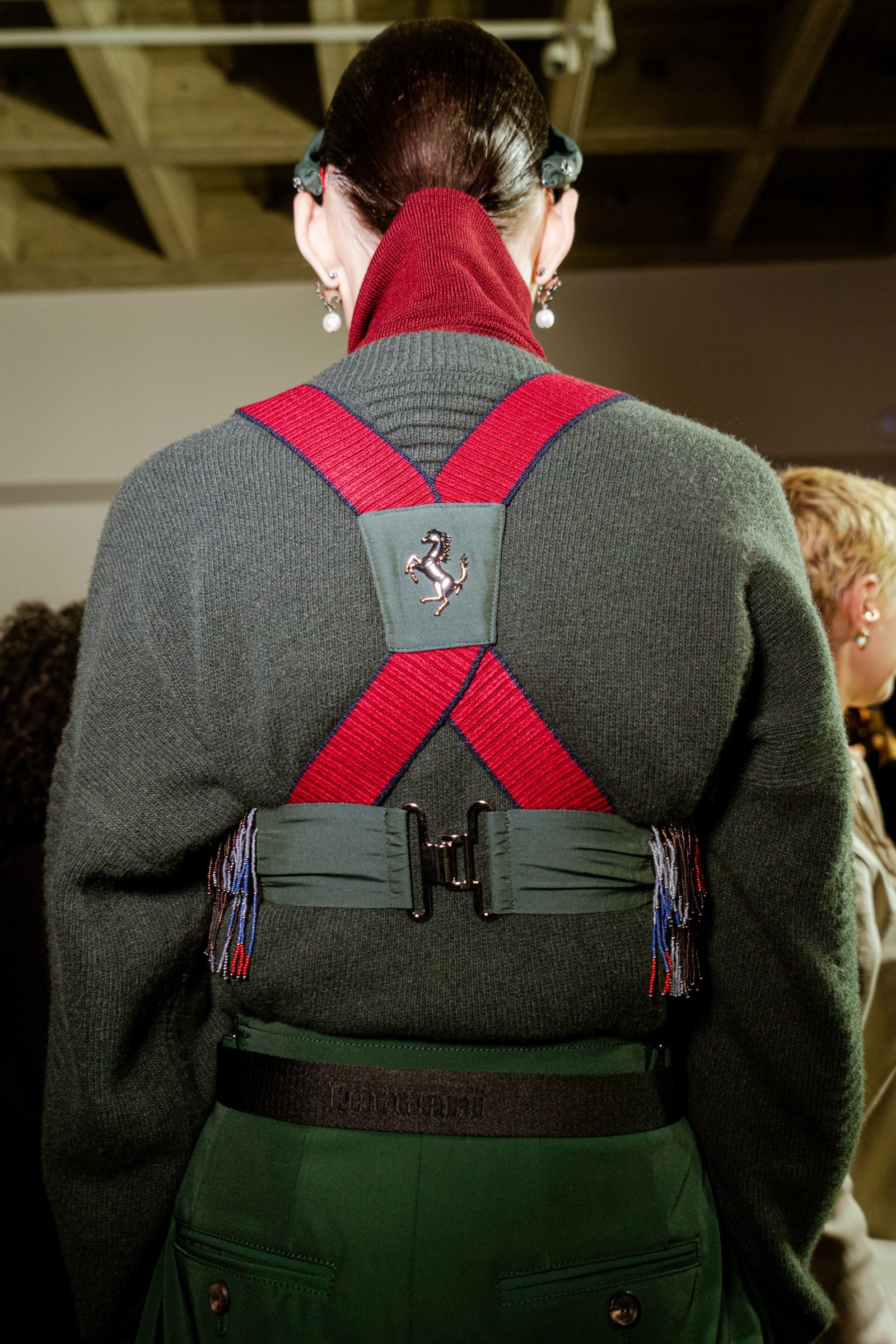 Some examples? Recycled fabrics, cruelty-free leather but also «the Q-Cycle satin, a state-of-the-art certified material derived from the processing of waste tires. Through the action of heat, pyrolysis oil is born from the rubber, which then leads to the creation of the fabric's compositional polyamide. With this process, we limit water consumption and CO2 emissions while ensuring excellent levels of comfort and performance». However, a technical advancement that is part of the overall balance of the aesthetics of the collection and the brand: «In Ferrari's aesthetic ethos, sustainability is itself an expression of beauty, because elegance lies also and above all in the way we decide to produce, to contain our impact, to seek coherent and responsible solutions that can contribute to the circularity and extension of the life cycle of materials that already exist». Chief symbol of the collection, present since Ferrari's entry into fashion is the suit «which is not only the most natural interpretation of the "Ferrari landscape" in fashion territory, but which this season is expressed in as many as 6 looks through different treatments and aesthetic approaches: from rubberized leather the Q-Cycle satin, all the way to the fully embroidered version». But the entire collection ultimately represented new and different applications of Ferrari's vocabulary and narrative that include «include the revisiting of workwear, very close to the Ferrari world, which is grafted into tailoring to contaminate it. And then the use of color, the iconic Ferrari red caught in an earlier stage, before it becomes red, as dynamic pink».
