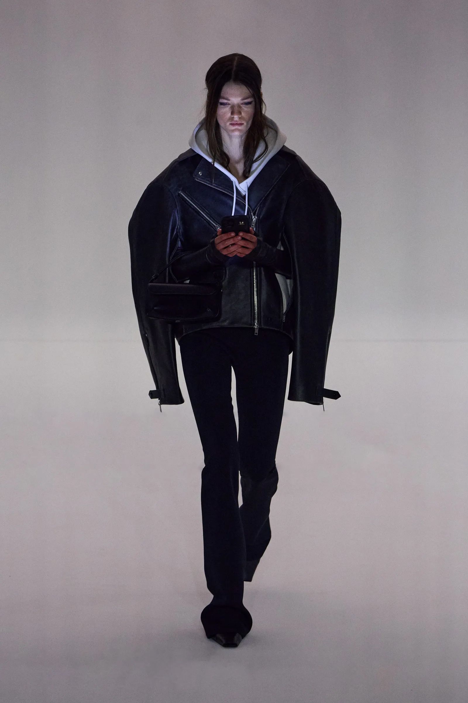 In a completely dark room, a model emerges from a wall of mist holding a smartphone. Her face is illuminated by the light of the screen, while a Siri-like voice repeats the phrase «Is the sky blue?» on a loop. Nicolas Di Felice, creative director at Courrèges from 2021, does not do things by halves in his reflections on our daily relationship with technology: «I am not judging, but I am questioning myself and I wanted to try to think about the subject» he said on the sidelines of the show. A few hours later, Jonny Johansson also did something similar, addressing his relationship with nature and the way we are getting further away from it in the Acne Studios Autumn/Winter 2023 collection. «For this collection I was thinking about the dark winters we have in Sweden, where the light only lasts a few hours» the designer shared. «I have always liked the contrast between nature and urban life, the idea of an endless forest just around the corner. In Scandinavia, nature often collides with the city: the playground on one side of the building and the forest on the other. But living in such close contact with nature is becoming increasingly rare in our modern world.»