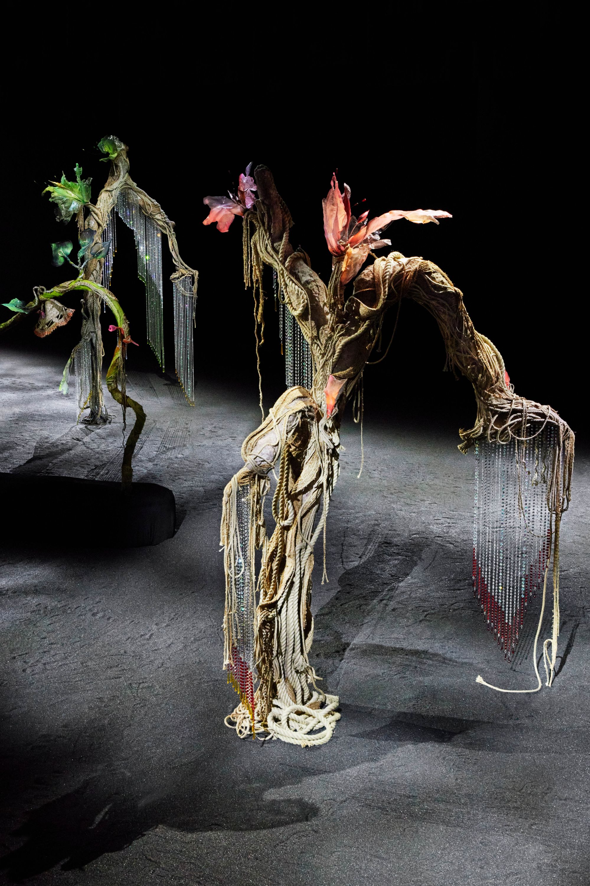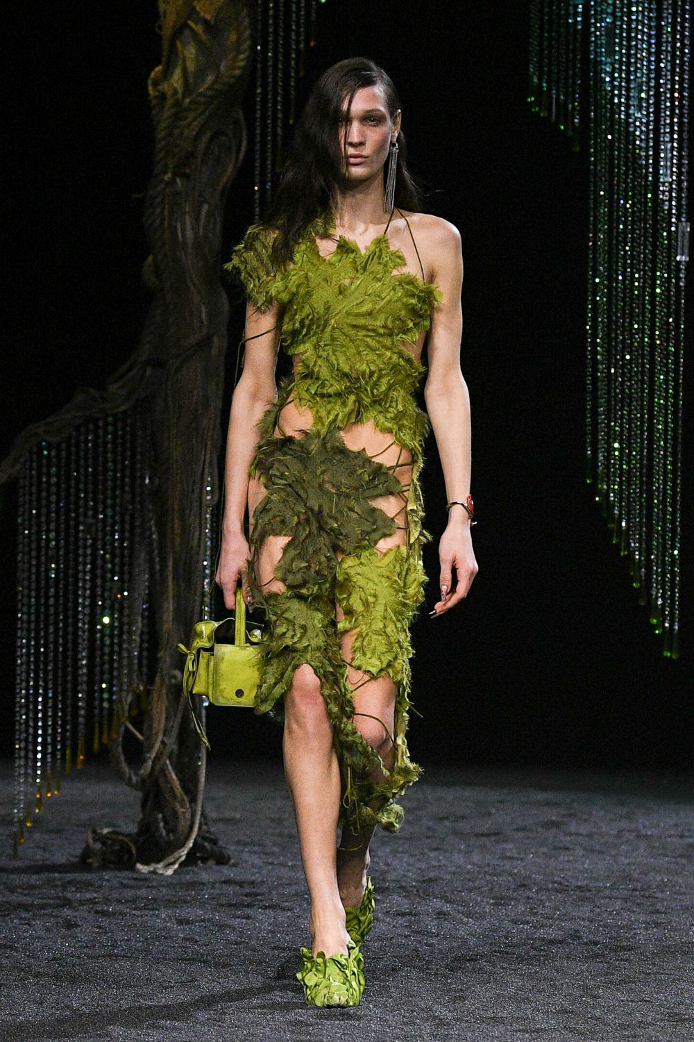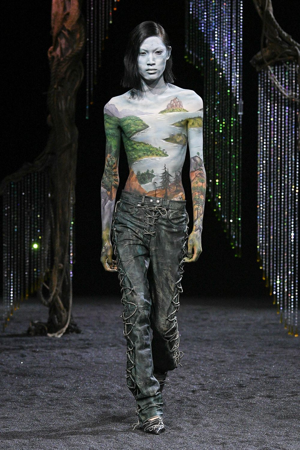In practise, both collections interpreted this kind of rejection of technology in their own, almost opposite ways. At Courrèges, jackets and sweatshirts were designed to free up the hands that held smartphones in many looks, continuing the narrative of the show, while at Acne Studios, nature took over and invaded the set design and looks on the runway. Similar to The Last of Us, when civilisation collapses and nature reclaims its place, the set designed by Shona Heat was reminiscent of the forests that were part of Johansson's childhood, which are «ever changing, growing and transforming»as the Swedish designer put it. The colour palette of earthy greens and browns was inspired by rotting leaves and tree roots, while the fabrics that make up the clothes have been treated to look as if they have been ruined by dirt and rain. Nature also came into play in the accessories: discarded cans became earrings, bottle tops ended up on necklaces and wool hats resembled giant mushrooms.