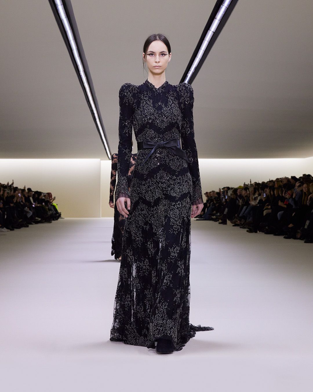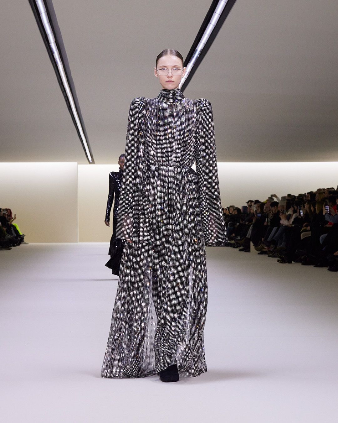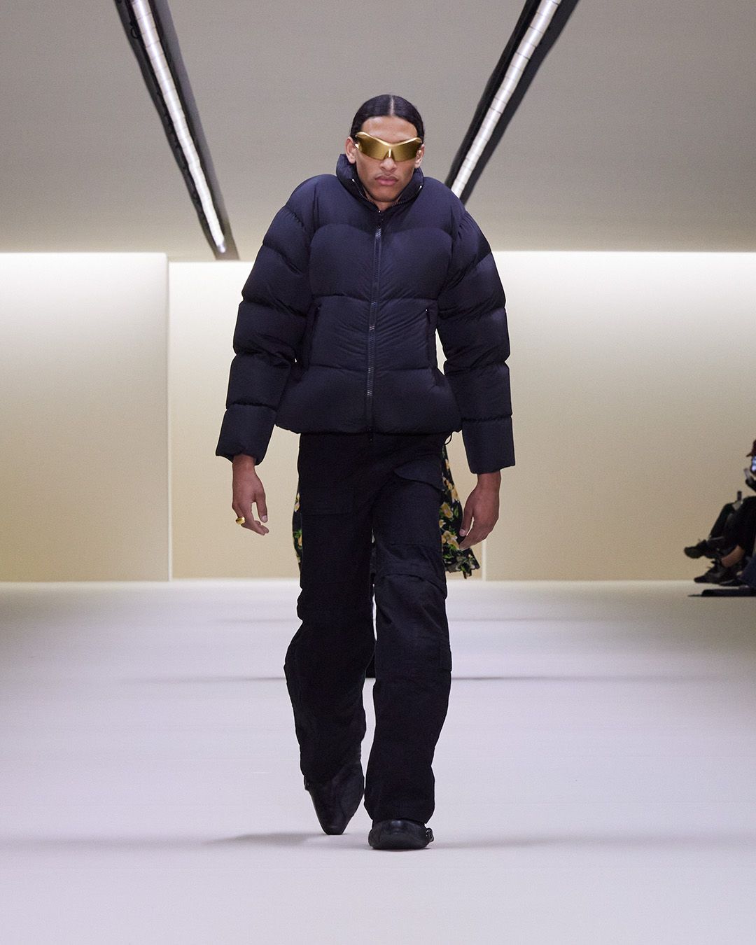 «Fashion has become a kind of entertainment,» said Demna in a strange statement somewhere between a general statement and an admission of guilt from those who that form of fashion understood as excess had brought it to its point of no return. Scandal or not, there was a need for a change, a return to basics without celebrities, without memes, and without provocations after a collection, Summer 23, made of far too many stylistic and scenographic coup de théâtre. Stripped, then, of its most provocative aura, Demna chose to traverse all the souls of Balenciaga, playing in the second part with many of the symbols that had decreed its success: the exaggeratedly pronounced shoulders return this time through inflatable inserts inserted in hoodies, biker jackets, and tracksuits, as do the pleated floral print dresses and trench coats that envelop models and models on the runway. In the finale, eveningwear echoes Cristòbal's couture and heritage with floor-length dresses studded with sequins and crystals, pearl bangs, and lace inserts. In a fashion that seems to be aiming more and more at simplification in favor of collections that aspire to immortality, Demna has therefore chosen to look back, choosing to take up and elevate some of the topos present in her best collections, as in the case of Spring 20202 and the subsequent Fall 2020.