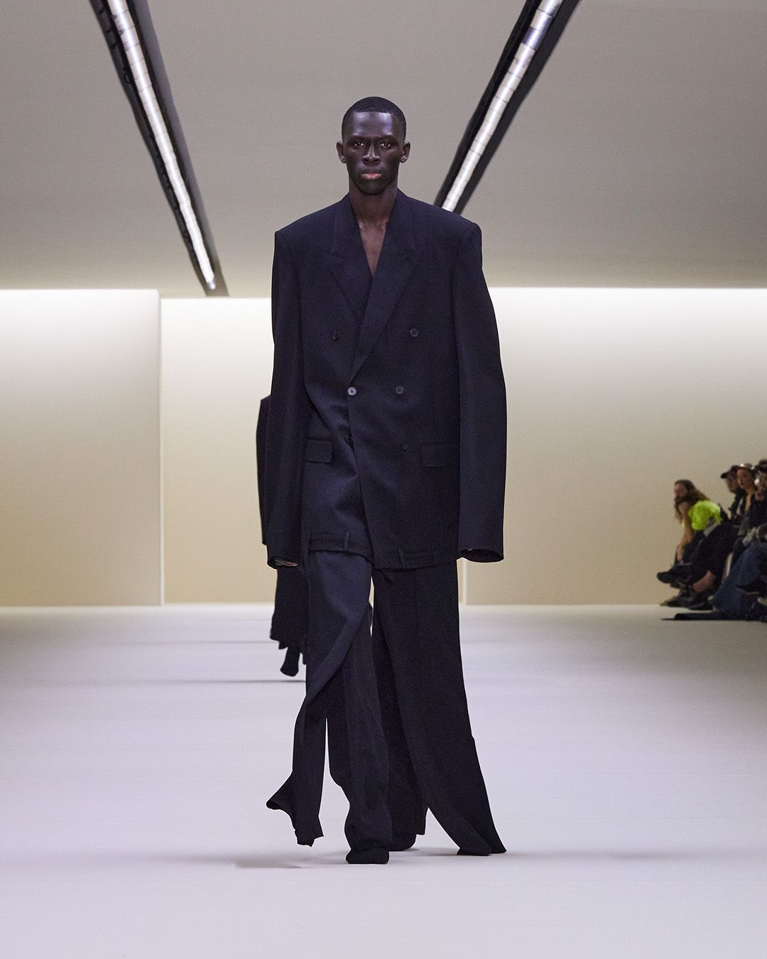 To shout, however, at downsizing, at the "step back" of a designer in penance who chooses to creatively flog himself to atone for his sins is to have never gone beyond the most superficial layer of Gvasalia's work, merely judging his work from fifteen minutes of a show. We need only go back to Resort 2023 to see in the Garderobe collection a glimpse of what we saw yesterday. The difference, if we really have to find it, is that in that case the minimalist designs and the absence of logos in plain sight (believe it or not, someone complained about it) were lost within a larger machine, perhaps even too much so that it ended up engulfing Demna's work distorting our perception of it. Having overcome the months made up of TikTok videos of burning sneakers and cut bags, now for the Georgian designer and for Balenciaga itself the real stumbling block is redefining the identity of the brand whose soul seems split down the middle: on the one hand, the need to find a stylistic and creative calm that keeps media attention at bay, on the other the spasmodic need to find the love of those who, after yesterday, feel betrayed. If today Demna seems safe from the winds of dismissal that blew in the winter months (the designer himself said «I'm not going anywhere, it's not goodbye»), his future and that of the brand itself remain deeply tied to the redefinition of Balenciaga's DNA.