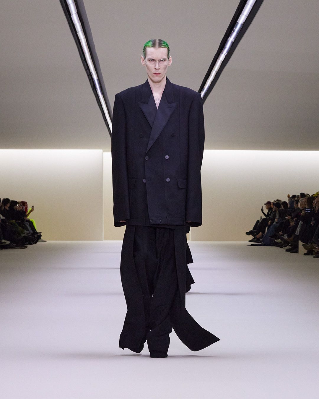 «In the last couple of months, I needed to seek shelter for my love affair with fashion and I instinctively found it in the process of making clothes.» This is how Demna, in the statement that accompanied the Fall 2023 collection, presented Balenciaga's return to the scenes a few months after the scandal that had undermined not only the brand's commercial strength but also the certainties of the Georgian designer forced (either by himself or by Kering's top management) to return to the origins of the maison and his work. That tailoring would be at the center of the collection we have known for some time, first with the river interview given to Vogue by Demna himself and then with the invitation that winked at the art of tailoring with the paper pattern of a jacket. The jacket was indeed the star of the first part of the show, the one dedicated to tailoring made of deconstructed and reconstructed garments, the lives inverted with hems and doubled pants. With Eliza Douglas opening the ranks in an austere set shrouded in silence and toile, the feeling was that of witnessing a reset.