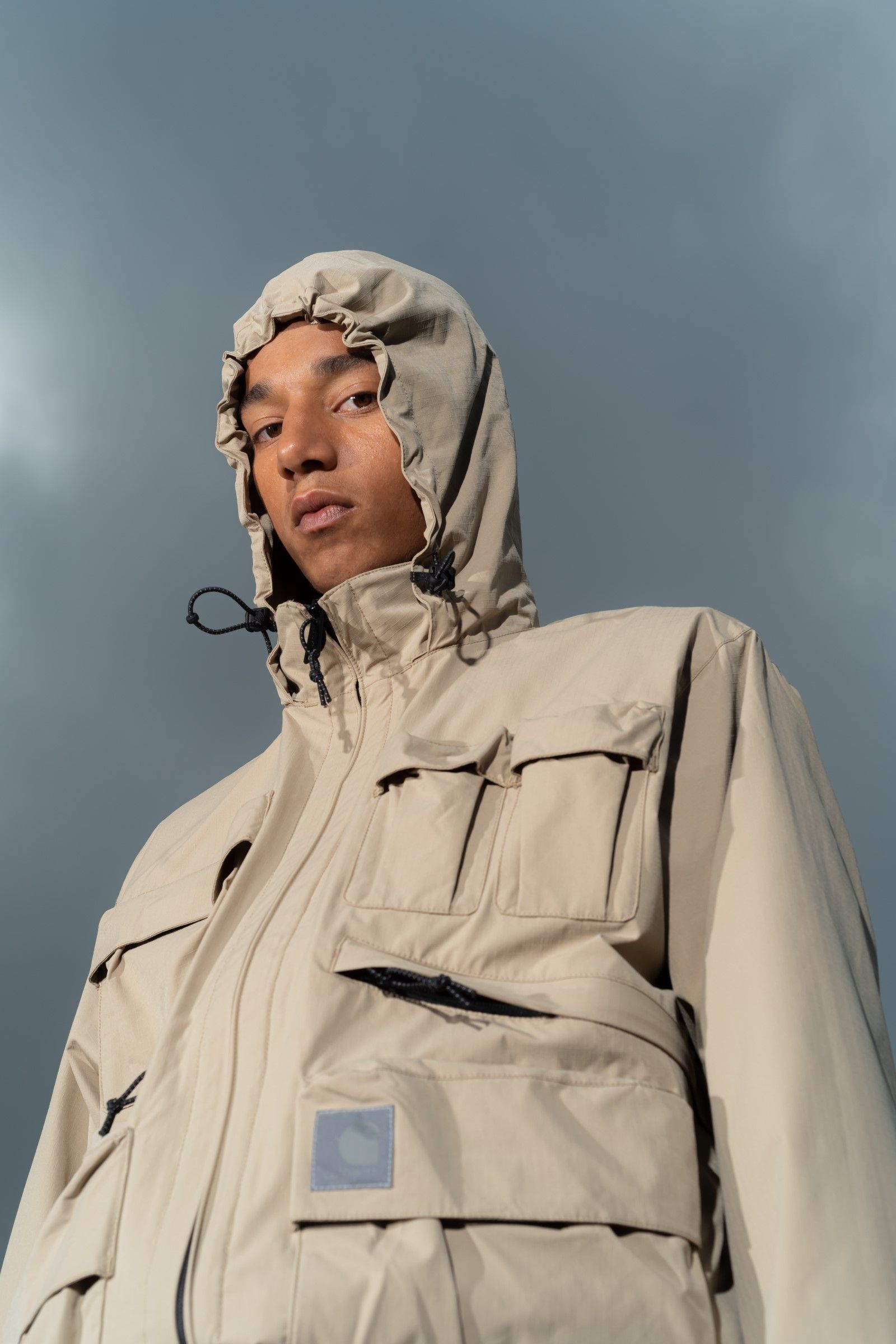 The dominant silhouettes are roomy and functional, with Wynton's ripstop cotton jacket and parka styles featuring hyper-colored reverses. While garments such as the Idaho jacket and pants are decorated with embossed pockets and reflective details. A new addition, however, are the Council Pant inspired by Carhartt's classic workwear but produced in lightweight canvas. On the womanswear side of the collection, however, is the new Skyler Liner in ivory recycled ripstop polyester.