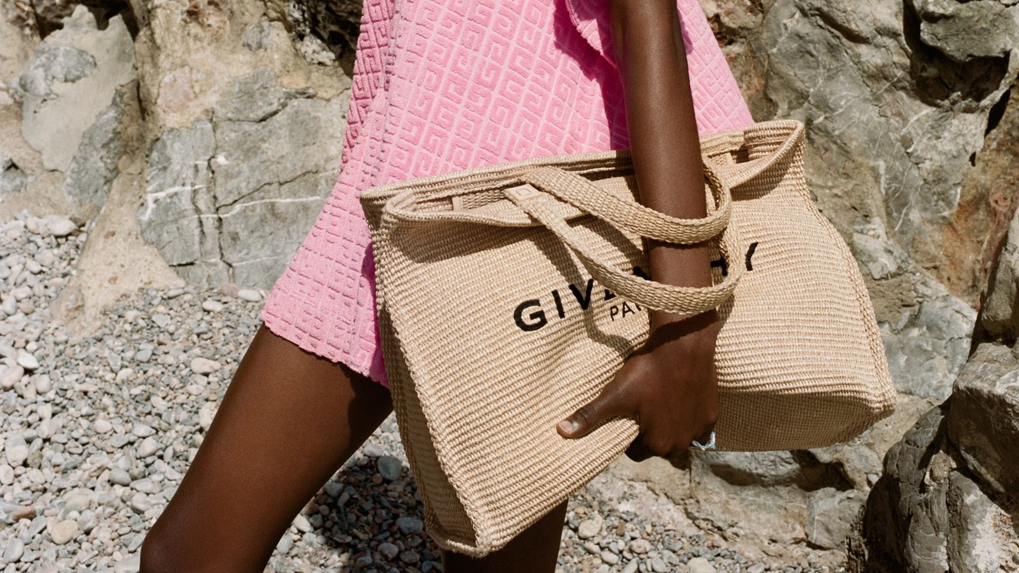 Linen, one of the couturier's favorite materials, is knitted into bikinis and cover-ups in black or sandy beige, accompanied by a fisherman hat or the season's Givenchy raffia tote. Two prints dating back to 1955 are reimagined for Givenchy's contemporary customers. Trompe l'oeil pearls return on a caftan, sarong, or bright pink dress, and on a transparent t-shirt; a theme echoed in pink and pearl on a handbag or canvas beach sneakers. The collection also includes essential accessories such as the straw basket version of Givenchy's new Voyou bag, Marshmallow wedges, and the classic G-Tote shopper. Sporty mesh duffel bags, sneakers, and a fisherman hat in cool gray tones complete the theme. Overall, the Givenchy Plage collection offers a range of elegant and sensual summer pieces that bridge the gap between the beach and the city.