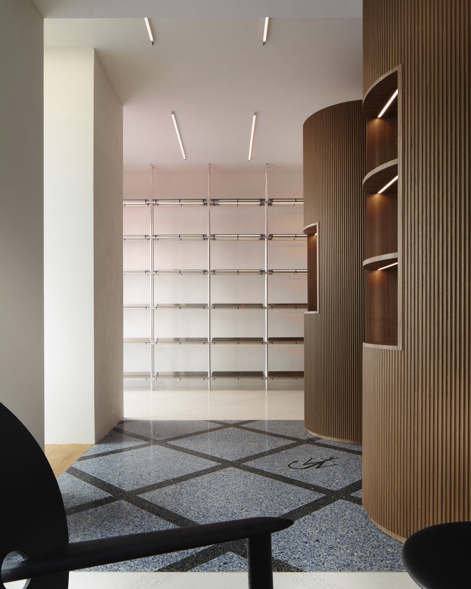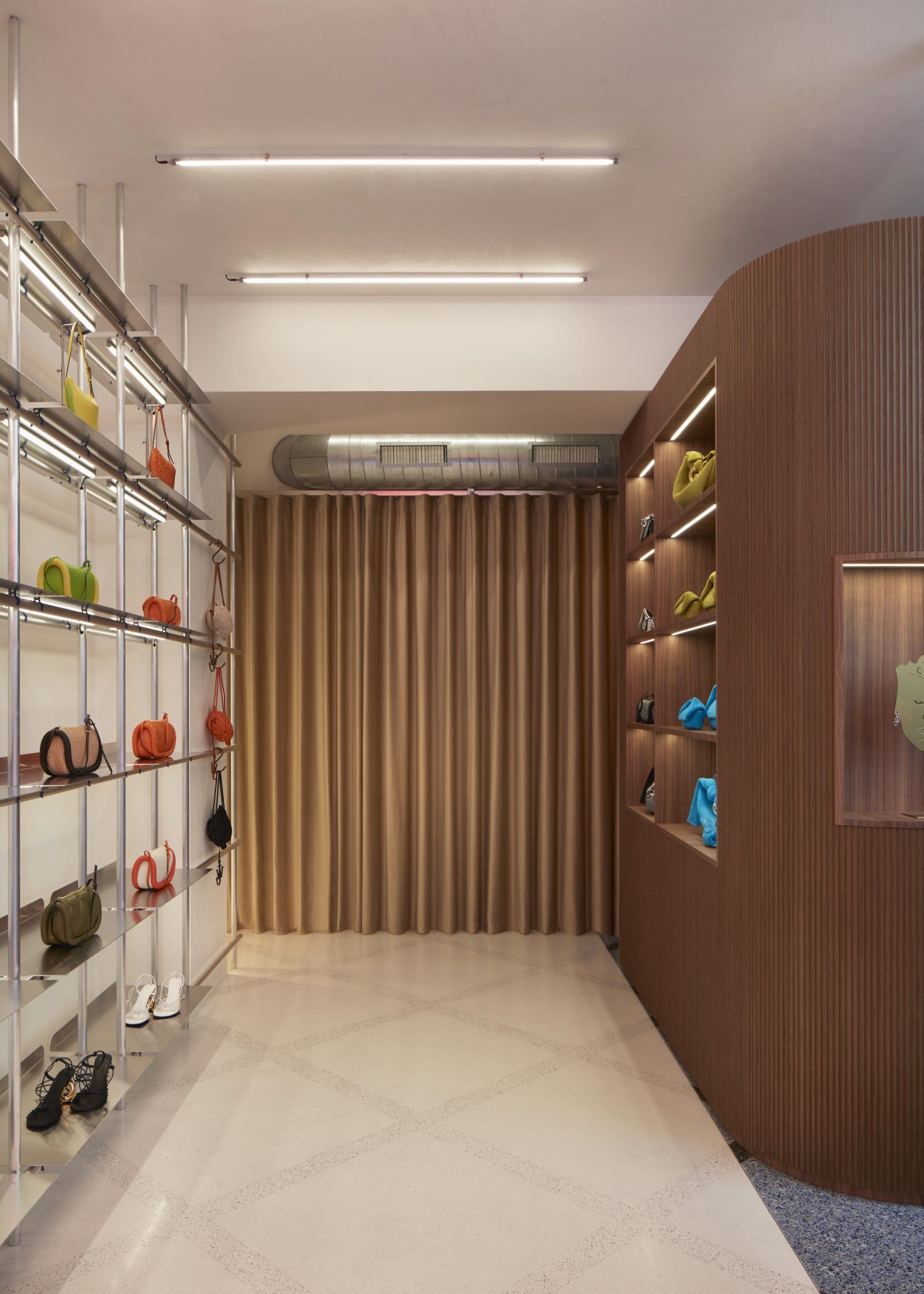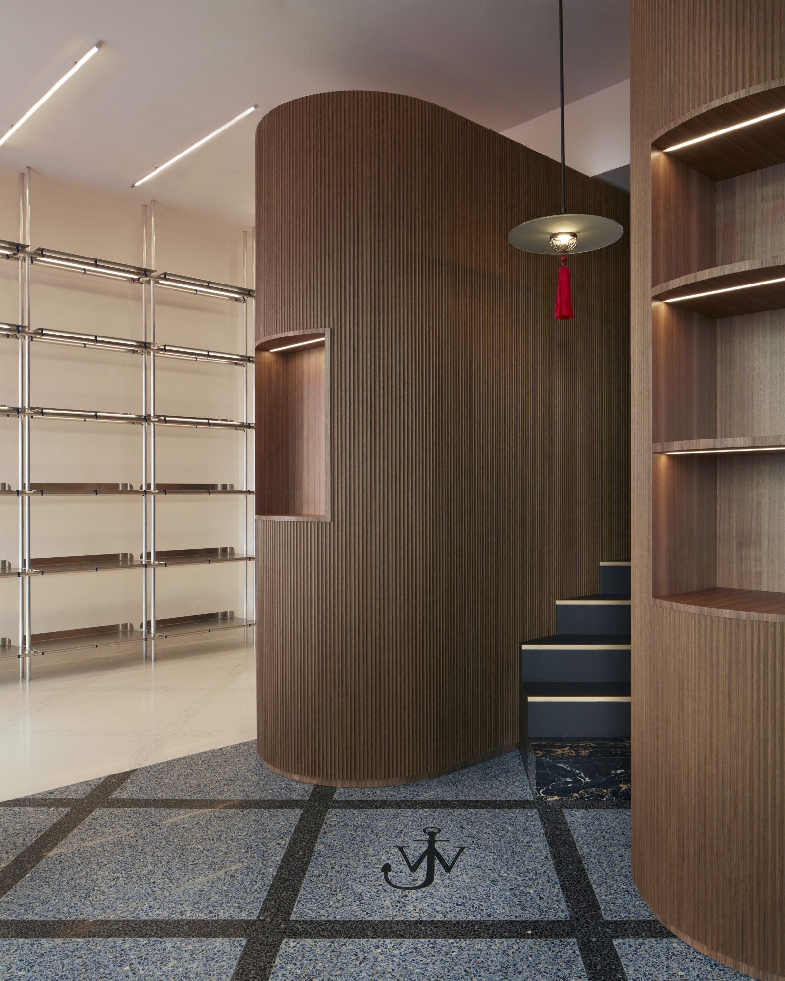 For Jonathan Anderson, the city of Milan is becoming a second home. Today the brand will open its second boutique in the world at 16 Via Sant'Andrea, in the heart of Milan's Fashion Quadrilateral, designed by 6a Architects, who had already signed JW Anderson's boutique in London's Soho district. For the store's aesthetics, inspiration came from the surrounding architecture and its exquisitely Milanese tones: aluminum shelves and displays, a neon sign on the facade, a handmade tiled marble floor in a blend of custom colors, and walnut fluted panels lining the two columns inside the store.