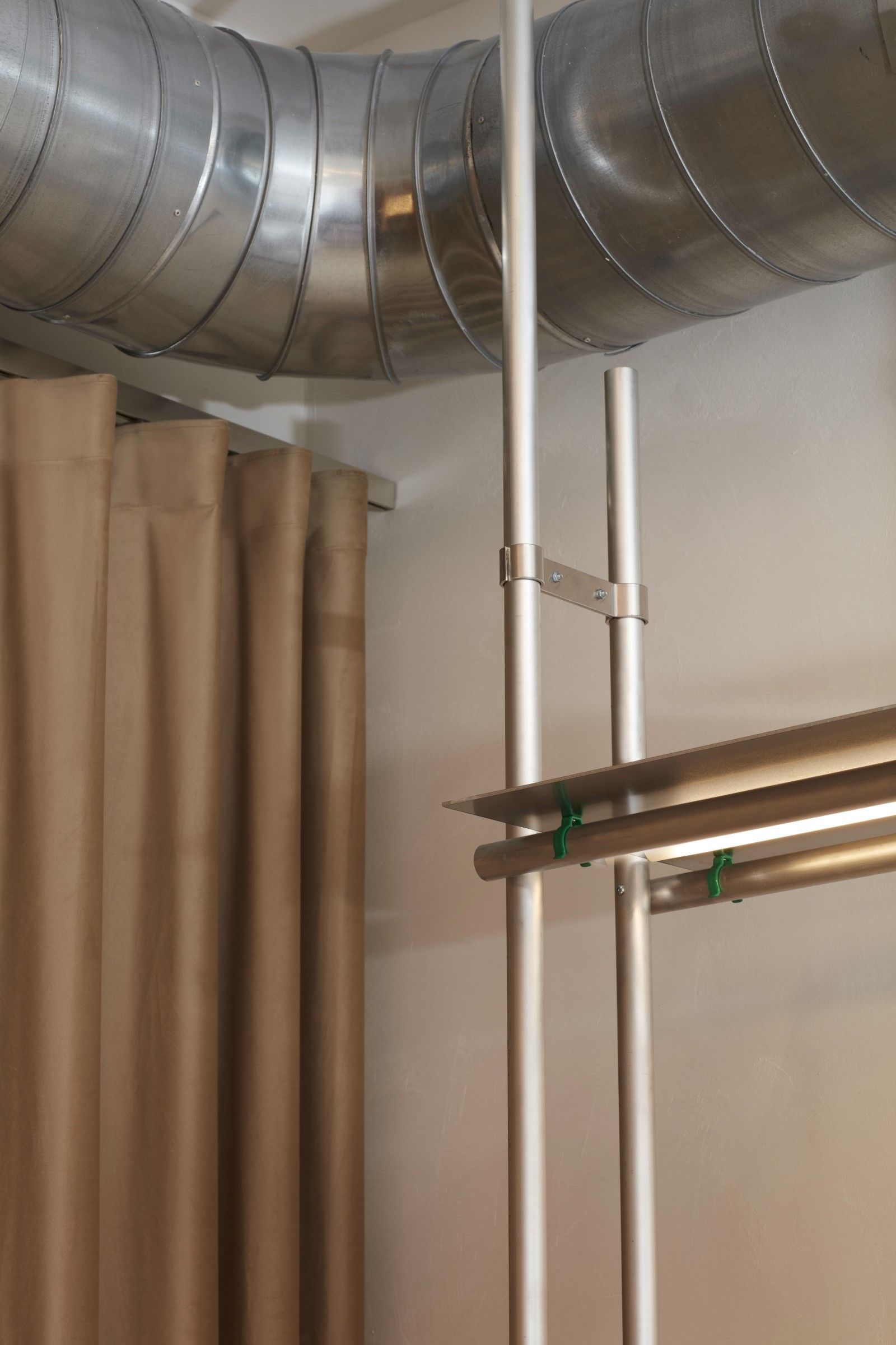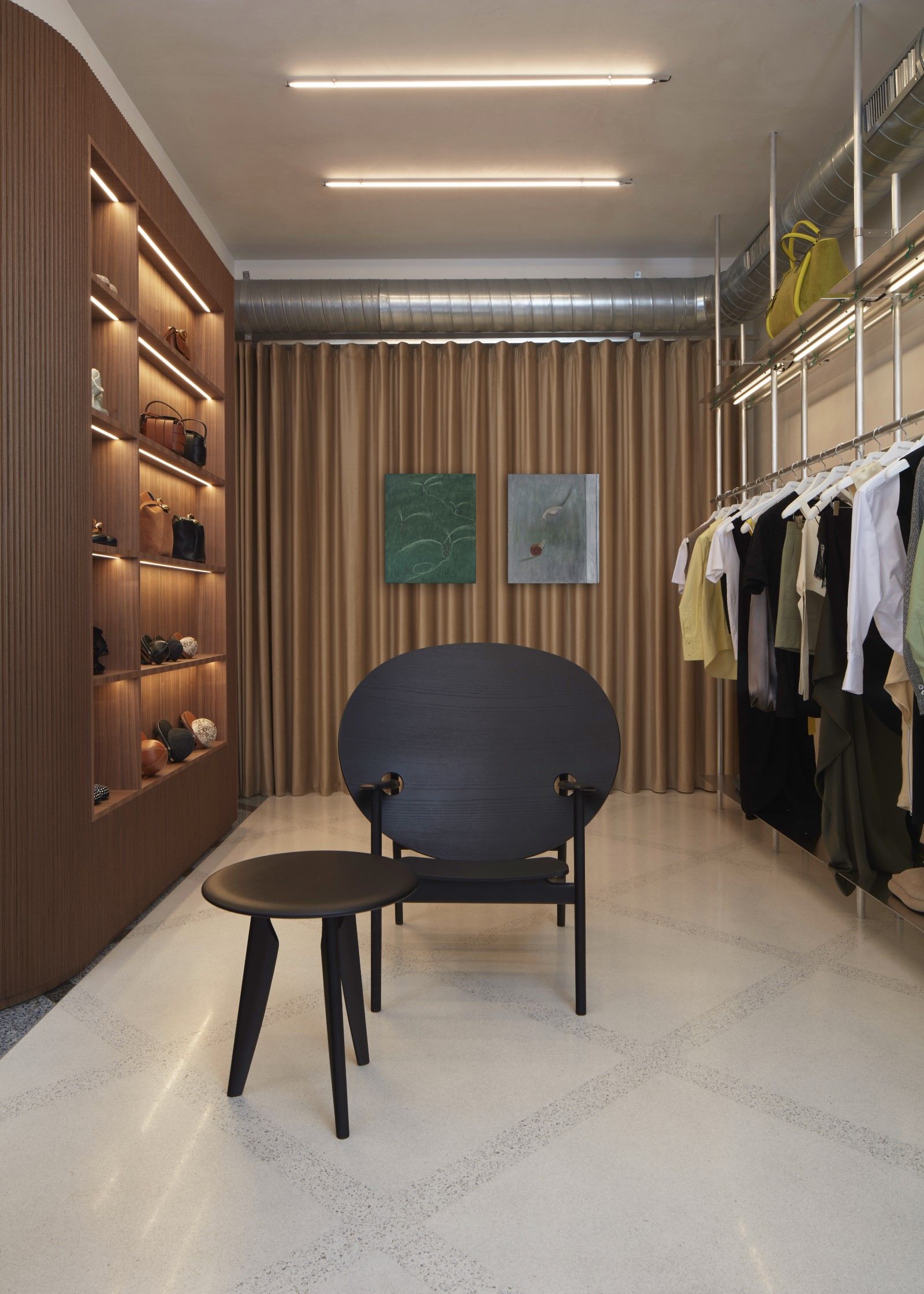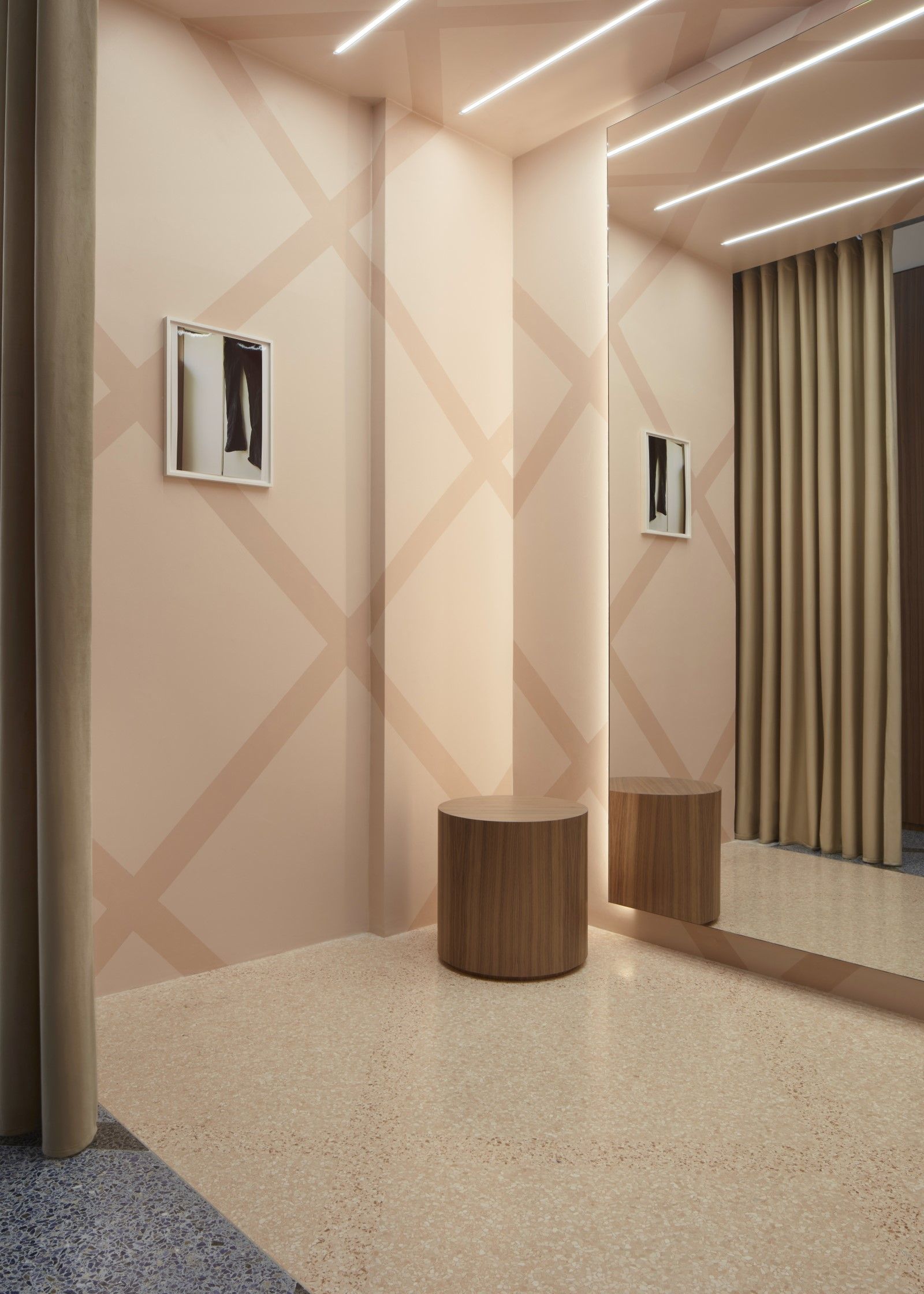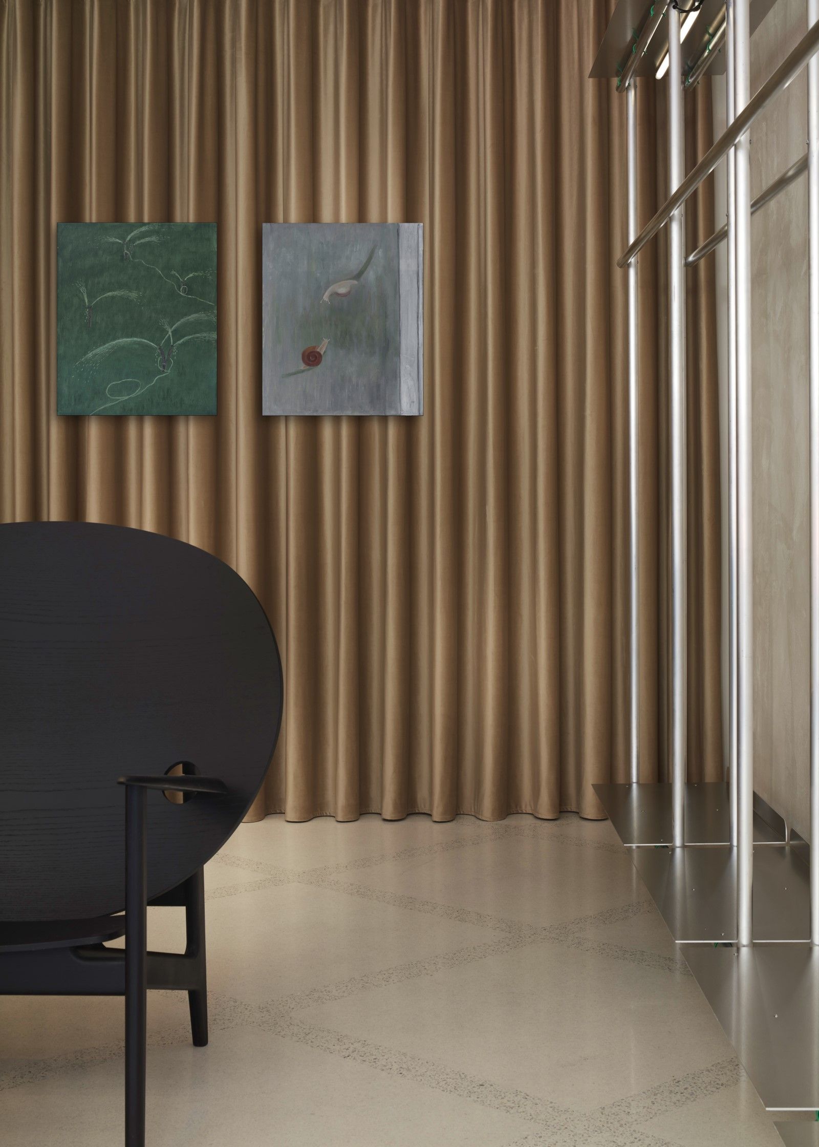 The décor is minimalist and Italian-inspired, with a touch of self-deprecation: the Cardinal Hat hanging lamp by Lutyens Furniture illuminates the main room, while the black Iklwa chair by Mac Collins and matching side tables by Benchmark Studio, with their commanding presence, recall the classic drawing room perbene of bon ton Milan. Two oil-on-canvas paintings by artist Hongyan on the walls, in delicate shades of green and gray, decorate the walls, accentuating the cozy, almost domestic feel of the space. In the dressing room, Wolfgang Tillmans' images create a contrast, reaffirming the stark juxtaposition as a hallmark of JW Anderson.
