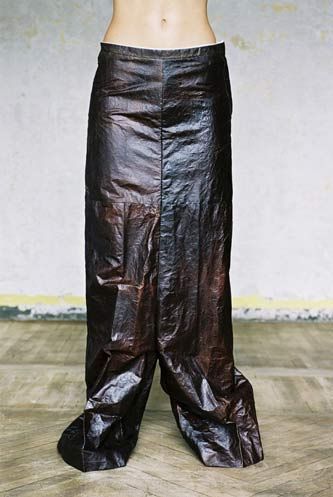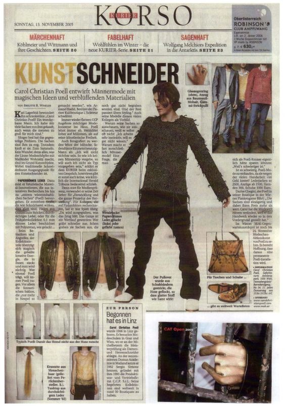 After studying first in Graz, then Vienna and finally Milan, in 1995 he met Sergio Simone with whom he founded his brand CCP. From this moment on, his avant-garde and radical fashion could fully manifest itself, developed on the concept of material and its constant transformation. Even though these are ready-to-wear collections, the precision of every detail, as well as the perfection of the cuts and seams, surgical in fact, refer to a haute couture approach through which he offers his personal vision of a vitalism in the making, something that is constantly forming and almost seems to pulsate from within. The reference to neo-poverty, as an evolution of Arte Povera, is a fixed point in Poell's work, which often, implicitly or more explicitly, seems to cite the works of Damien Hirst and his decomposition and recomposition, as demonstrated by the artist's famous animals divided into sections and blocks.