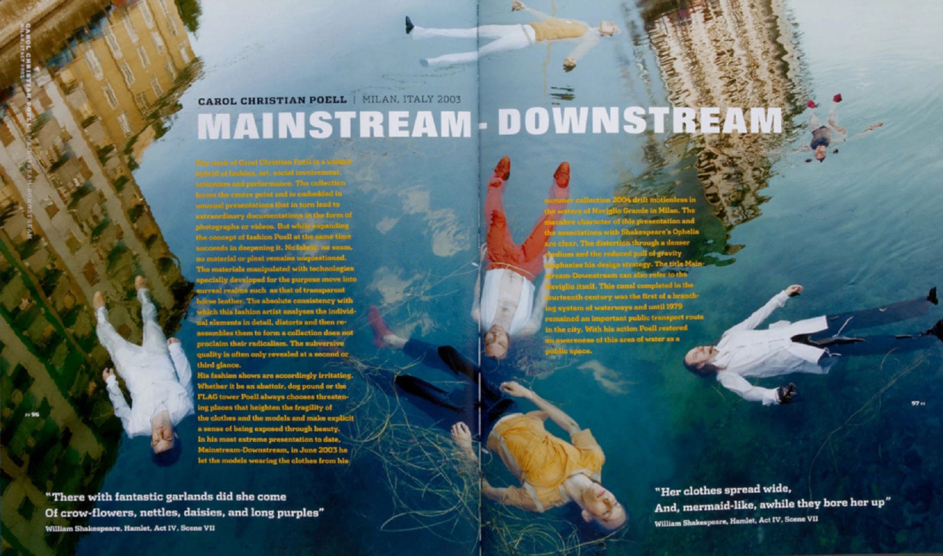 This type of aesthetic and conceptual extremism is intended to stimulate a reaction against the idea of canonical beauty and everything that commonly falls into this category without any real reason other than that linked to commonplaces and preconceptions. As further proof of this, the presentation of the SS 2004 collection entitled Mainstream-Downstream deserves a final mention, representing a moment that has passed into fashion history: all the garments were worn by models who, like dead bodies, let themselves be carried along by the current of Milan's Naviglio Grande, recalling John Everett Millais' Ophelia. Currently the designer, who has certainly distinguished himself for his niche accessories, lives a moment of suspension from fashion, it is said devoting himself only to made-to-measure, as can also be deduced from his website in which a grille with two dentures set inside stands out as the only page, conceptual and extreme as ever.