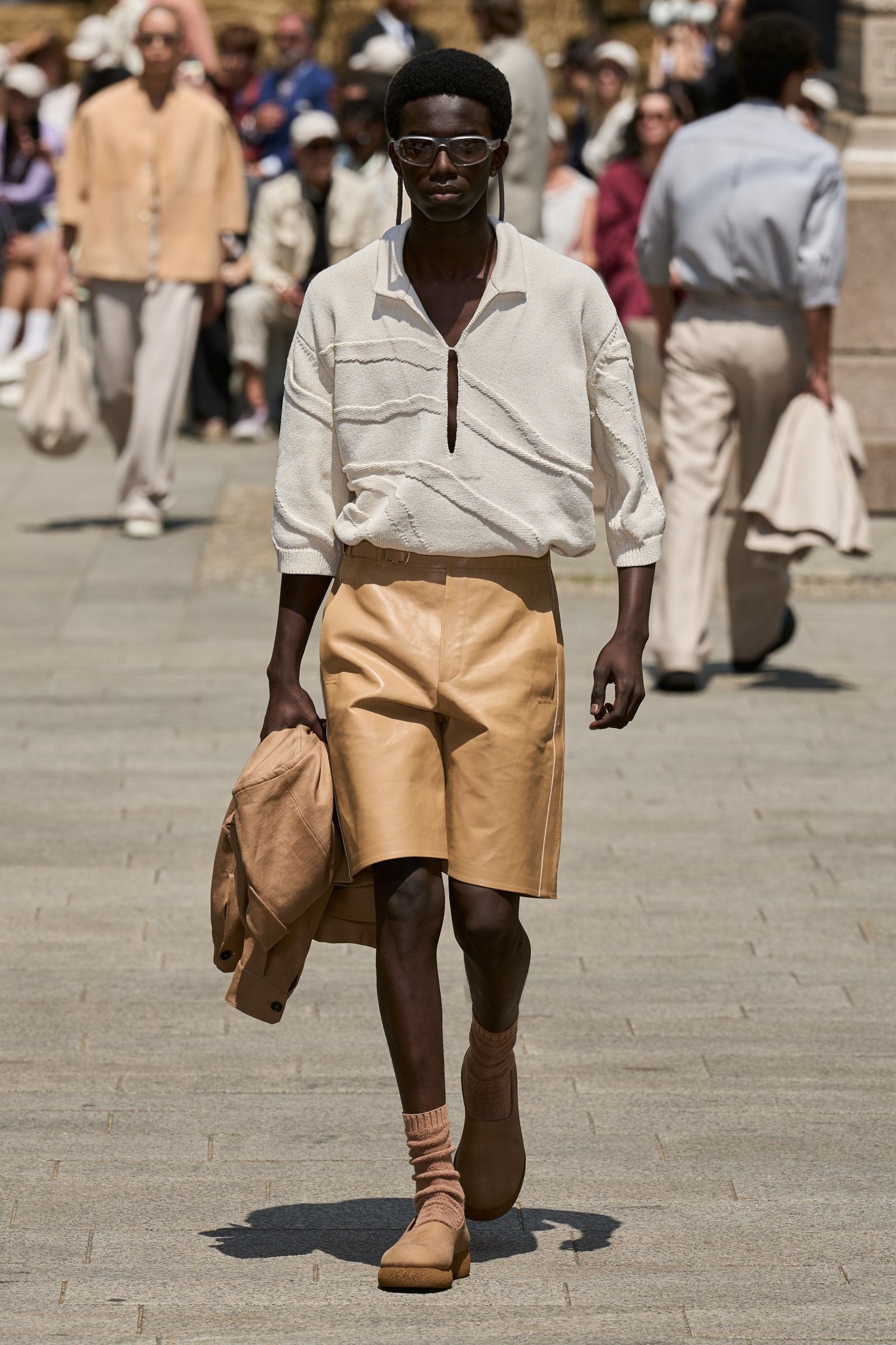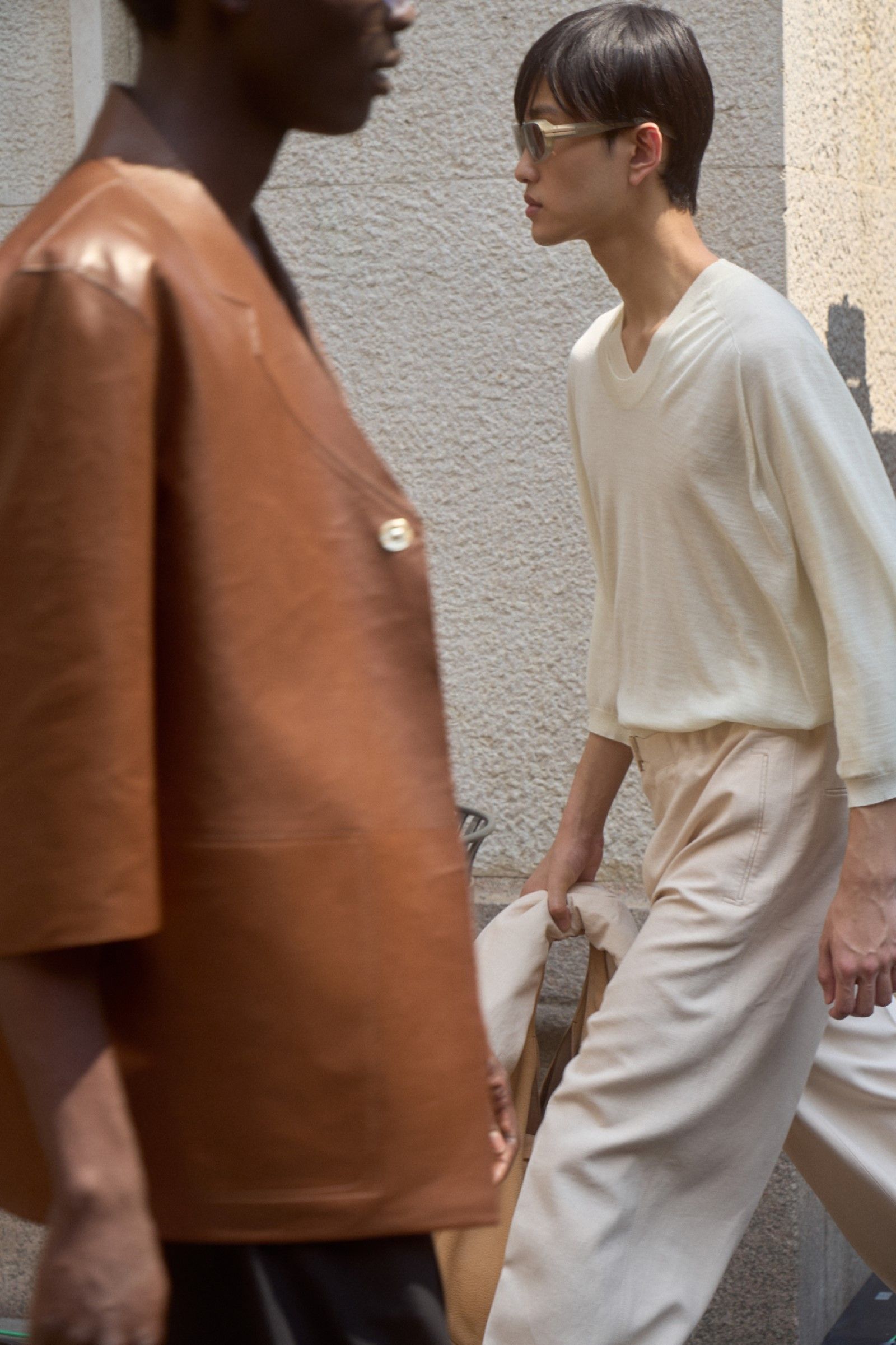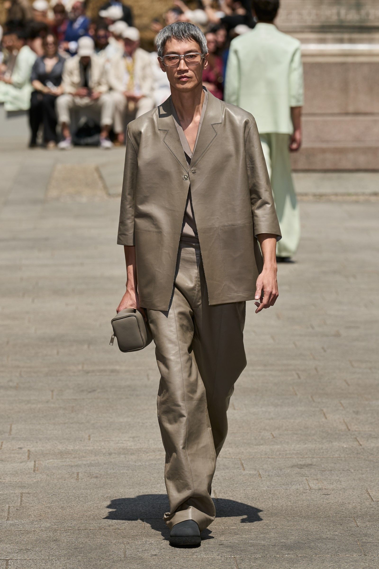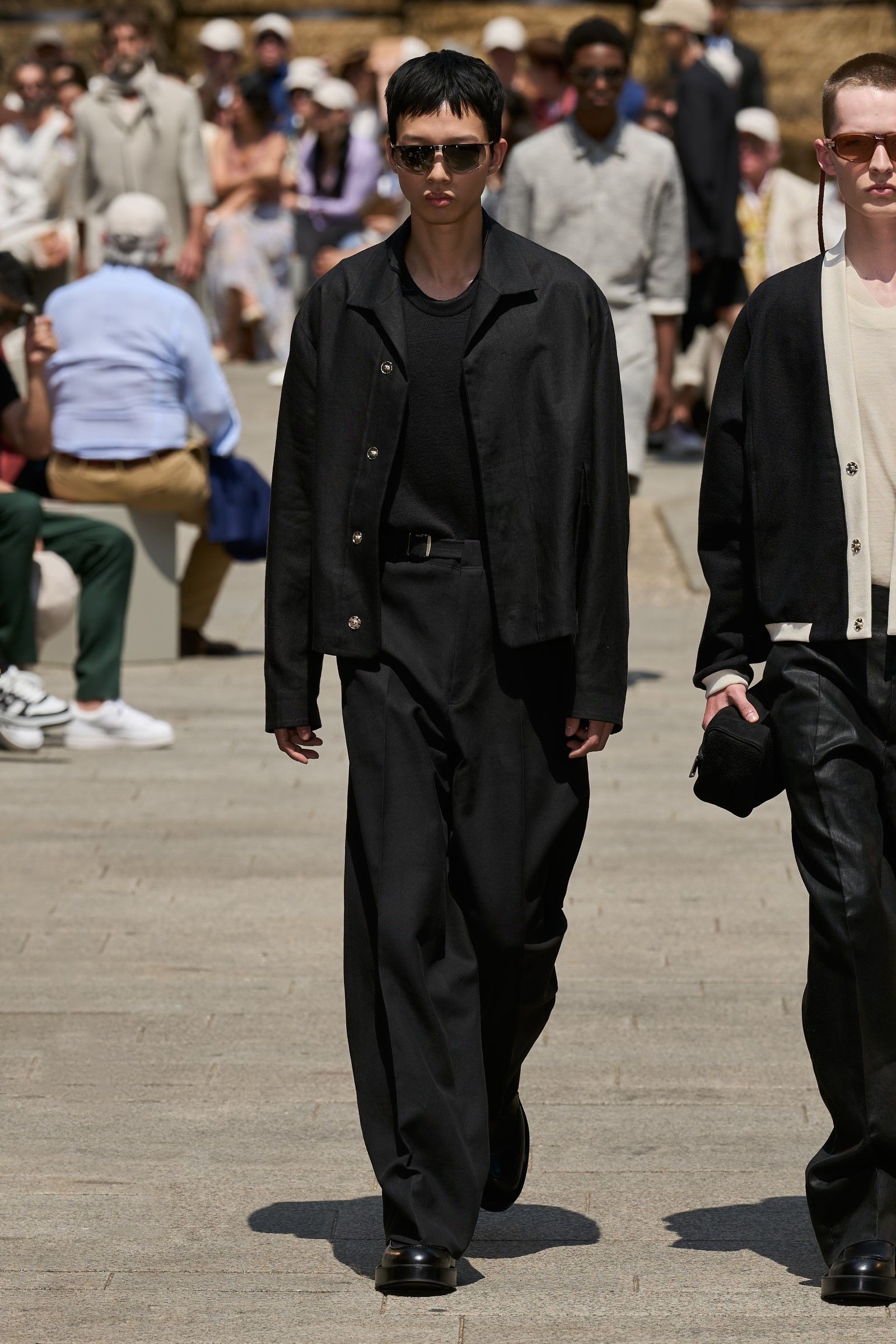 While remaining in the realm of harmonious and classic elegance, in fact, the collection that walked the runway today bore no traces of nostalgia for the past or anxieties about the future - it was, rather, deeply contemporary and wholly present in the moment. The brilliance of the work lies in its apparent simplicity: from square, the silhouette rounded and softened, while remaining sculptural in its definition of the body. Both volumes and textures suggest an idea of incredible compactness and airiness at the same time while the proper sense of luxury is communicated as much by the architecture of the garments themselves as by their materials, which, workmanship after workmanship, Sartori has made almost sing, demonstrating the great mastery of Zegna's atelier in producing now fabrics that seem impalpable, others dense and structured, others porous. The devil is in the details, and here, therefore, one must go looking for the trace of flair: from overshirts of wafer-thin leather to massive slip-ons, from deconstructed jackets with one button at the collar and one at the waist to asymmetrical belts, passing through hyper-thin crew-neck sweaters, wide and sloping bomber jackets, knit polo shirts, and kimono-like shirts.
