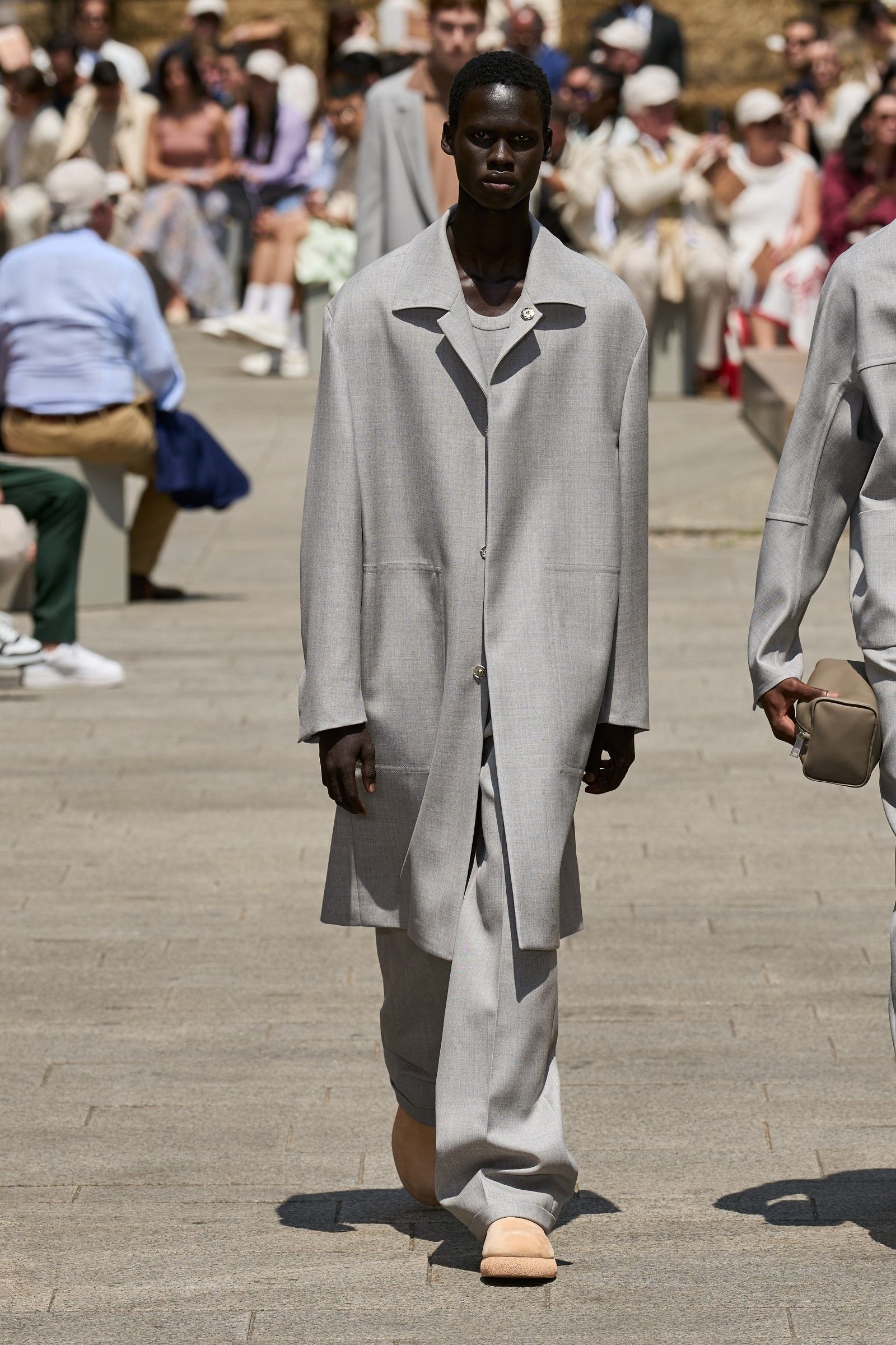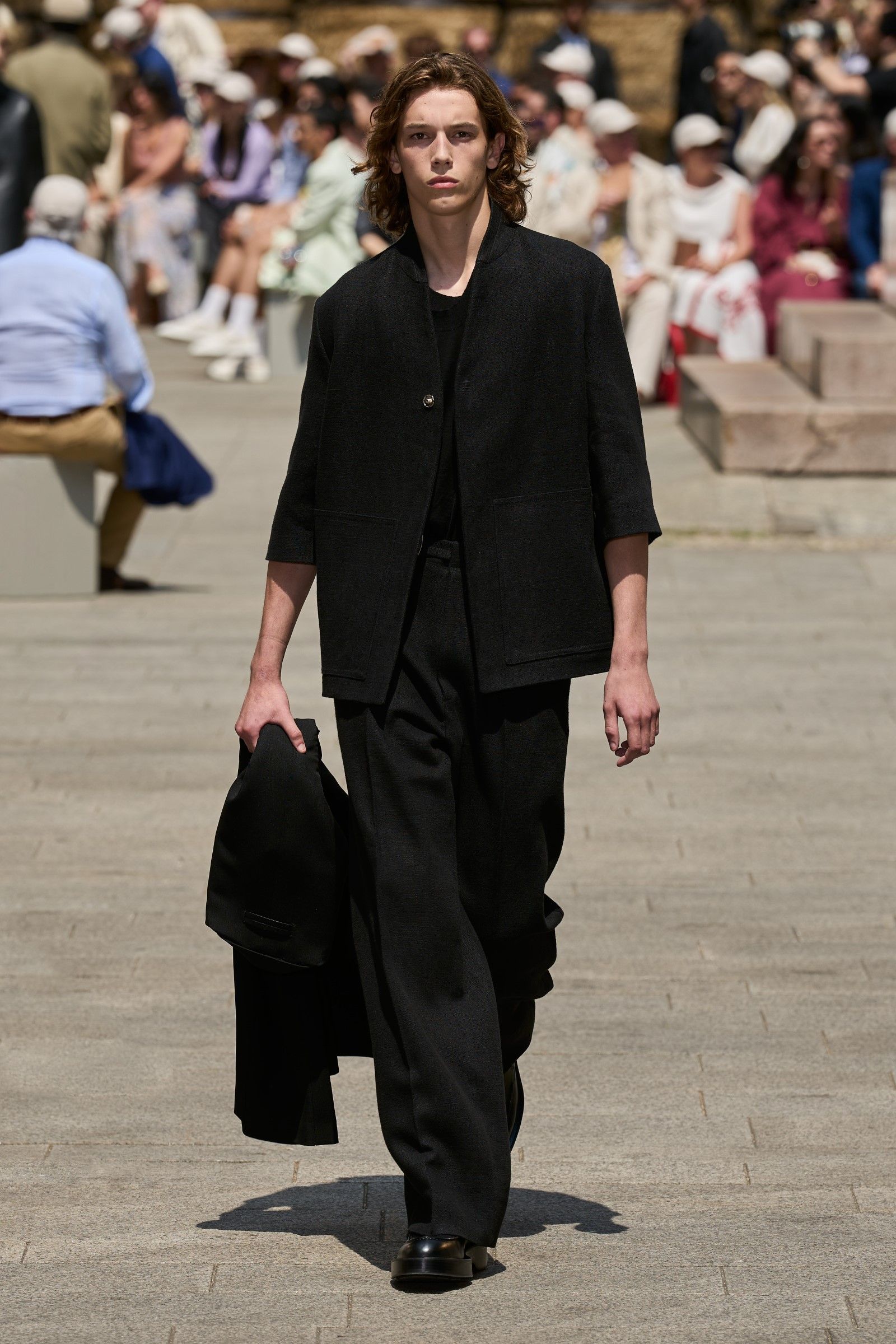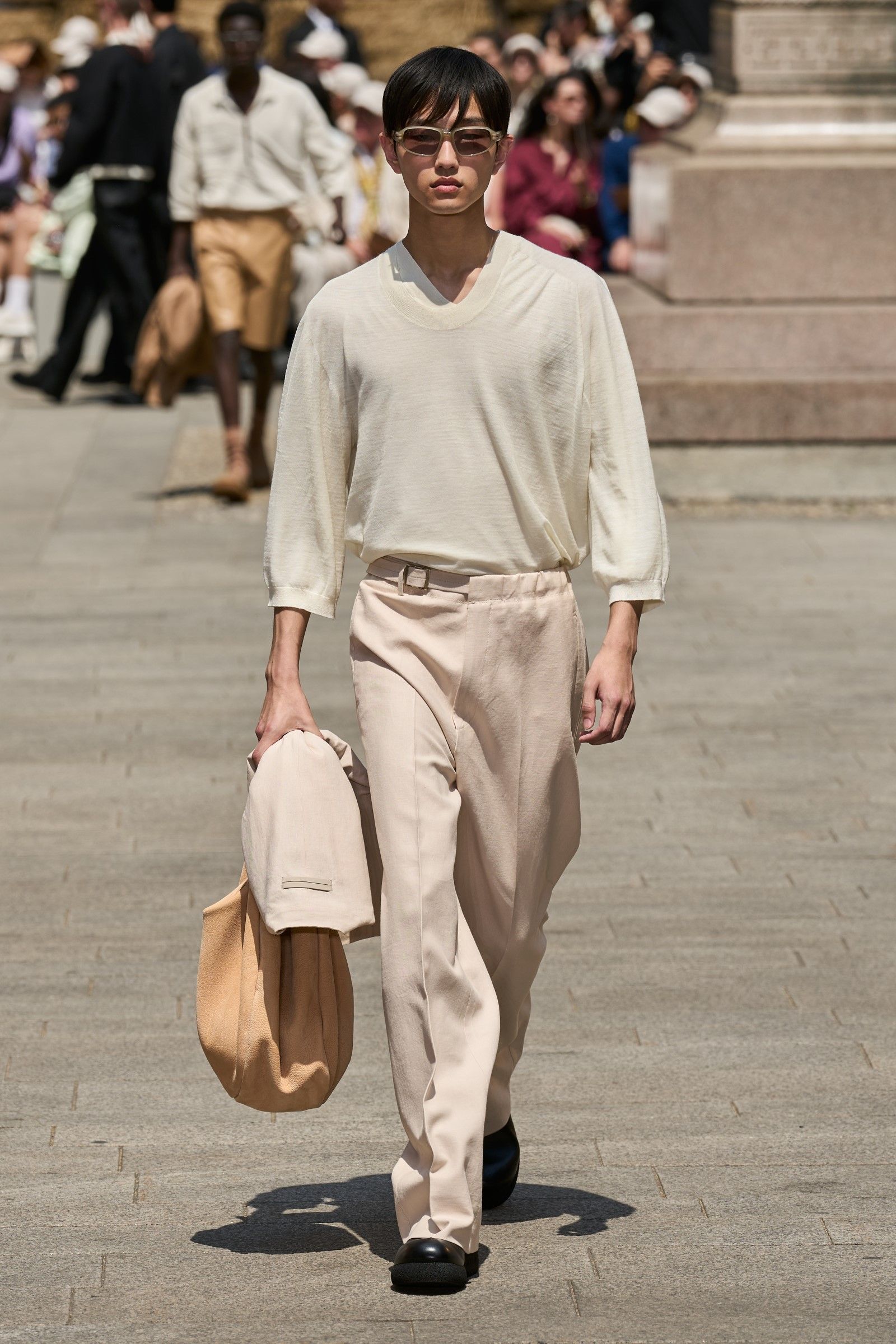 While remaining in the realm of harmonious and classic elegance, in fact, the collection that walked the runway today bore no traces of nostalgia for the past or anxieties about the future - it was, rather, deeply contemporary and wholly present in the moment. The brilliance of the work lies in its apparent simplicity: from square, the silhouette rounded and softened, while remaining sculptural in its definition of the body. Both volumes and textures suggest an idea of incredible compactness and airiness at the same time while the proper sense of luxury is communicated as much by the architecture of the garments themselves as by their materials, which, workmanship after workmanship, Sartori has made almost sing, demonstrating the great mastery of Zegna's atelier in producing now fabrics that seem impalpable, others dense and structured, others porous. The devil is in the details, and here, therefore, one must go looking for the trace of flair: from overshirts of wafer-thin leather to massive slip-ons, from deconstructed jackets with one button at the collar and one at the waist to asymmetrical belts, passing through hyper-thin crew-neck sweaters, wide and sloping bomber jackets, knit polo shirts, and kimono-like shirts.