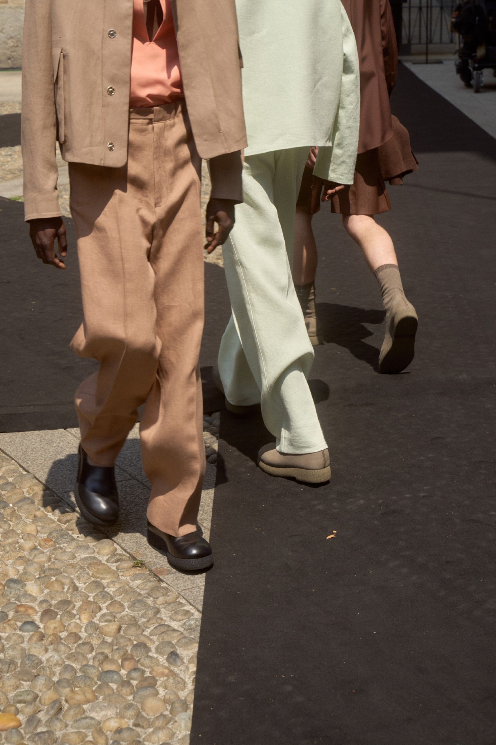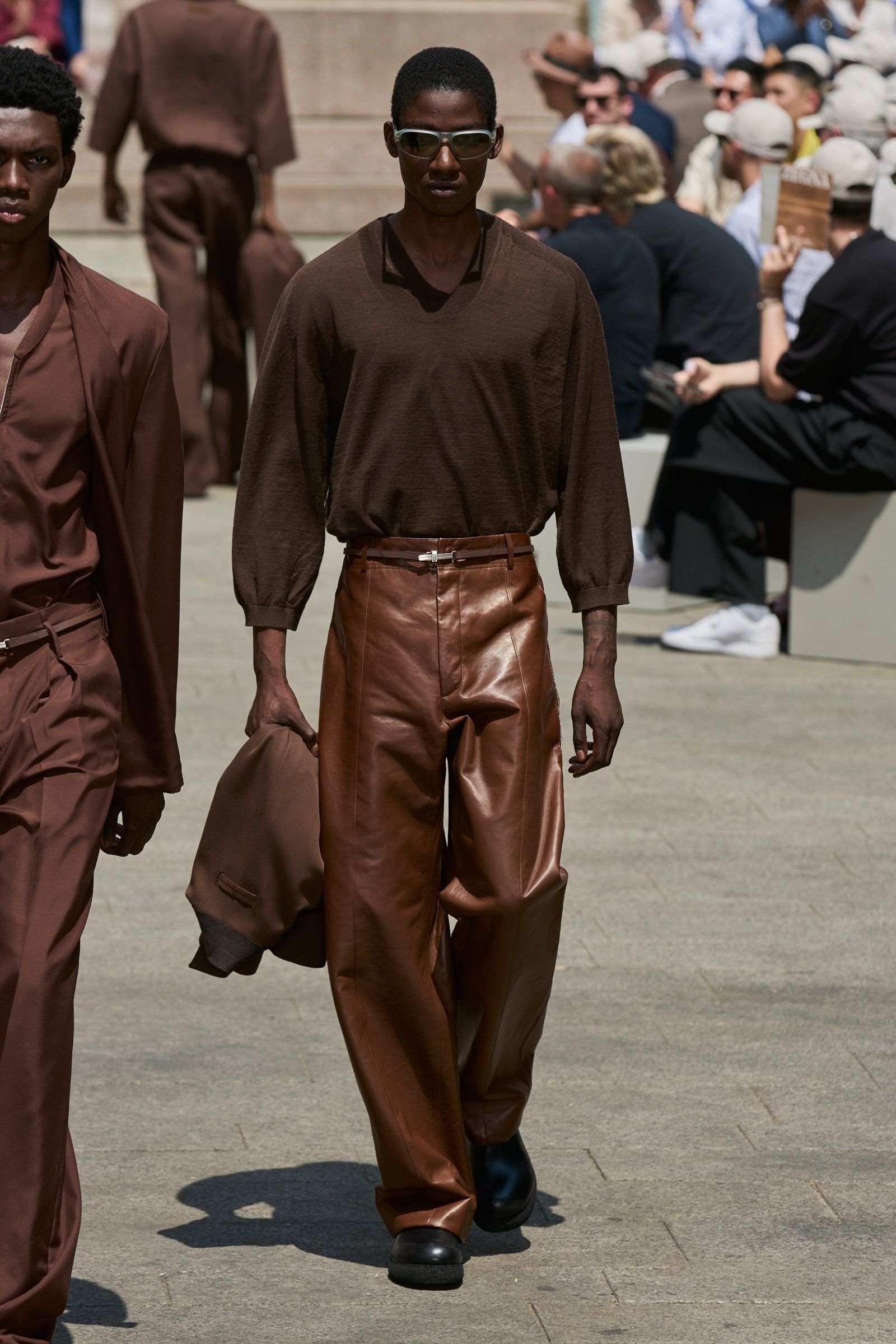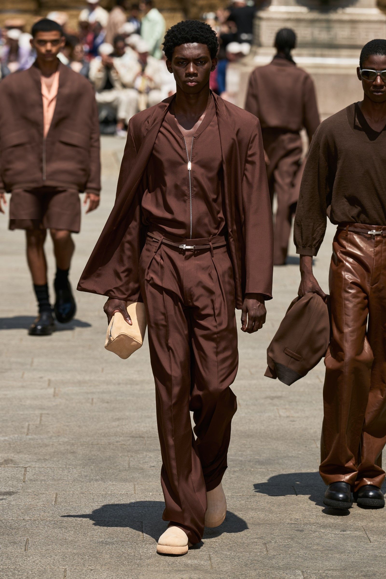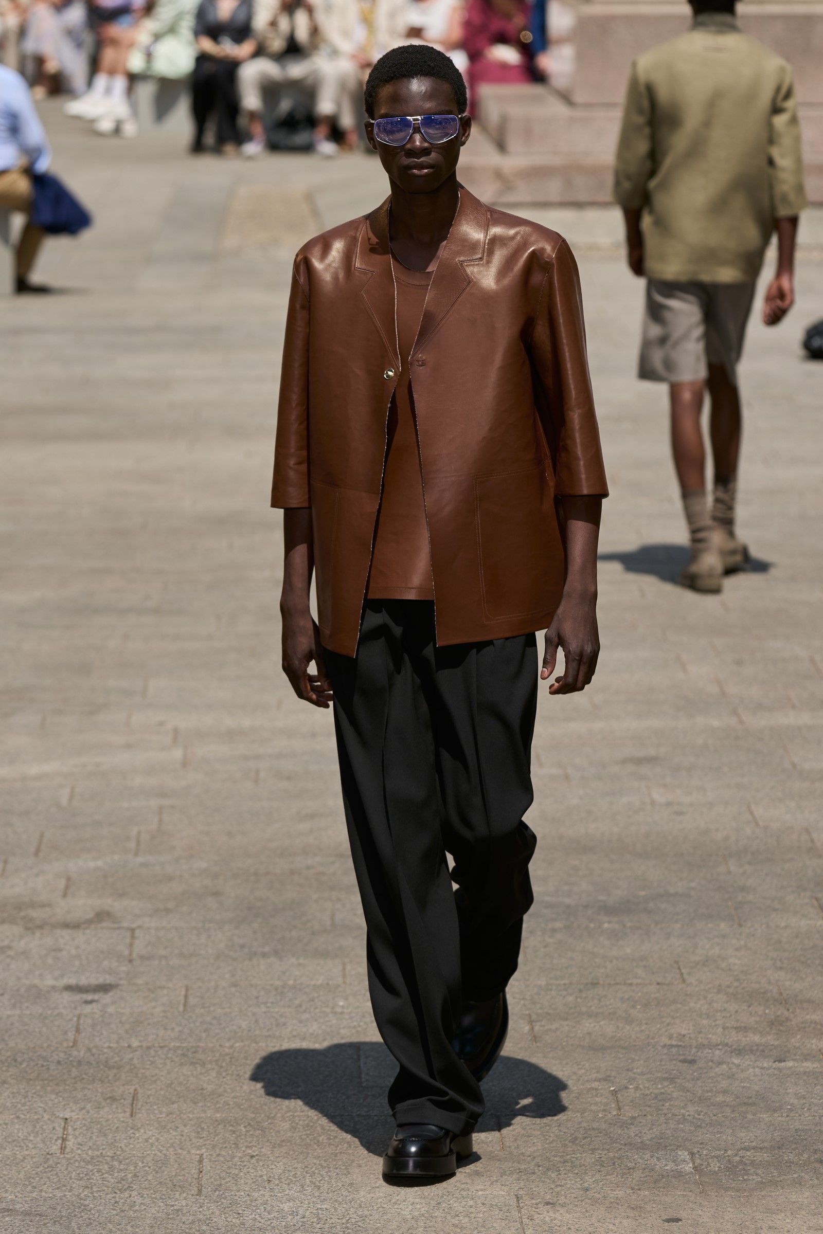 While remaining in the realm of harmonious and classic elegance, in fact, the collection that walked the runway today bore no traces of nostalgia for the past or anxieties about the future - it was, rather, deeply contemporary and wholly present in the moment. The brilliance of the work lies in its apparent simplicity: from square, the silhouette rounded and softened, while remaining sculptural in its definition of the body. Both volumes and textures suggest an idea of incredible compactness and airiness at the same time while the proper sense of luxury is communicated as much by the architecture of the garments themselves as by their materials, which, workmanship after workmanship, Sartori has made almost sing, demonstrating the great mastery of Zegna's atelier in producing now fabrics that seem impalpable, others dense and structured, others porous. The devil is in the details, and here, therefore, one must go looking for the trace of flair: from overshirts of wafer-thin leather to massive slip-ons, from deconstructed jackets with one button at the collar and one at the waist to asymmetrical belts, passing through hyper-thin crew-neck sweaters, wide and sloping bomber jackets, knit polo shirts, and kimono-like shirts.