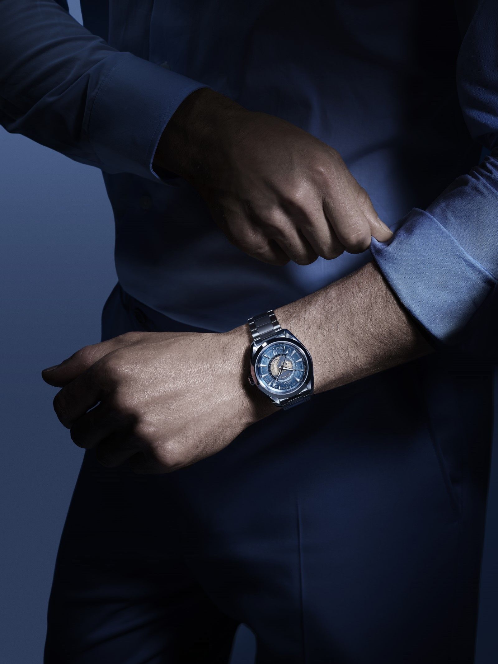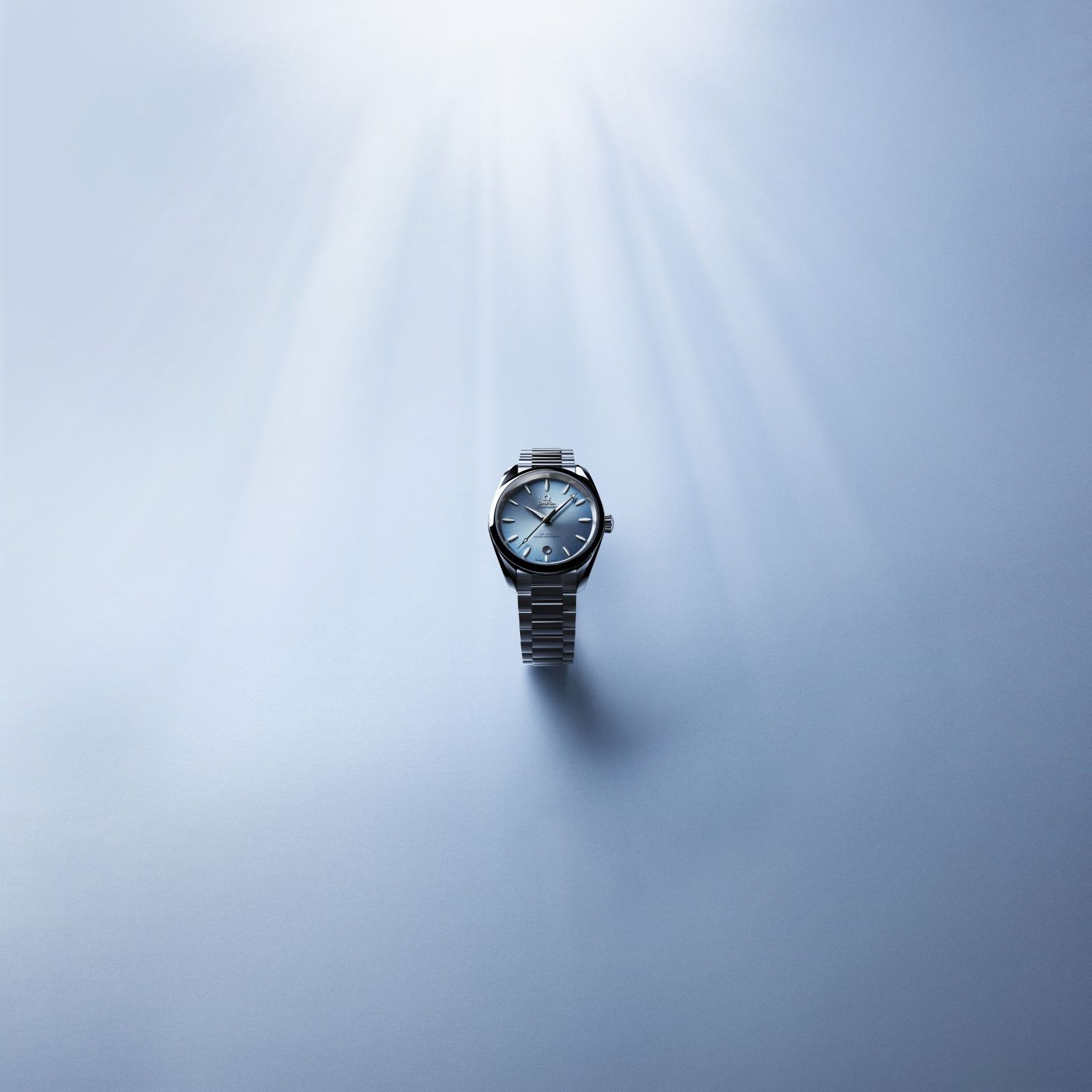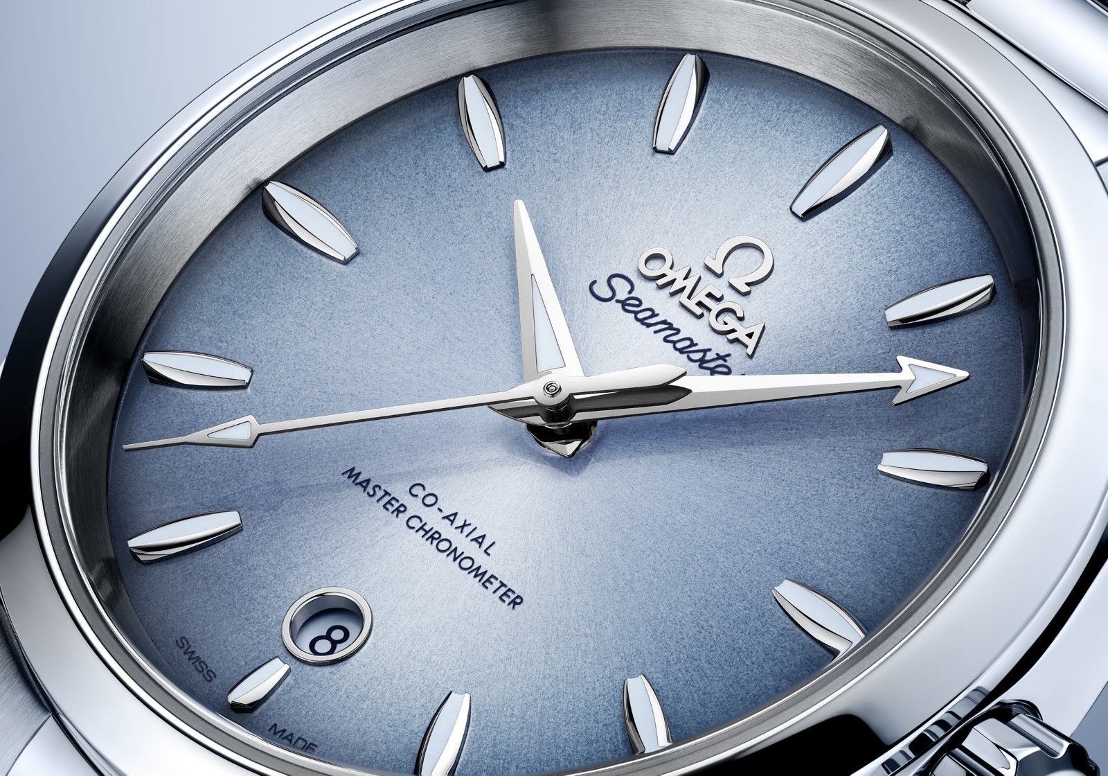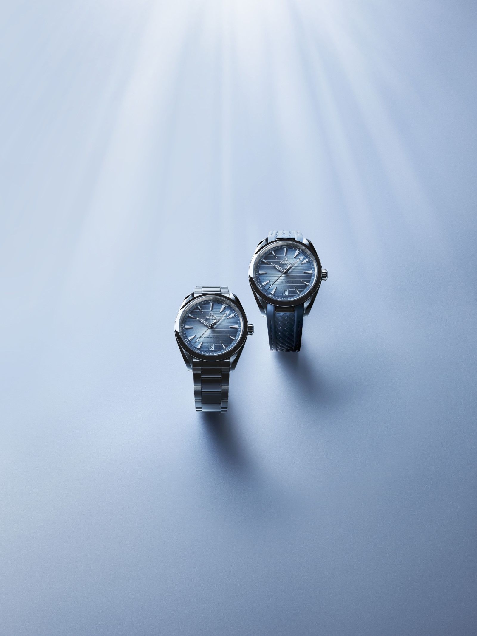 The Seamaster Aqua Terra, originally launched in 2002, combines an understated design inspired by the legendary 1957 Seamaster 300 with marine details such as teak-pattern dials and hull-shaped hour markers. The collection features three new models with symmetrical stainless steel cases and crowns: a 38 mm model with OMEGA Co-Axial Master Chronometer caliber 8800 and a polished and brushed bracelet; a 41 mm model with OMEGA Co-Axial Master Chronometer caliber 8900, available with a matching bracelet or blue rubber strap. All models feature a Summer Blue dial with a sun-brushed finish, rhodium-plated hands and hour markers filled with blue Super-LumiNova for optimal readability in all lighting conditions both above and below the surface of the water. The water resistance of this first model reaches 150 meters depth. The Aqua Terra represents harmony between classic elegance and marine inspiration, offering a mix of sophisticated minimalist design, advanced technical performance, and a clear Summer Blue hue that recalls the beauty and depth of the oceans.