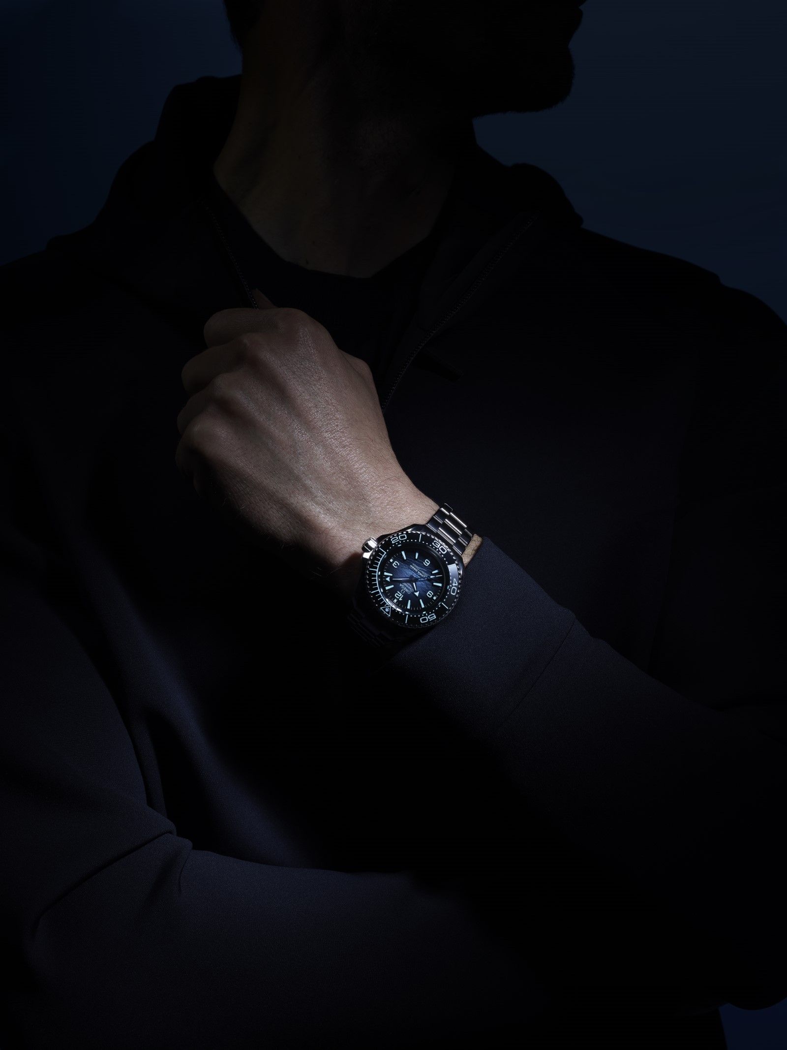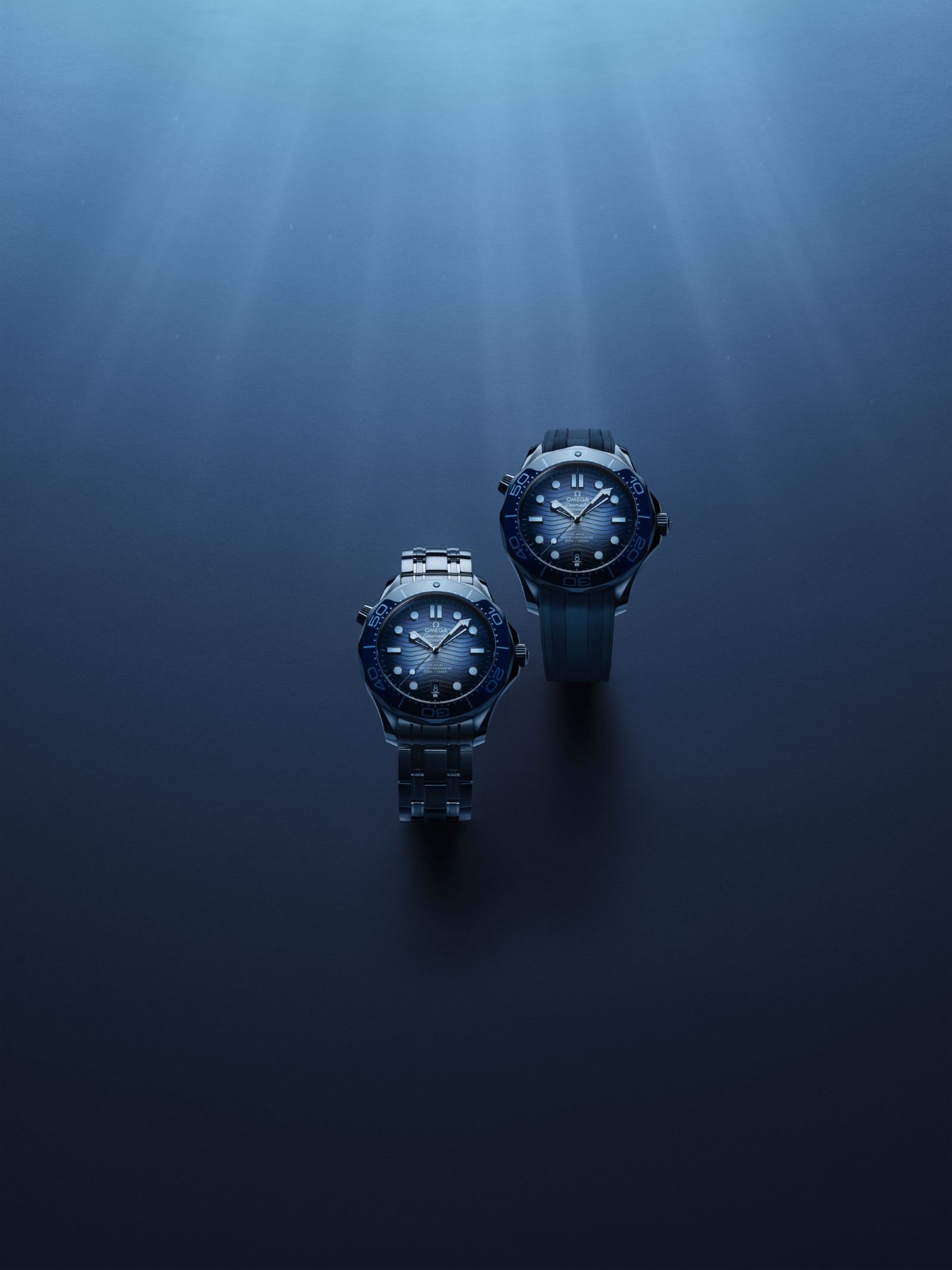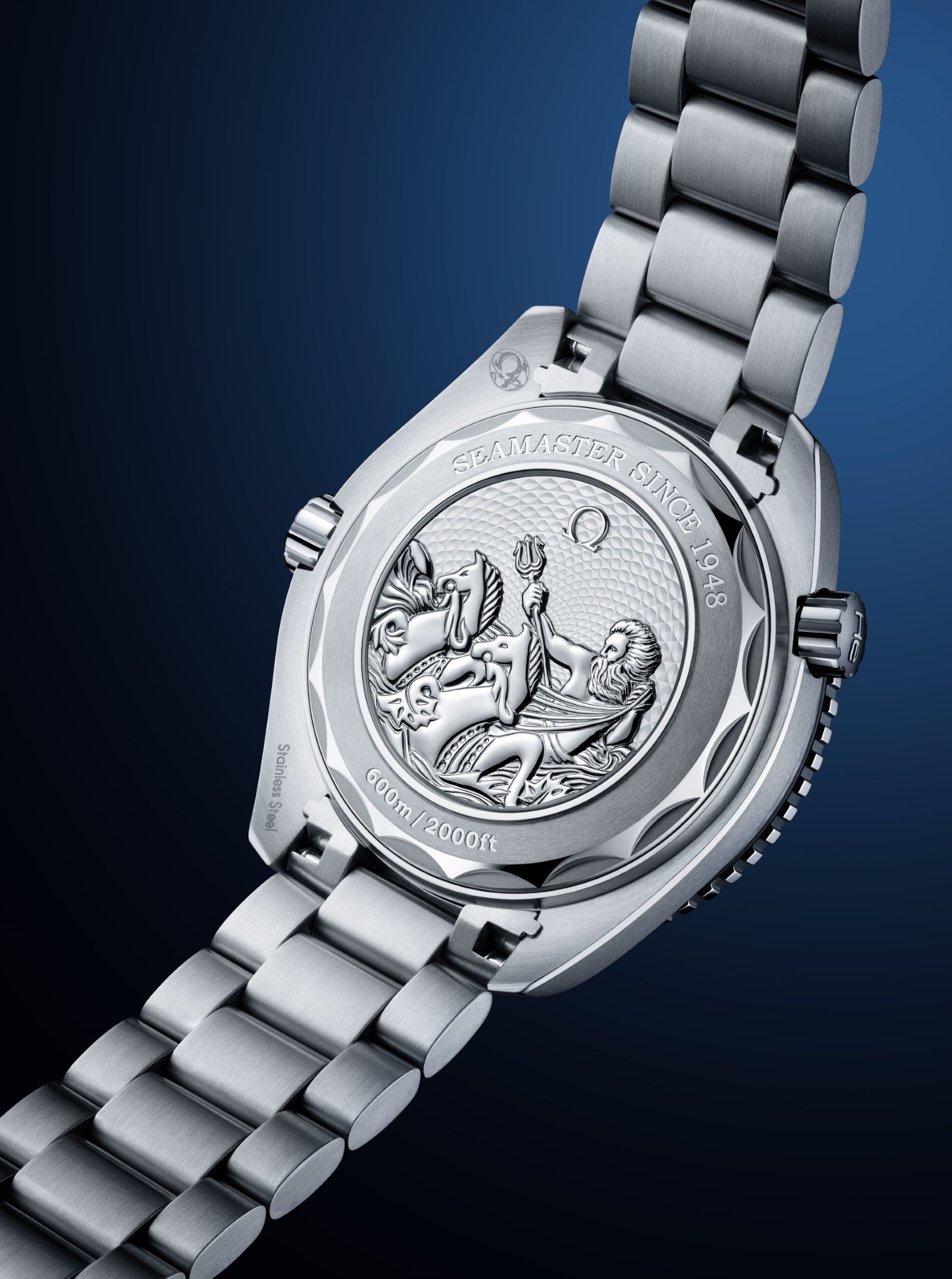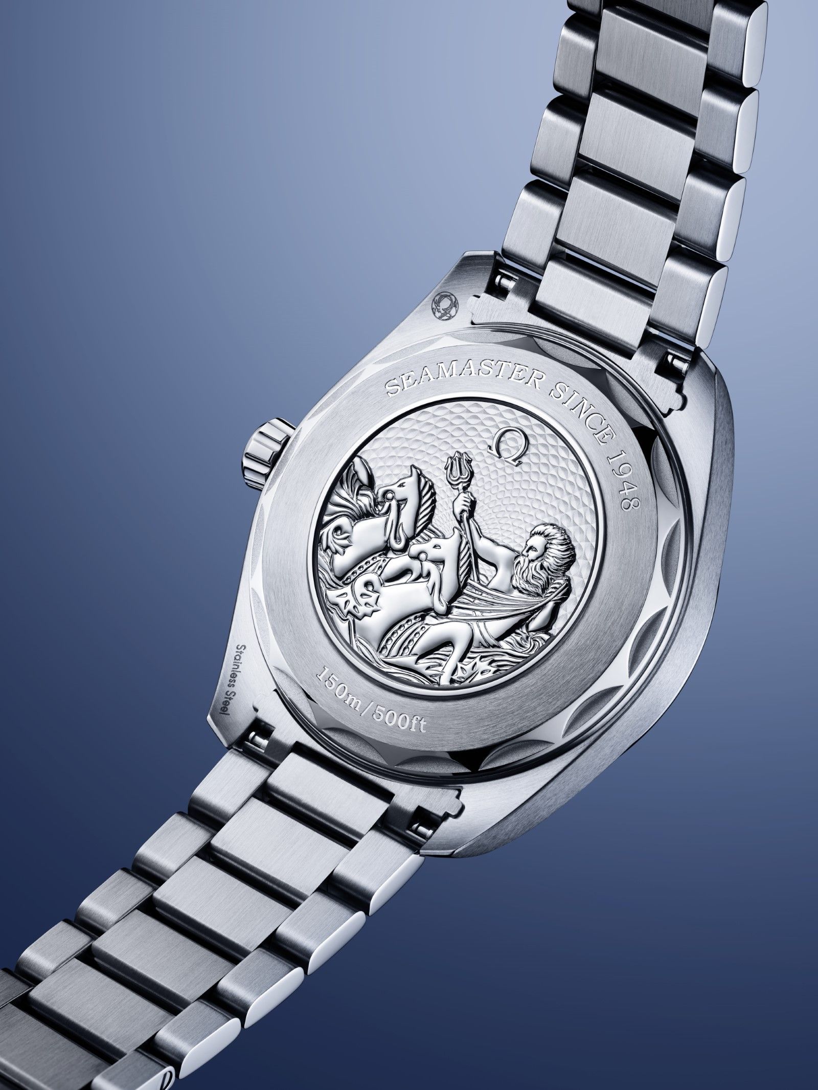 Over the course of 75 years, Seamaster watches have become a symbol of marine tradition, refined style, and exceptional endurance. The Seamaster logo, depicting Neptune's hippocampus with its trident, was the inspiration of designer Jean-Pierre Borle during a visit to Venice, where he admired the decorative sculptures that adorned the gondolas. Each watch in the Seamaster Summer Blue collection features a striking commemorative case back that combines the iconic 1956 Seamaster logo with OMEGA's current logo, representing the legacy and evolution of the legendary Swiss brand. With this collection, OMEGA continues to redefine the standards of excellence in dive watches, offering a unique blend of style, technological innovation and respect for the marine environment.