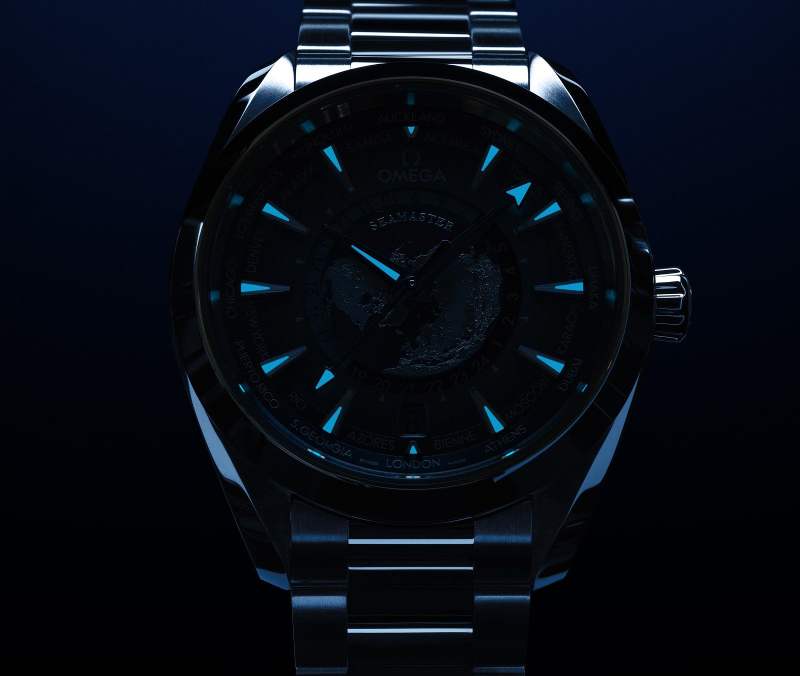 The Seamaster Aqua Terra Worldtimer is one of OMEGA's most prestigious models, introduced in its first version in 2017. This special model features dials made with laser technology, equipped with extraordinary textures and colors representing the Earth as seen from above. The generously sized case with a diameter of 43 mm is made of stainless steel and can be combined with a blue rubber bracelet or strap. The dial features a day-night display and a circular arrangement of world destinations, with a color representation of the Earth and a silver circle with world destinations. The use of hesalite glass allows the outer and inner displays to merge, showing a 24-hour indication, with light blue for day and dark blue for night. The texture and color of the Earth were achieved by laser ablation on a grade 5 titanium plate, creating a three-dimensional effect with a blue ocean and raised continents. Inside, the Aqua Terra Worldtimer is equipped with OMEGA Co-Axial Master Chronometer caliber 8938 and is water-resistant to a depth of 150 meters. The visual richness of this model, with the miniature world it contains represents an invitation to exploration and adventure.