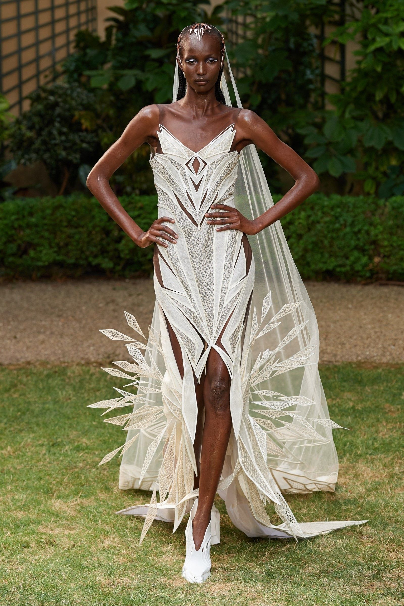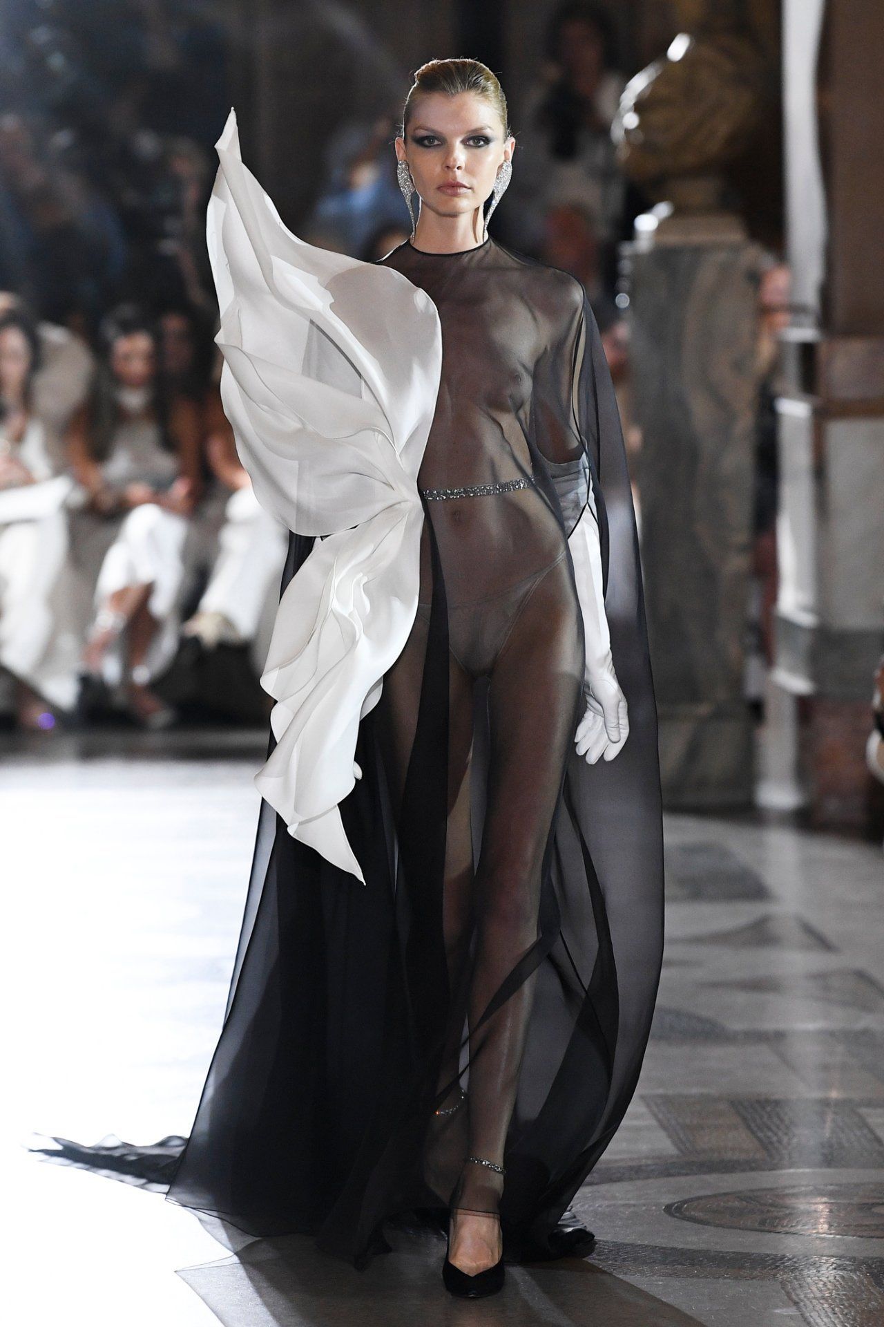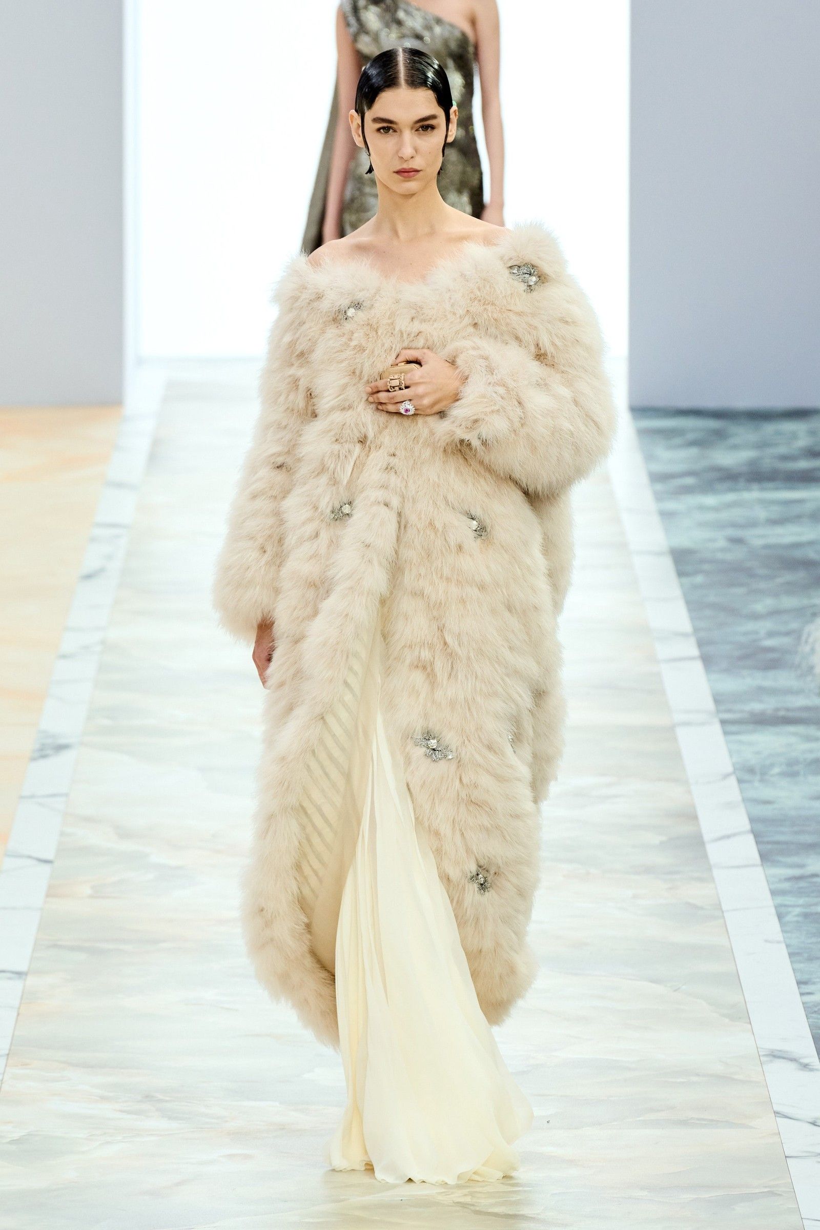 It is difficult, as well as wrong, when it comes to Haute Couture, to lump everything together. If the naturally more commercial world of ready-to-wear can be divided into strands and trends, the more artistic nature of couture, its opulence but also its hyper-personal nature, do not allow one to really reason in terms of general trends. Each couturier has his or her own language and that's enough - but in the collections that have been on the runway over the past few days, a certain kind of vaporous, tendentially white (with exceptions), often delicate-looking, often transparent and impalpable gown has continued to return. While a white wedding gown is traditional in every Haute Couture collection, usually at the close, what is striking about the collections of the last few days is that, regardless of any personal flair, this ethereal couture has returned in the most unexpected guises. At Schiapparelli, for example, where the emphasis on material richness and texture is always strong, Adut Akech walked the runway in an unusual gown composed of bustier and impalpable silk crepeline while an earlier, more sculptural look was a huge cloud-like white angora coat. The usually overworked Charles de Vilmorin filled his show with delicate veils, swans, and horses out of rococo, meringue-like stuccoes; while working with different concepts both Armani Privé and Thom Browne, Alexandre Vauthier, Iris Van Herpen, and Chanel included transparencies and extreme lightness in some of their looks. A sculptural white gown covered in ostrich feathers appeared in Balenciaga's icy collection worn by Amber Valletta, and even the independents did not spare themselves: Georges Hobeika, Tamara Ralph, and Stéphane Rolland all included angelic, evanescent looks in their shows. Dominating the trend, however, was Maria Grazia Chiuri with a collection so muted and diaphanous that it seemed bloodless.