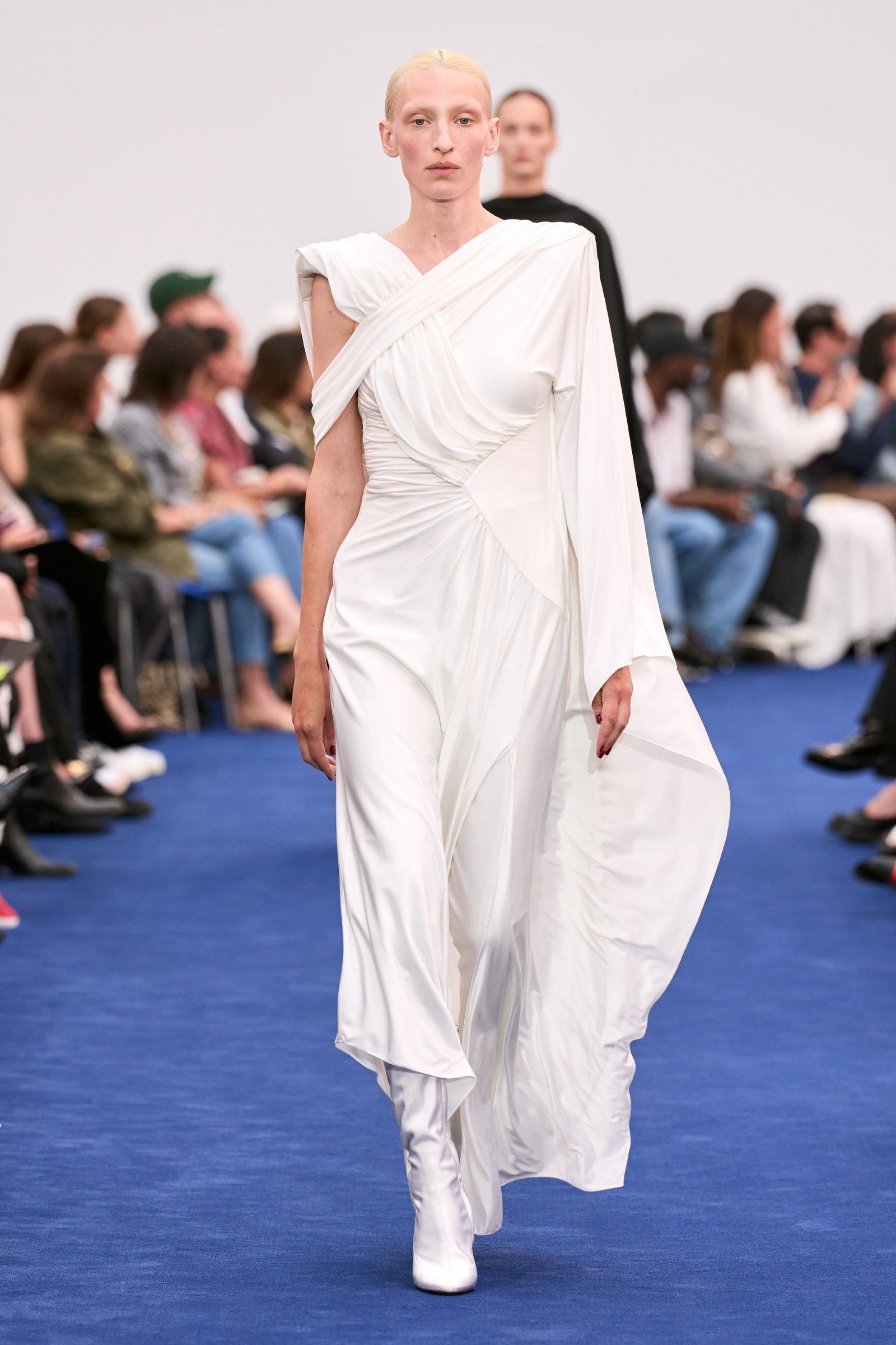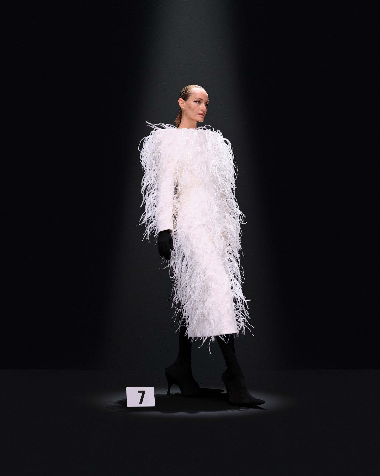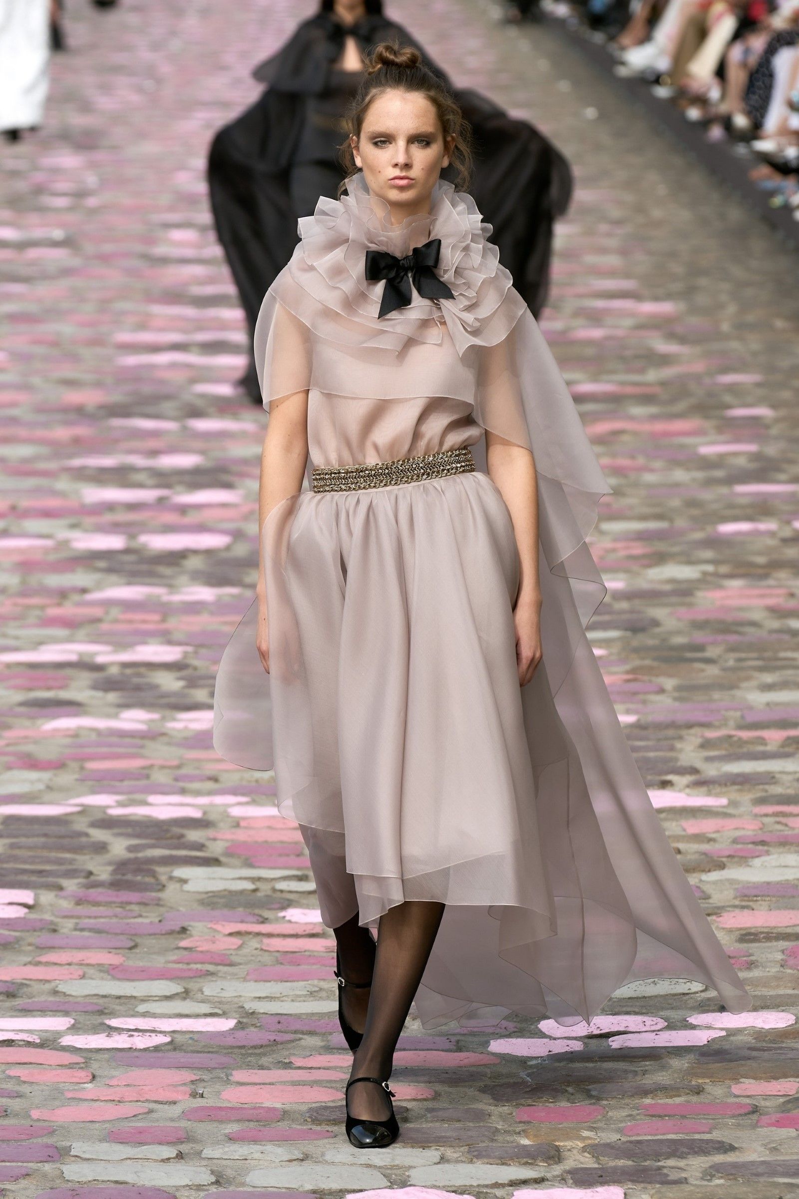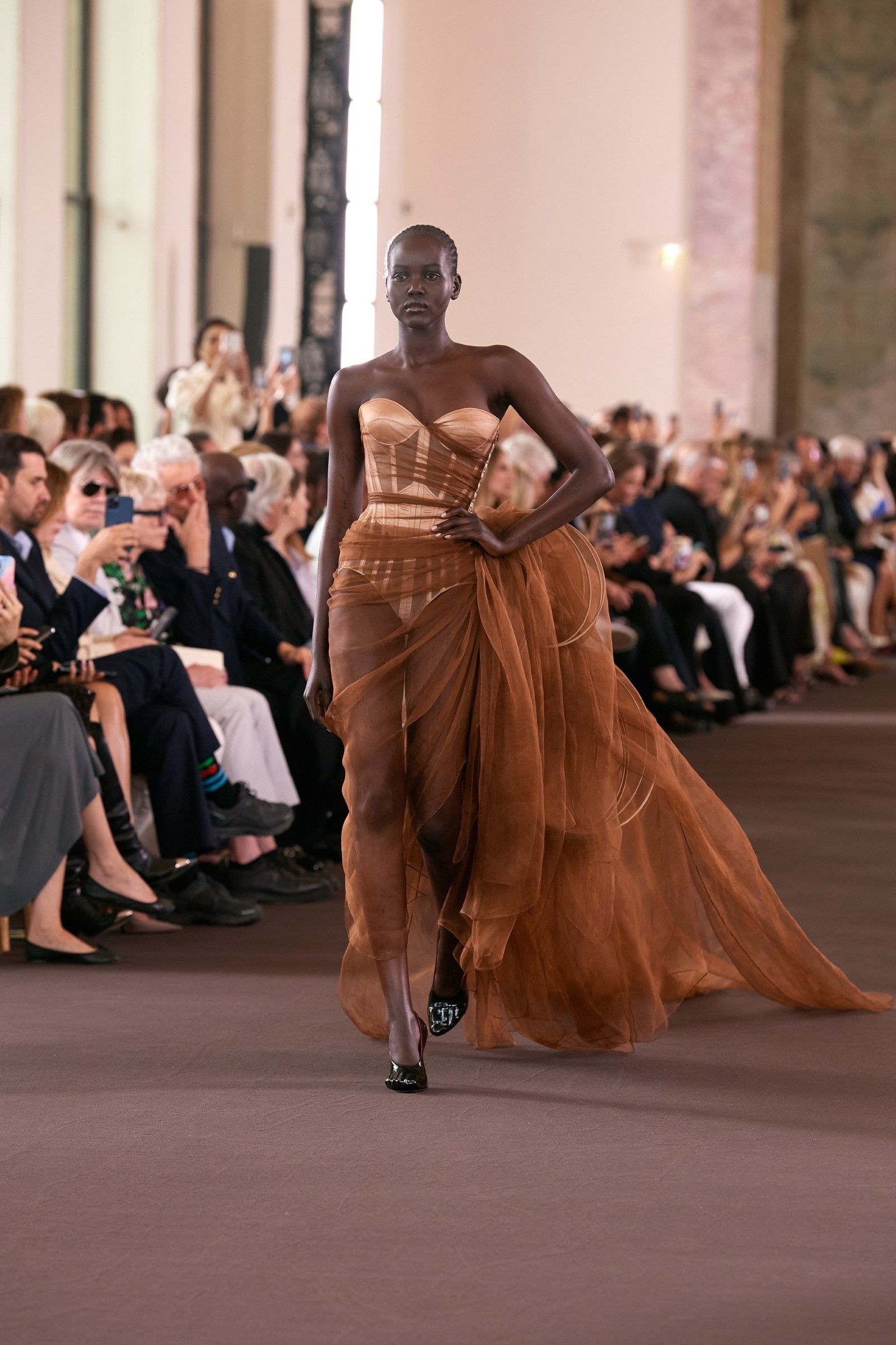 It is difficult, as well as wrong, when it comes to Haute Couture, to lump everything together. If the naturally more commercial world of ready-to-wear can be divided into strands and trends, the more artistic nature of couture, its opulence but also its hyper-personal nature, do not allow one to really reason in terms of general trends. Each couturier has his or her own language and that's enough - but in the collections that have been on the runway over the past few days, a certain kind of vaporous, tendentially white (with exceptions), often delicate-looking, often transparent and impalpable gown has continued to return. While a white wedding gown is traditional in every Haute Couture collection, usually at the close, what is striking about the collections of the last few days is that, regardless of any personal flair, this ethereal couture has returned in the most unexpected guises. At Schiapparelli, for example, where the emphasis on material richness and texture is always strong, Adut Akech walked the runway in an unusual gown composed of bustier and impalpable silk crepeline while an earlier, more sculptural look was a huge cloud-like white angora coat. The usually overworked Charles de Vilmorin filled his show with delicate veils, swans, and horses out of rococo, meringue-like stuccoes; while working with different concepts both Armani Privé and Thom Browne, Alexandre Vauthier, Iris Van Herpen, and Chanel included transparencies and extreme lightness in some of their looks. A sculptural white gown covered in ostrich feathers appeared in Balenciaga's icy collection worn by Amber Valletta, and even the independents did not spare themselves: Georges Hobeika, Tamara Ralph, and Stéphane Rolland all included angelic, evanescent looks in their shows. Dominating the trend, however, was Maria Grazia Chiuri with a collection so muted and diaphanous that it seemed bloodless.