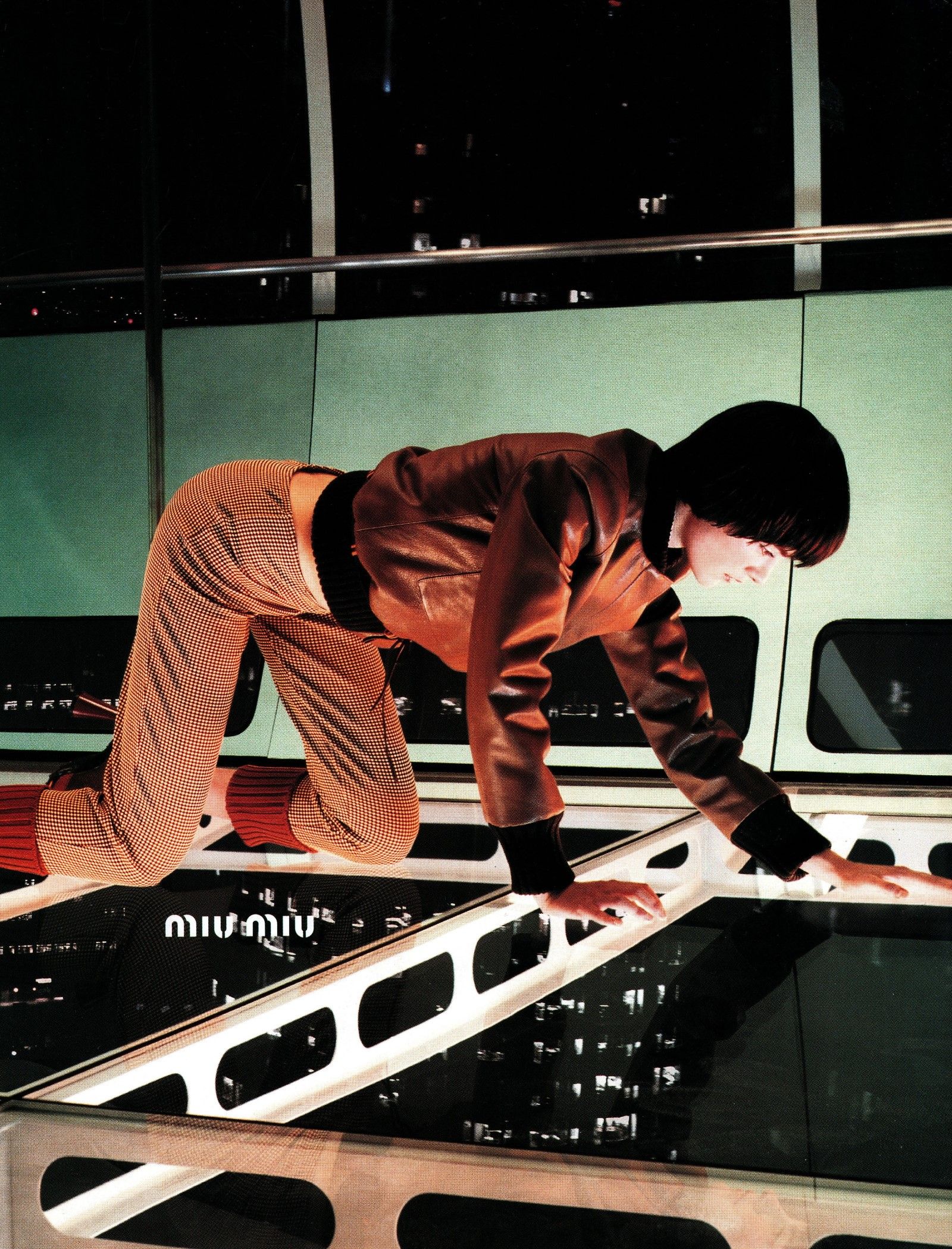 «I had a long working relationship with Alister Mackie from Dazed and Another Magazine from the mid-90s onwards,» said Martina Hoogland Ivanow, who shot the FW01 campaign and ended up also doing Prada for that season, «I think the assignment came from that end.» Seeing artificially coloured lights as a contrast to cold widows in Mongolian and Serbian winters during a trip inspired her. «This was later the inspiration for the cage-like scenography and tight composition for the shoot,» she said, «A sense of inverted walls and claustrophobia, both from the architecture, lack of light and the cold.»