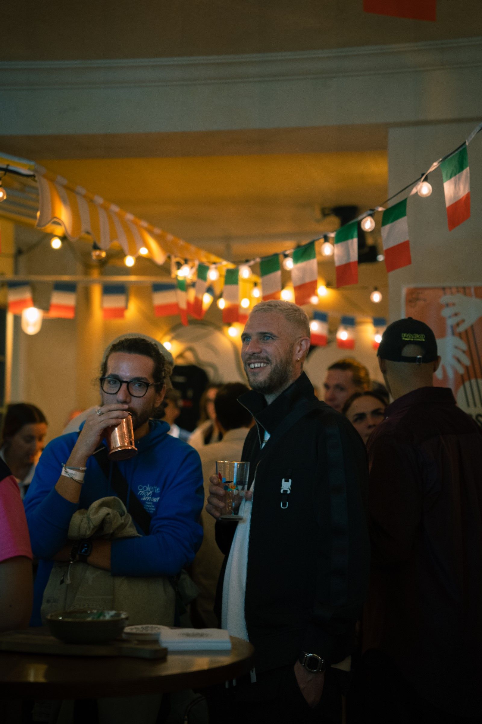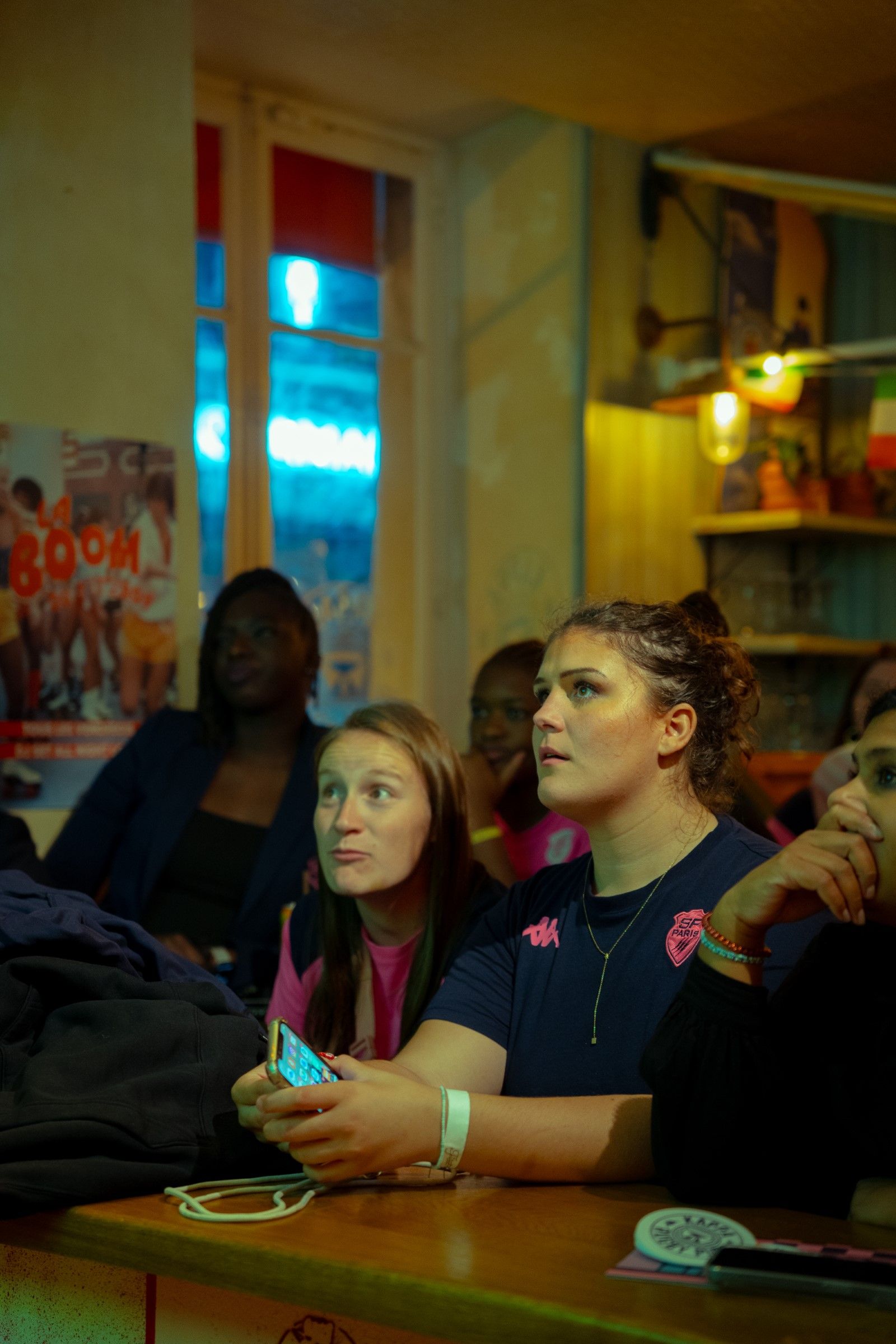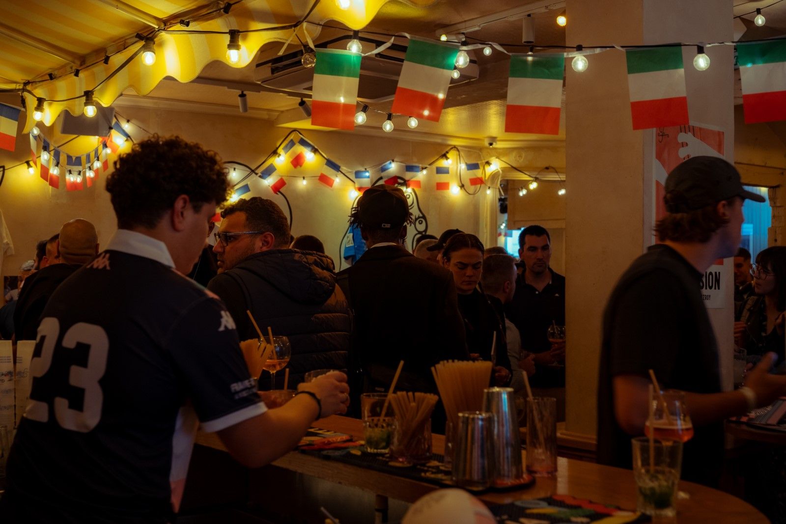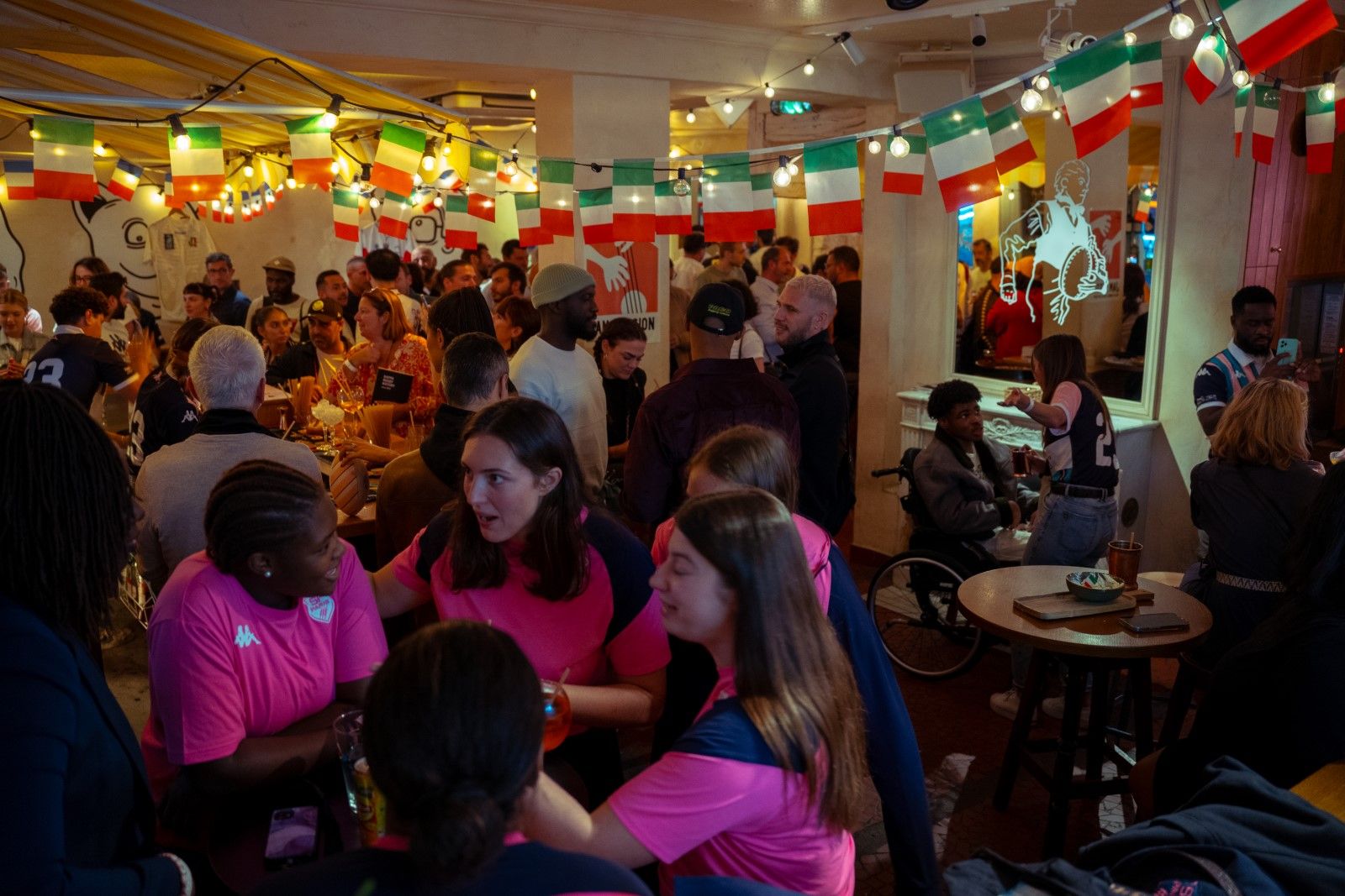 The second day of Kappa Rugby Pub, on Friday, October 6th, featured another talk, this time focused on the women's side of rugby, with Guillaume Berten, president of Chilly Mazarin Rugby, and two players from SF Paris, Coumba Diallo and Esther Fabre. Together, and under the attentive ear of the audience, they explored the journeys of the players, their personal experiences, and their feelings about the sport. The crowd gathered public figures like radio hosts, YouTubers as well as rugby players and many rugby enthusiasts. All of this was followed by a live broadcast of the decisive France vs Italy match, which sparked widespread joy when France secured victory and a spot in the quarter-finals of the World Cup. The rugby game offered the opportunity to the guests to be around regular clients to provide a most immersive experience. Ending the night in a joyful mood, the event felt like an authentic celebration of the sport, and all guests went back home with tote bags that included many goodies and even included the pink, teal, and navy Kappa Rugby Pub polo jersey.