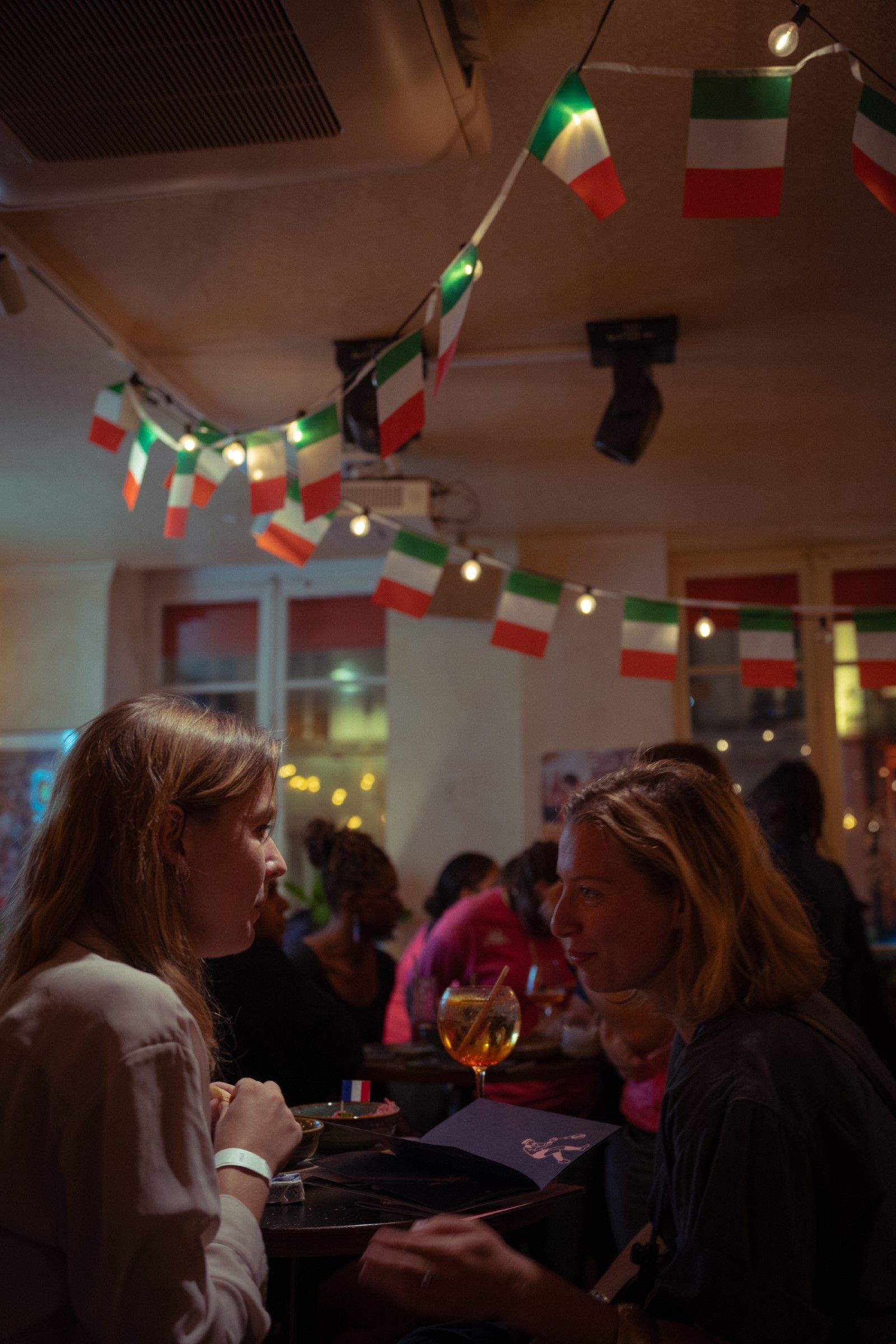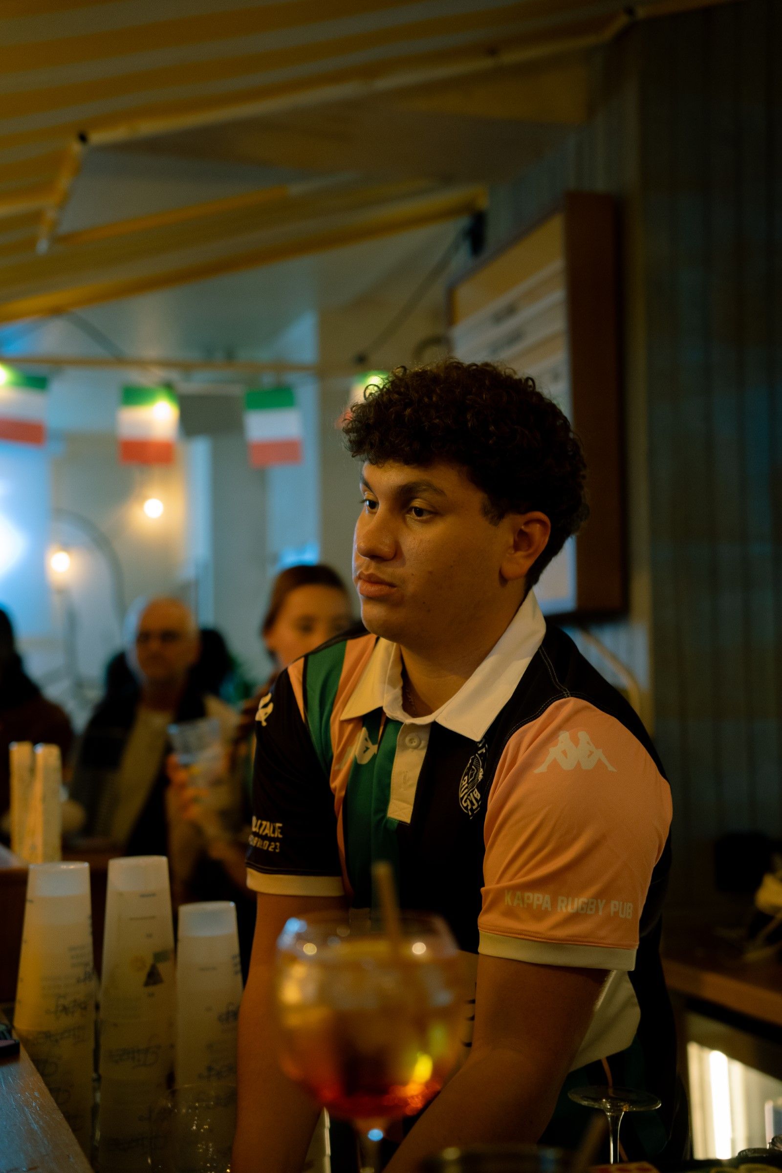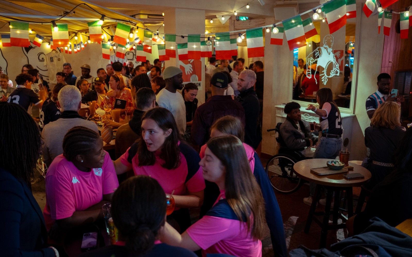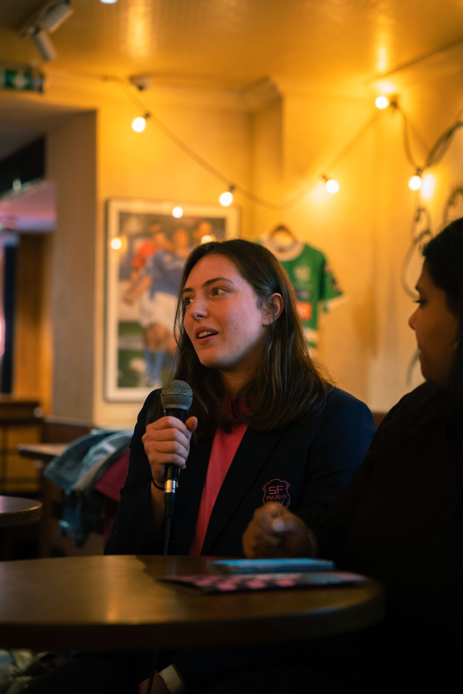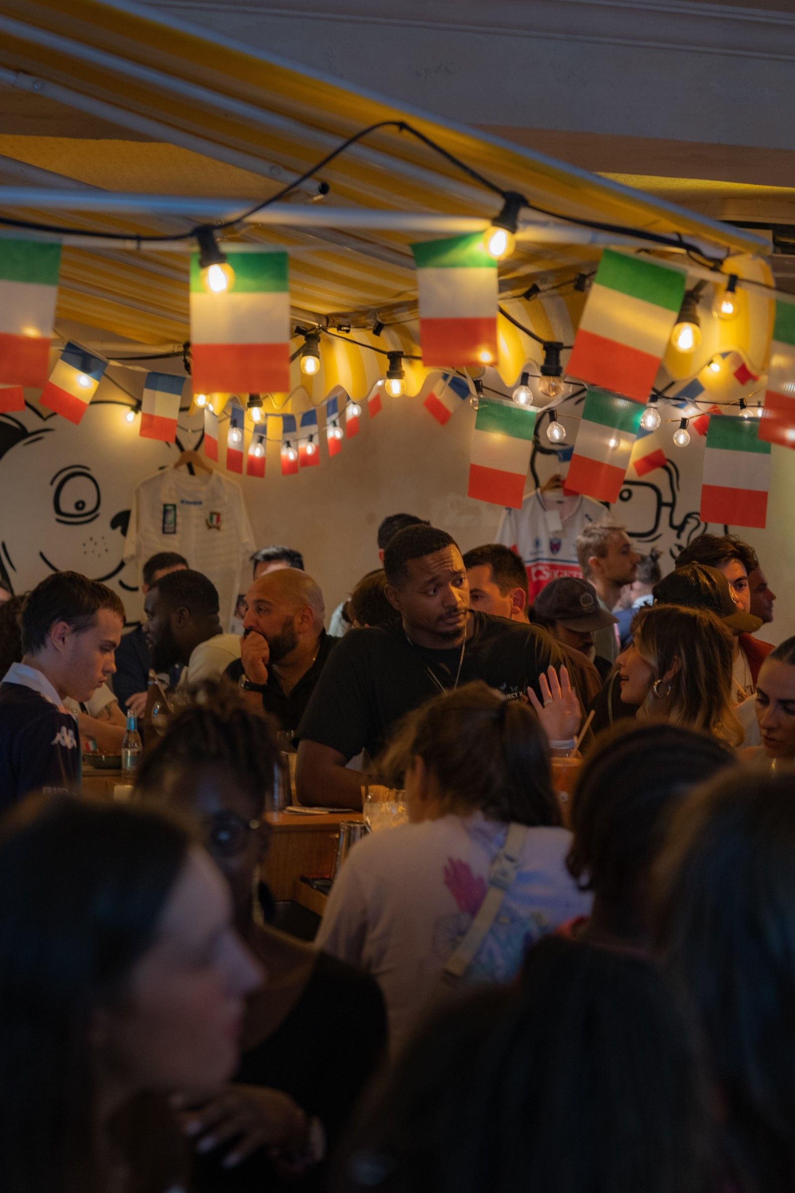 The second day of Kappa Rugby Pub, on Friday, October 6th, featured another talk, this time focused on the women's side of rugby, with Guillaume Berten, president of Chilly Mazarin Rugby, and two players from SF Paris, Coumba Diallo and Esther Fabre. Together, and under the attentive ear of the audience, they explored the journeys of the players, their personal experiences, and their feelings about the sport. The crowd gathered public figures like radio hosts, YouTubers as well as rugby players and many rugby enthusiasts. All of this was followed by a live broadcast of the decisive France vs Italy match, which sparked widespread joy when France secured victory and a spot in the quarter-finals of the World Cup. The rugby game offered the opportunity to the guests to be around regular clients to provide a most immersive experience. Ending the night in a joyful mood, the event felt like an authentic celebration of the sport, and all guests went back home with tote bags that included many goodies and even included the pink, teal, and navy Kappa Rugby Pub polo jersey.