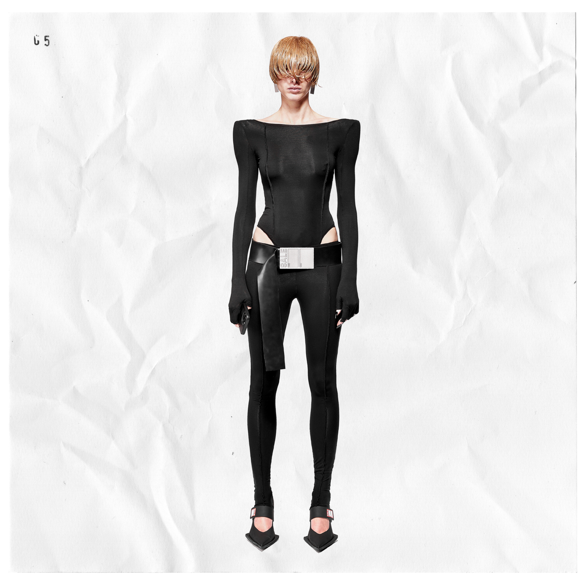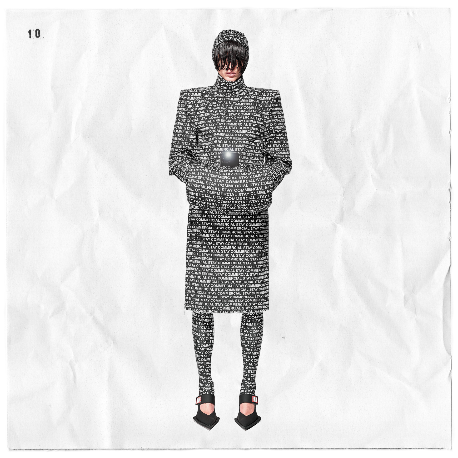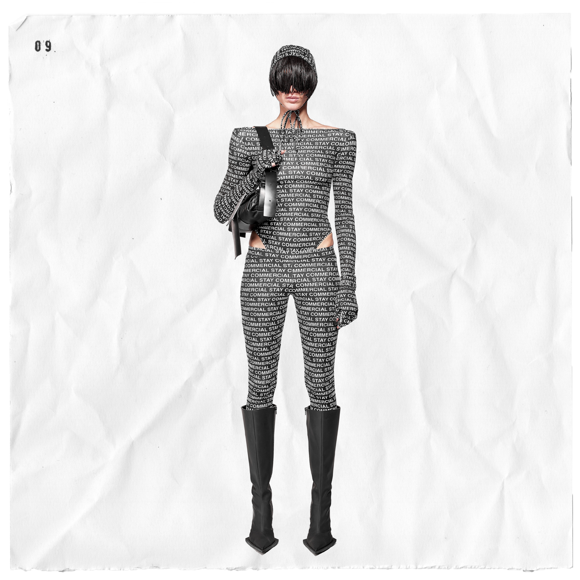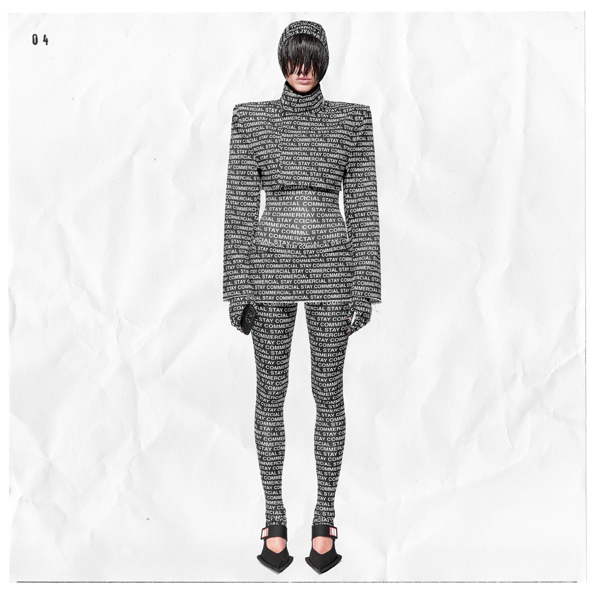 In the heart of Paris, British designer Betsy Johnson welcomed us into her showroom, which also serves as an intimate creative space for herself and her team. There, among the striking pieces of her new collection, we delved deep into the inspirations behind her brand, PRODUCTS, and the powerful messages she hopes to convey. As we entered, our attention was immediately drawn to a model, comfortably lounging on a latex-covered couch, wearing a tight black dress with a deep neckline, paired with an aristocratic hat, both emblazoned with the words 'STAY COMMERCIAL' in white. Her hands were tucked into an innovative handwarmer-phone-holder combination, the phone was sticking out with the flashlight on, which always gave it the effect that you were being recorded and essentially flipped the narrative. Conversing with Betsy Johnson means uncovering the story behind an elusive and enigmatic figure. Although she appears very reserved on social media, Betsy is a lively, energetic, and complex person. She was dressed in a pair of oversized Balenciaga track pants, visibly distressed at the back from the way her stiletto heels punctuate them with every step, in a sort of statement of nonchalance. Her hair was slicked back, half blonde and half black, almost symbolizing the division between nonconformity and the desire to be seen, an internal struggle that often emerges in her creations. Looking at the collection, sculpted shoulders stood out on many outfits. It felt natural to ask: 'Why the shoulder pads?'
