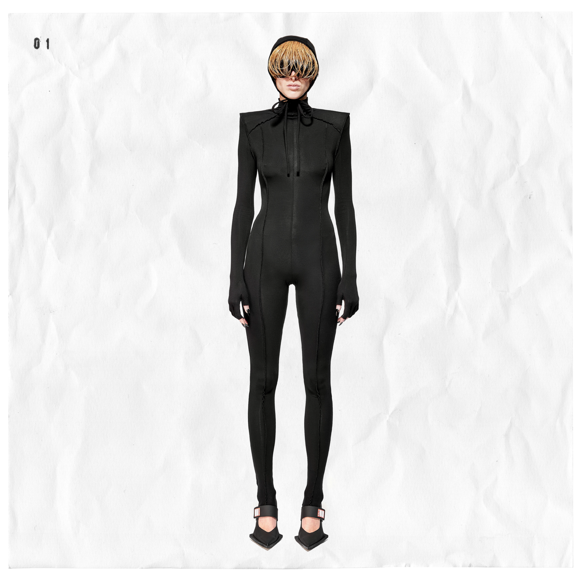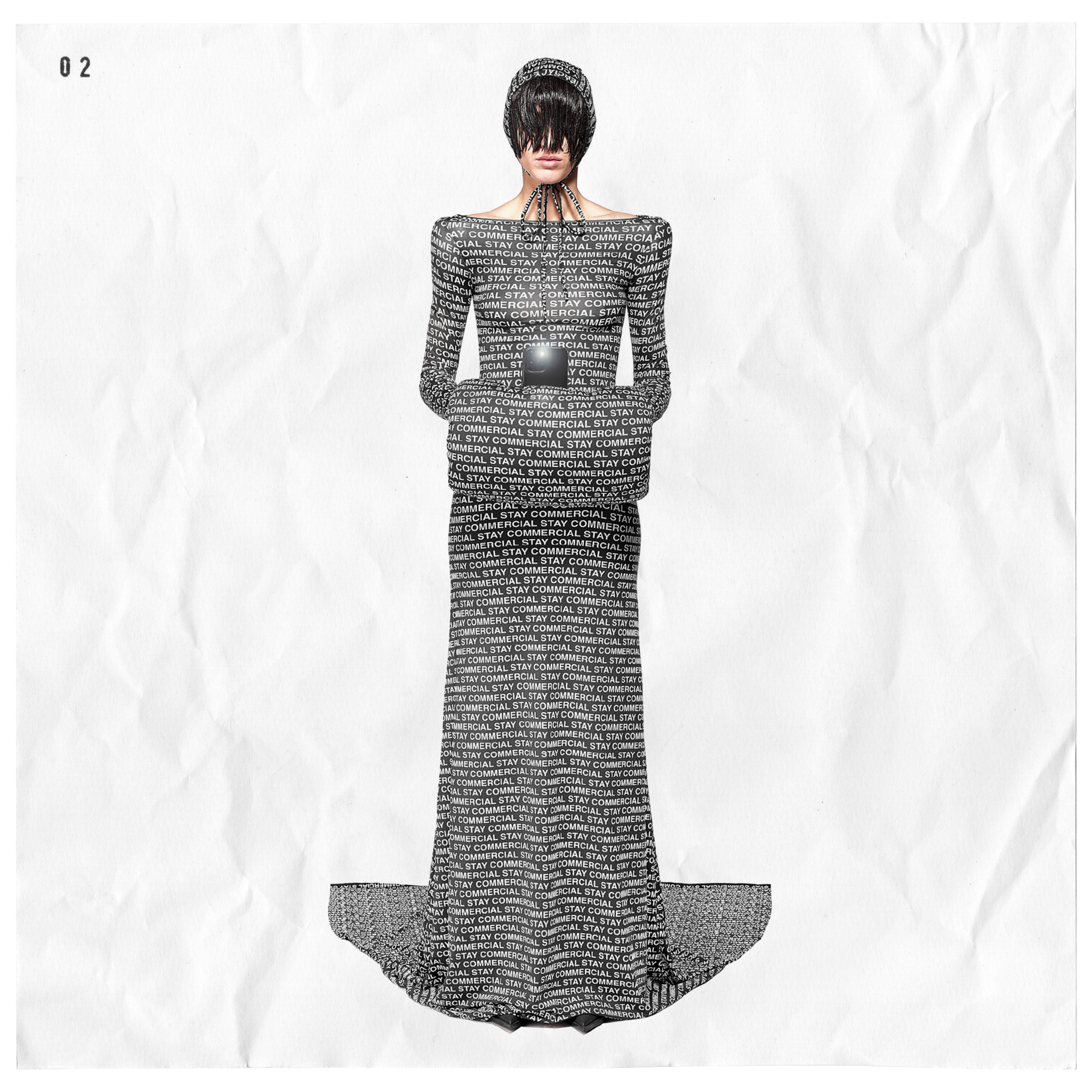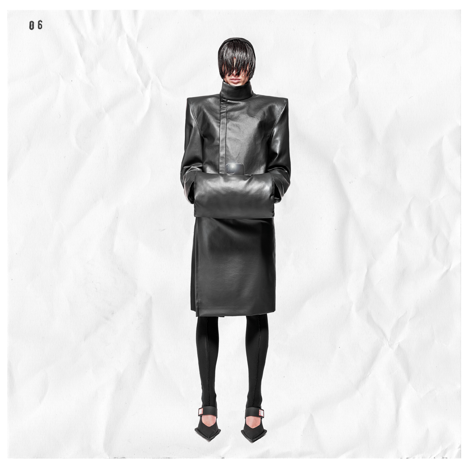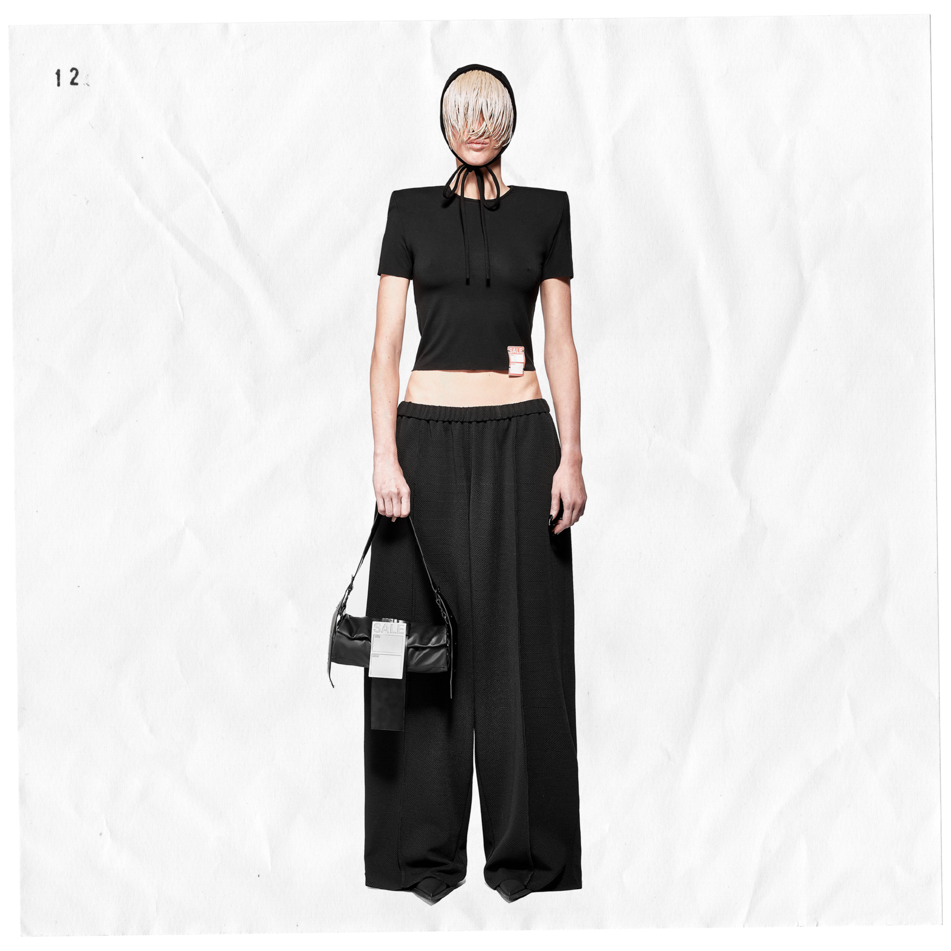 In the heart of Paris, British designer Betsy Johnson welcomed us into her showroom, which also serves as an intimate creative space for herself and her team. There, among the striking pieces of her new collection, we delved deep into the inspirations behind her brand, PRODUCTS, and the powerful messages she hopes to convey. As we entered, our attention was immediately drawn to a model, comfortably lounging on a latex-covered couch, wearing a tight black dress with a deep neckline, paired with an aristocratic hat, both emblazoned with the words 'STAY COMMERCIAL' in white. Her hands were tucked into an innovative handwarmer-phone-holder combination, the phone was sticking out with the flashlight on, which always gave it the effect that you were being recorded and essentially flipped the narrative. Conversing with Betsy Johnson means uncovering the story behind an elusive and enigmatic figure. Although she appears very reserved on social media, Betsy is a lively, energetic, and complex person. She was dressed in a pair of oversized Balenciaga track pants, visibly distressed at the back from the way her stiletto heels punctuate them with every step, in a sort of statement of nonchalance. Her hair was slicked back, half blonde and half black, almost symbolizing the division between nonconformity and the desire to be seen, an internal struggle that often emerges in her creations. Looking at the collection, sculpted shoulders stood out on many outfits. It felt natural to ask: 'Why the shoulder pads?'