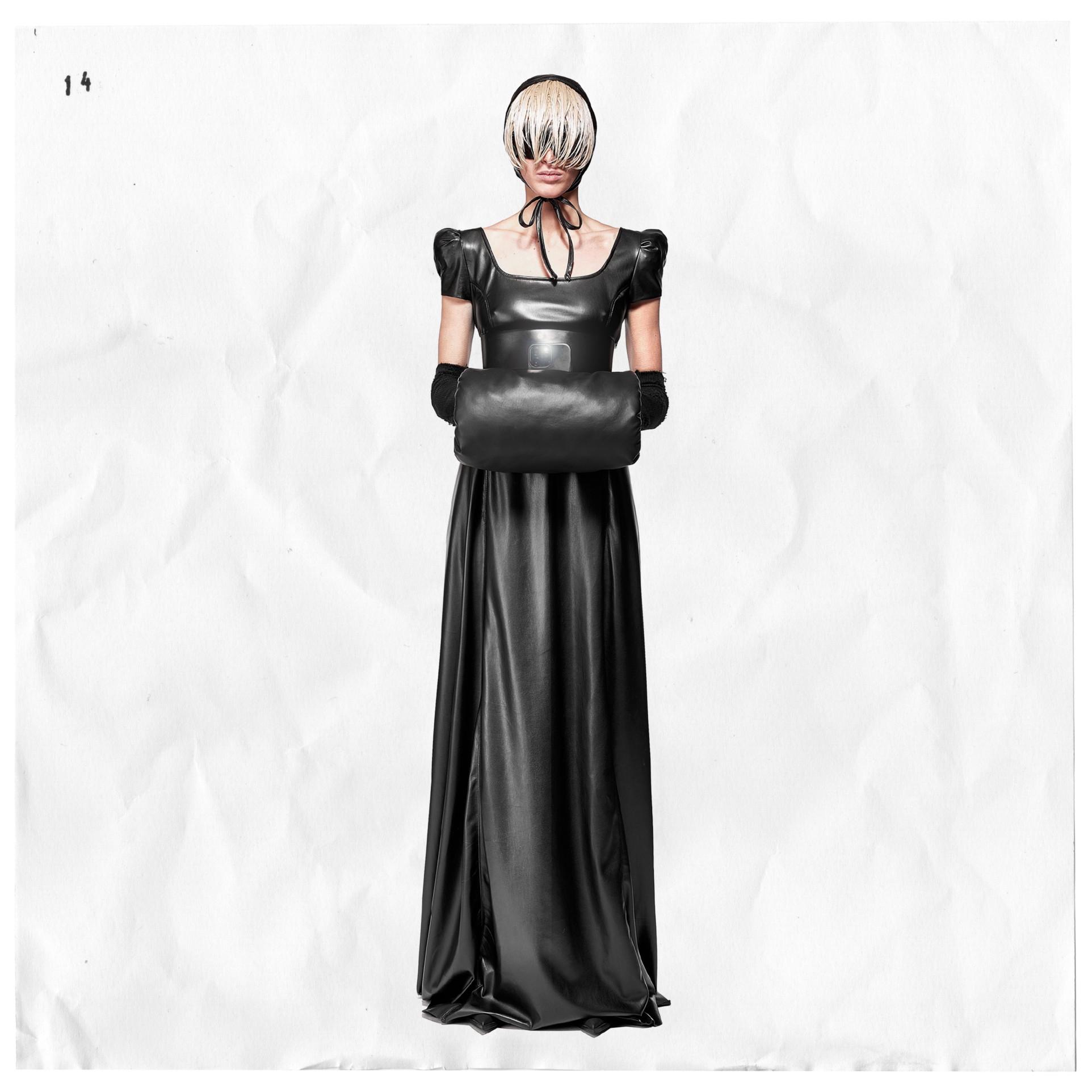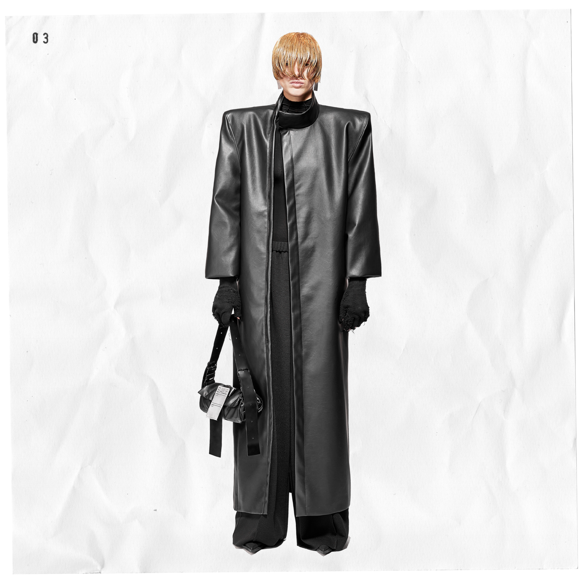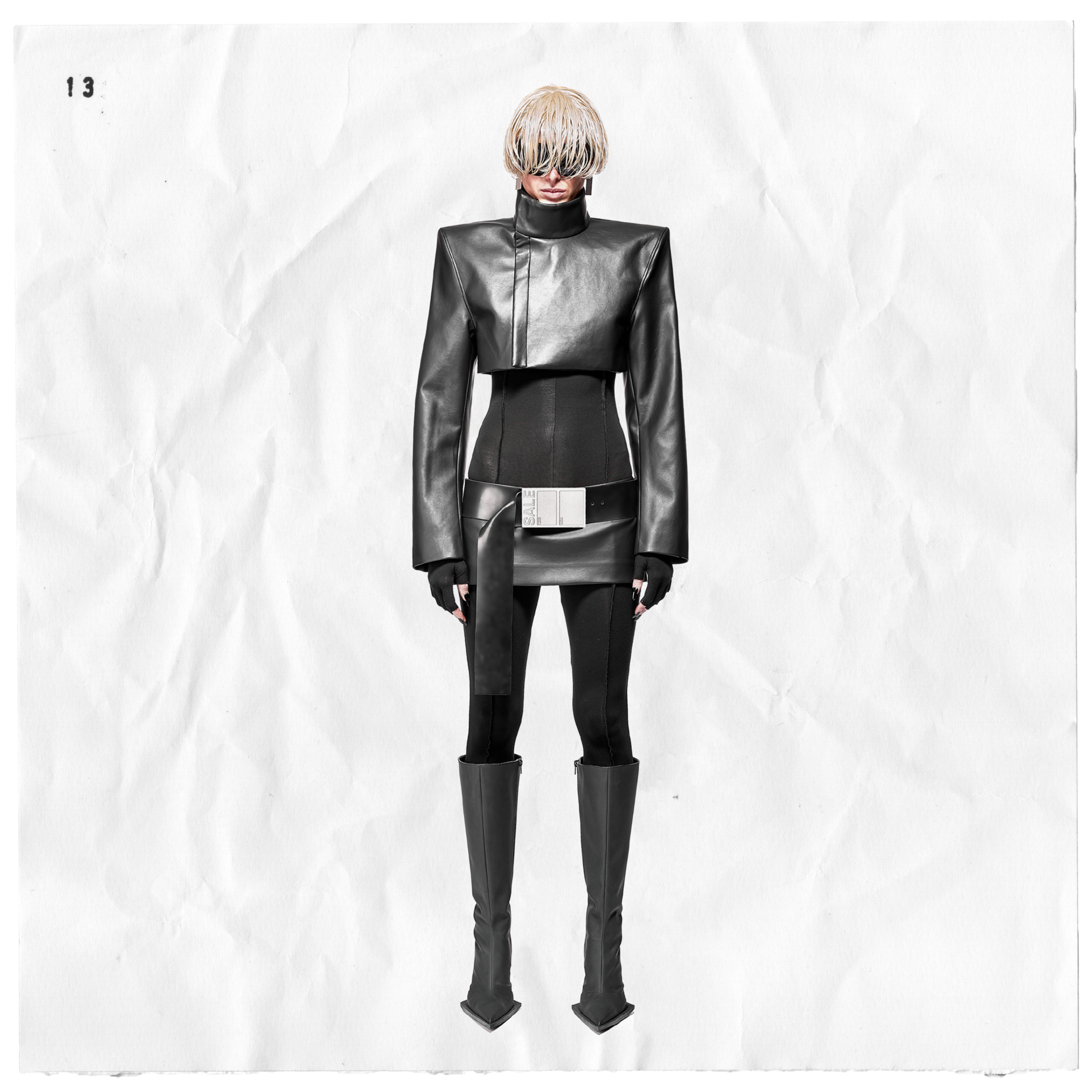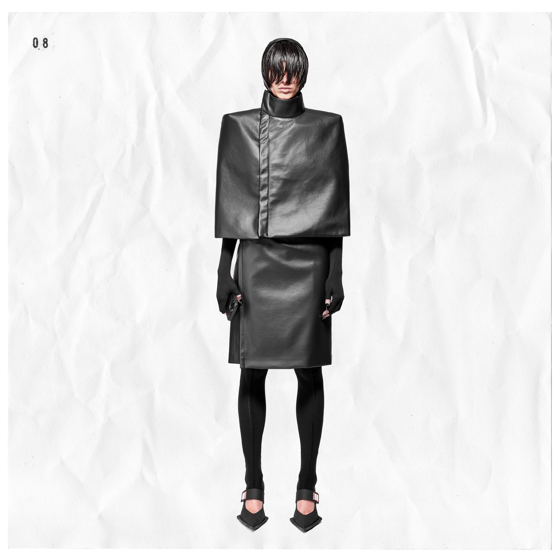 In the heart of Paris, British designer Betsy Johnson welcomed us into her showroom, which also serves as an intimate creative space for herself and her team. There, among the striking pieces of her new collection, we delved deep into the inspirations behind her brand, PRODUCTS, and the powerful messages she hopes to convey. As we entered, our attention was immediately drawn to a model, comfortably lounging on a latex-covered couch, wearing a tight black dress with a deep neckline, paired with an aristocratic hat, both emblazoned with the words 'STAY COMMERCIAL' in white. Her hands were tucked into an innovative handwarmer-phone-holder combination, the phone was sticking out with the flashlight on, which always gave it the effect that you were being recorded and essentially flipped the narrative. Conversing with Betsy Johnson means uncovering the story behind an elusive and enigmatic figure. Although she appears very reserved on social media, Betsy is a lively, energetic, and complex person. She was dressed in a pair of oversized Balenciaga track pants, visibly distressed at the back from the way her stiletto heels punctuate them with every step, in a sort of statement of nonchalance. Her hair was slicked back, half blonde and half black, almost symbolizing the division between nonconformity and the desire to be seen, an internal struggle that often emerges in her creations. Looking at the collection, sculpted shoulders stood out on many outfits. It felt natural to ask: 'Why the shoulder pads?'