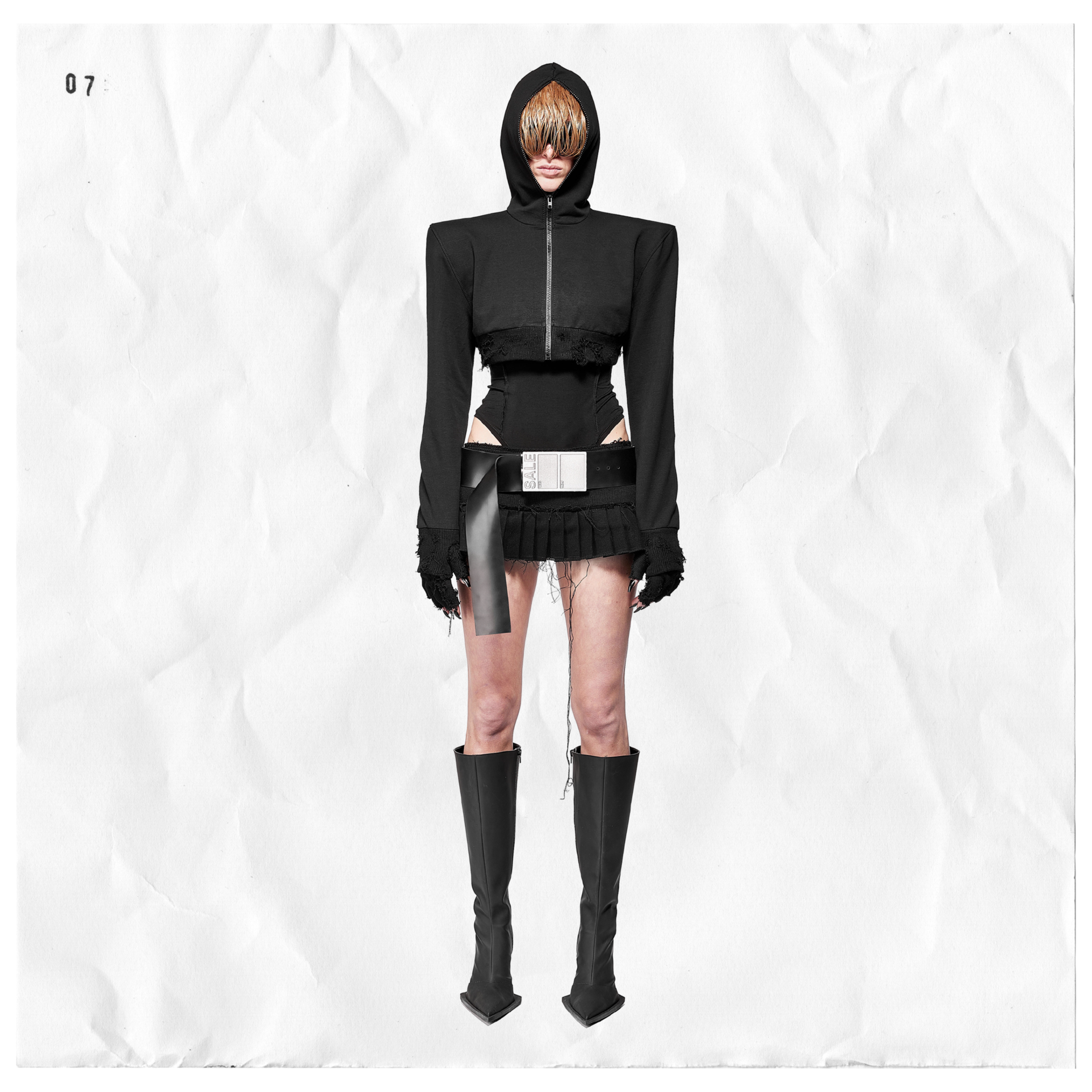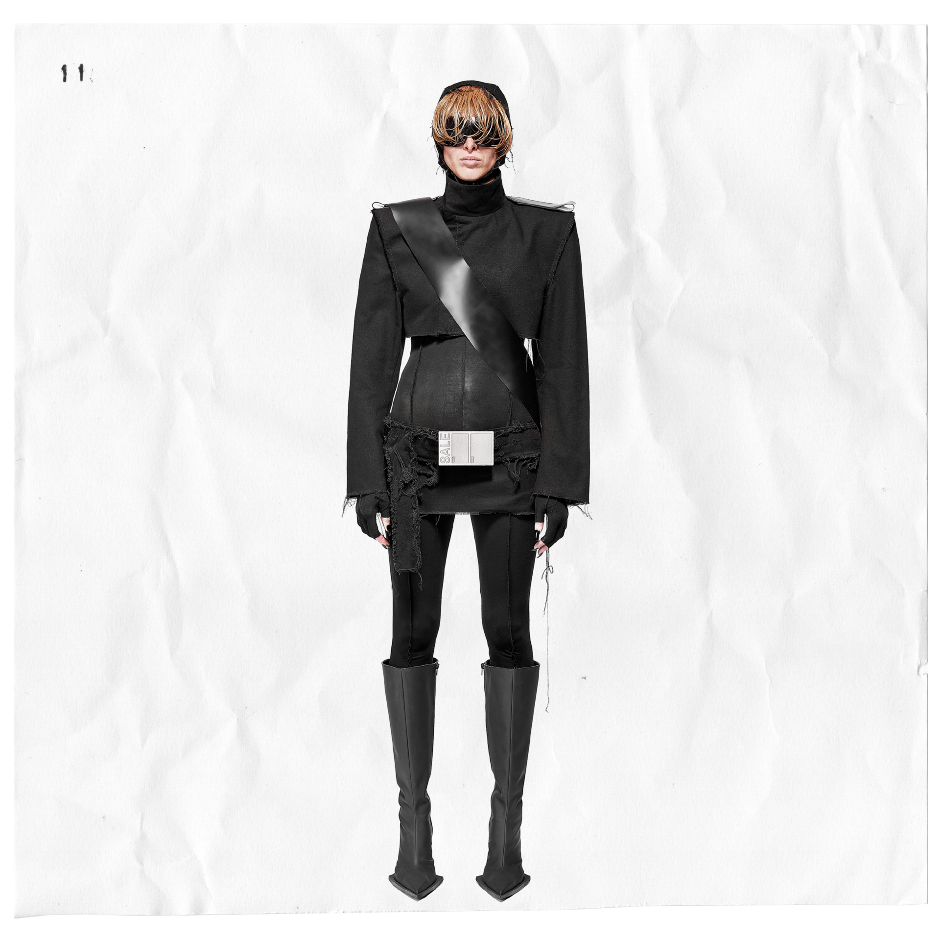 Betsy then asked us if we would like her model to change outfits to get a better sense of the pieces. She showed us an all-black outfit - a color that, along with its white and red counterparts, strongly resonates throughout the collection: tights with a central pleat fastened into stilettos with a 'SALE'-branded strap, a squared-shoulder suit top cut a little below the bust to reveal a corset fastened with a belt whose metal buckle once again spells 'SALE'. The filaments from the distressing hang loosely, giving it an almost studied yet disheveled look. As Betsy pranced around the model, adjusting some elements and adding the final touches, she revealed the deeper meaning of her collection. Born into a working-class family and witnessing her brother's struggles after leaving the army, Betsy challenges the industry's occasional fetishization of working-class and military culture. She aims to flip the script, ingeniously appropriating symbols of wealth and aristocracy in her designs—a tactic she brilliantly terms as 'reverse psychology in the process.' As our conversation reached its conclusion, Betsy shared her belief in the transformative power of internal struggle. Recalling her past activism, she said: «I used to wake up at 5 A.M. to camp outside slaughterhouses and protest every weekend just to realize nothing changed.' Today, her approach is nuanced: believing in the potency of working alongside power structures, she sees the merit in «playing the game' to bring about profound change from within.»