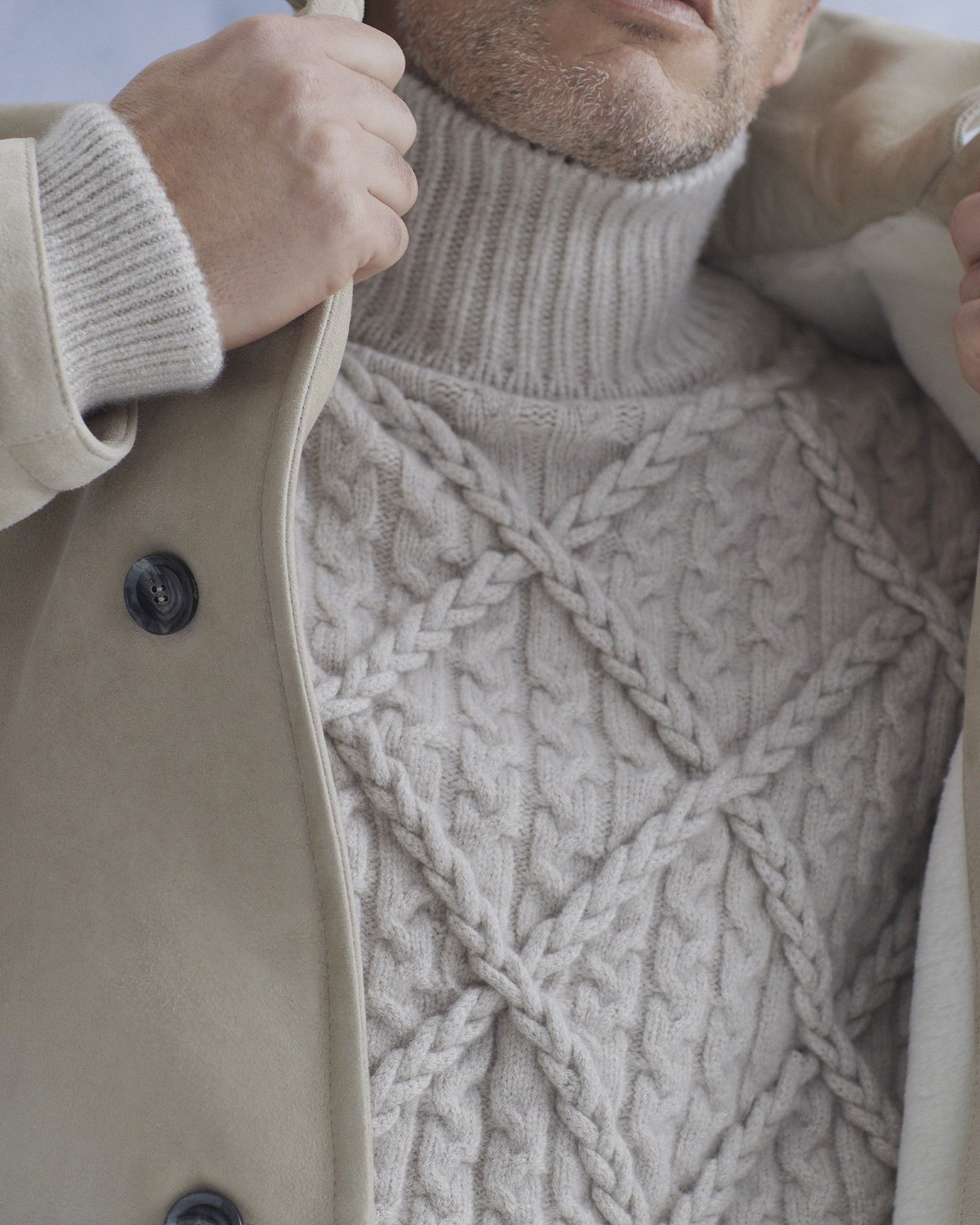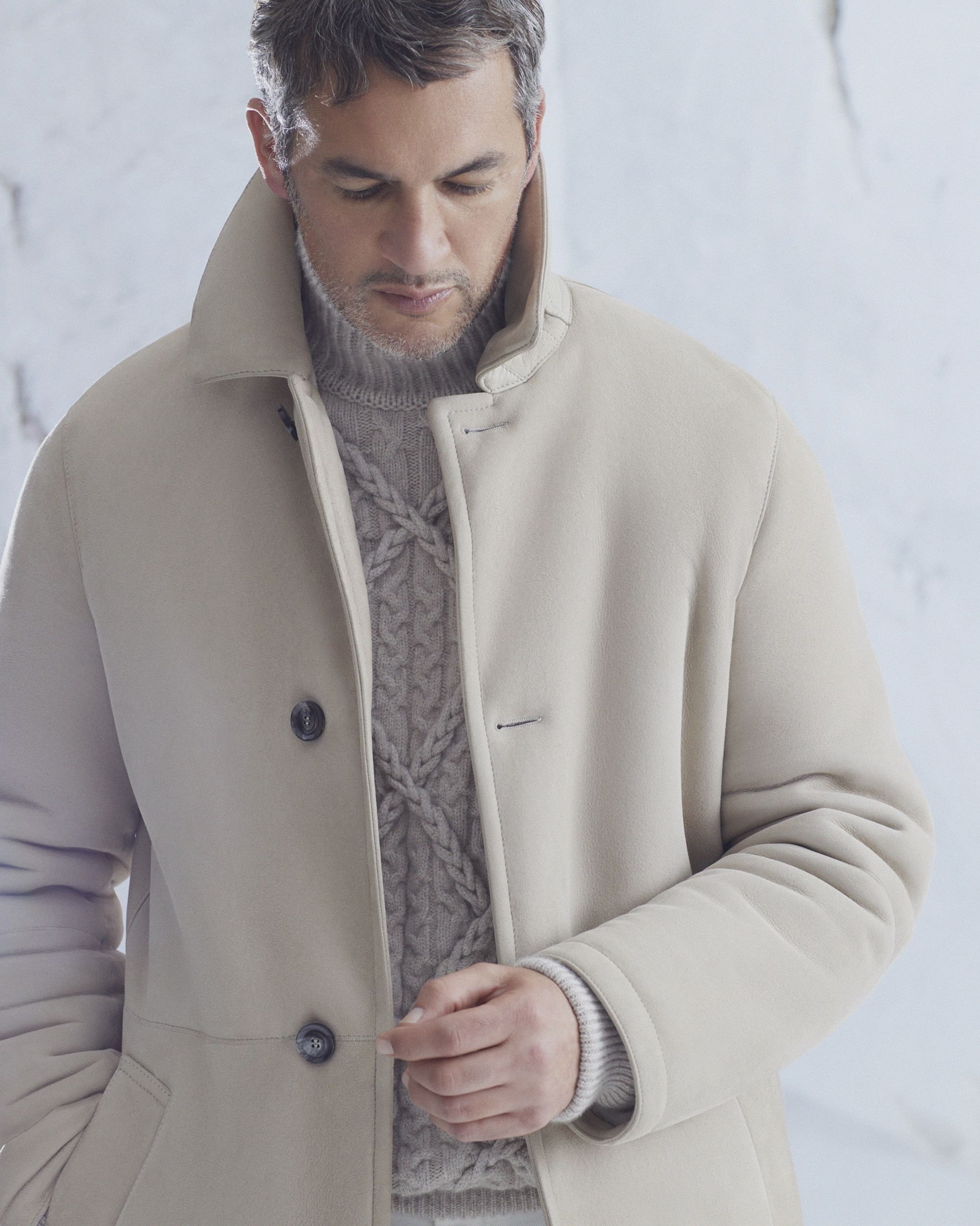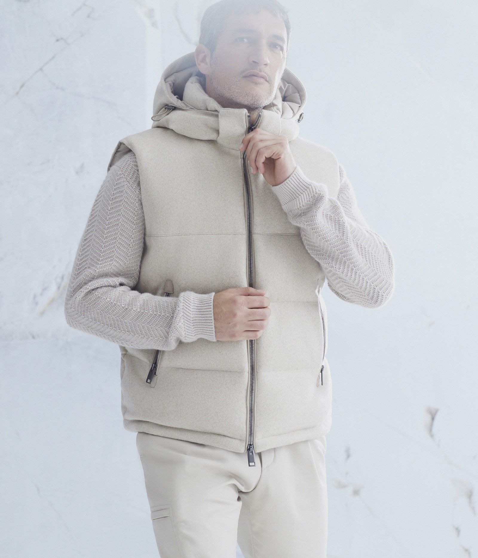 One of the flagship pieces of the collection is the iconic car coat, made of the softest shearling, which is a mainstay in Brioni's men's wardrobe. Another essential item is the Yangir double-breasted cashmere coat, constructed following the brand's traditional double-splittable construction. For those looking for practicality without sacrificing style, the down sleeve is an ideal choice, perfect for transitioning from day to evening with ease. The Plume suit in ivory silk gabardine offers an ultralight deconstructed jacket with a relaxed fit, ensuring comfort without compromising style. Knitwear in the collection is made of lightweight, mid-weight cashmere, known for its extreme softness. At times, cashmere is combined with silk to offer an even warmer effect, perfect for facing the coldest days with elegance. Beyond the warmer garments, the capsule includes leisure pants and denim in cotton and wool. Accessories, with attention to detail and handmade, complete the look.
