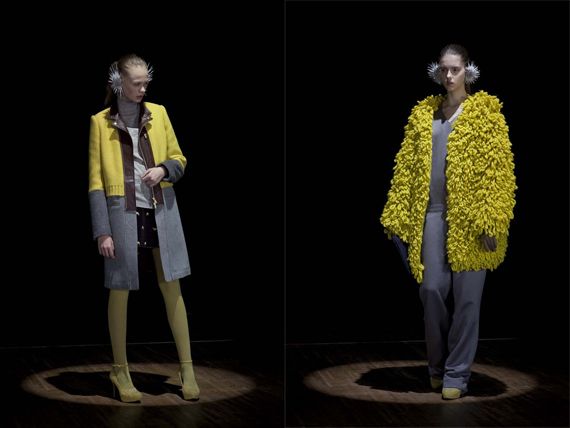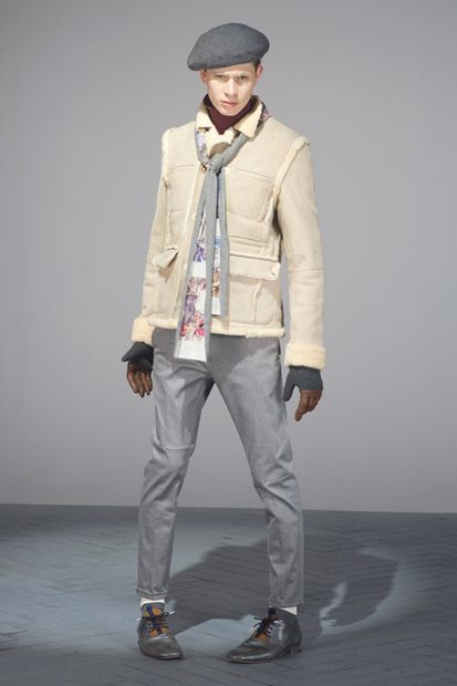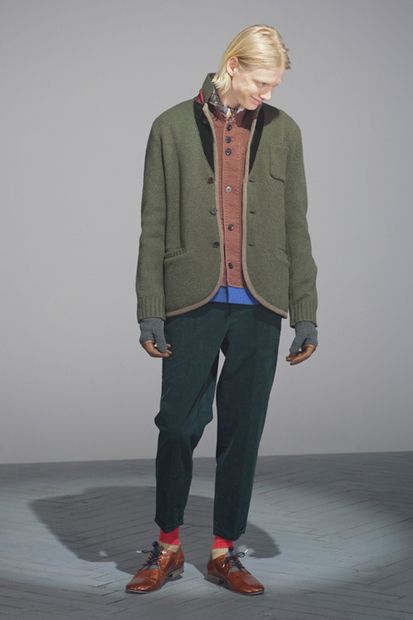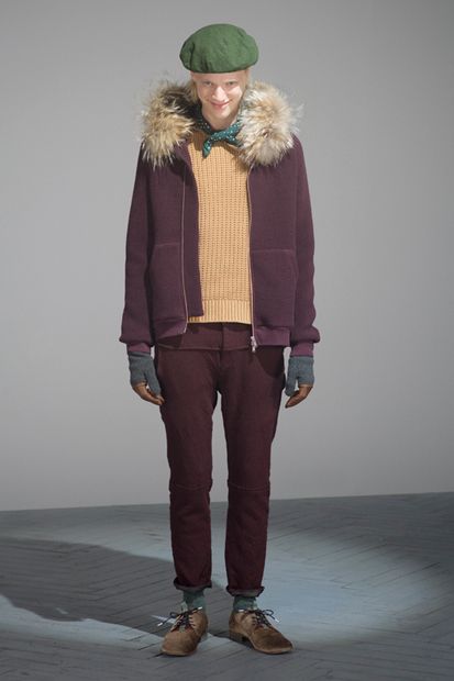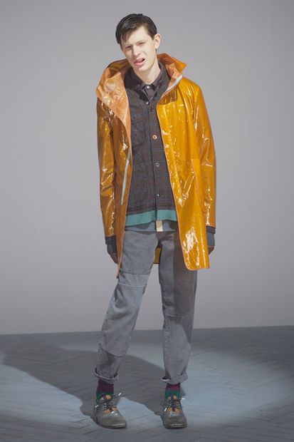 I modelli, che indossano i capi di Mr Takahashi, sembrano studenti di college che mixano colori brillanti, viola, giallo, blu elettrico, con un basico grigio. Affrontano la stagione fredda con la vivacità e la sfrontatezza della loro età, avvolti in caldi cappotti, giacche e montgomery, pullover e cardigan, tutti in lana, tessuto principe della collezione.